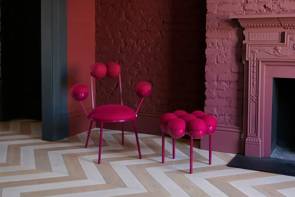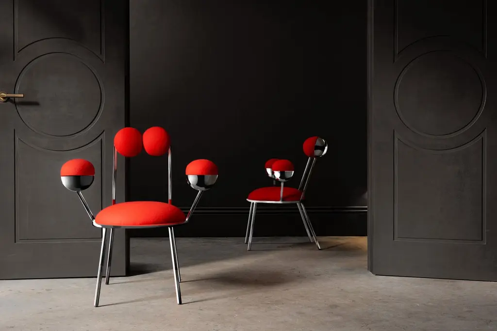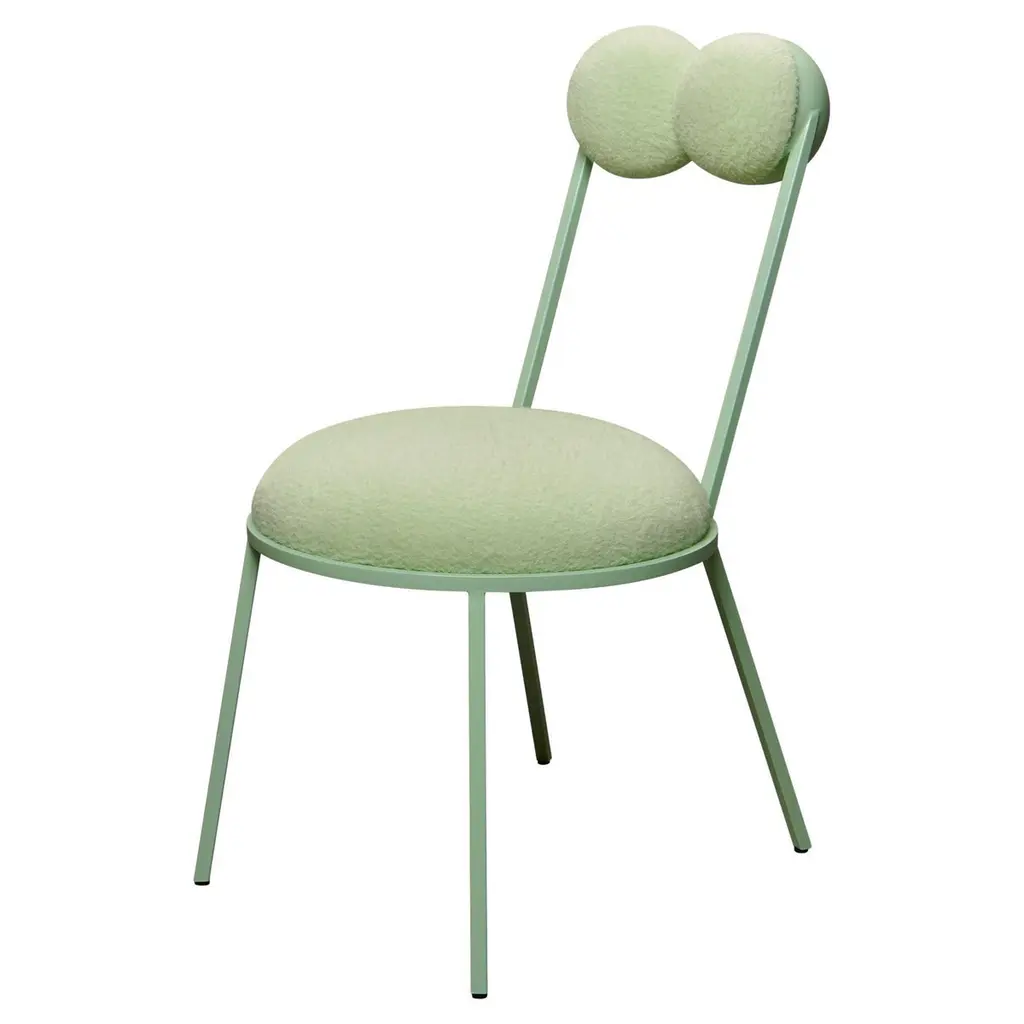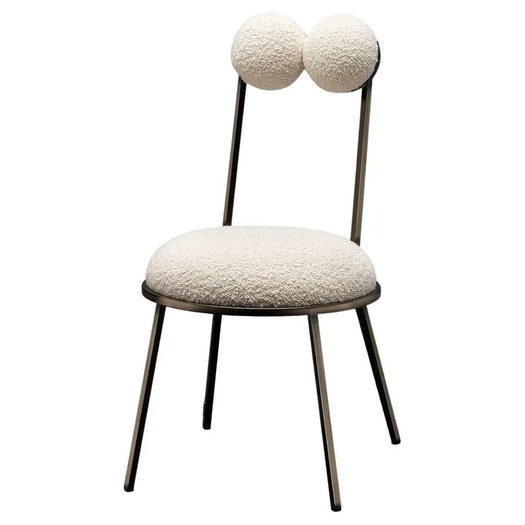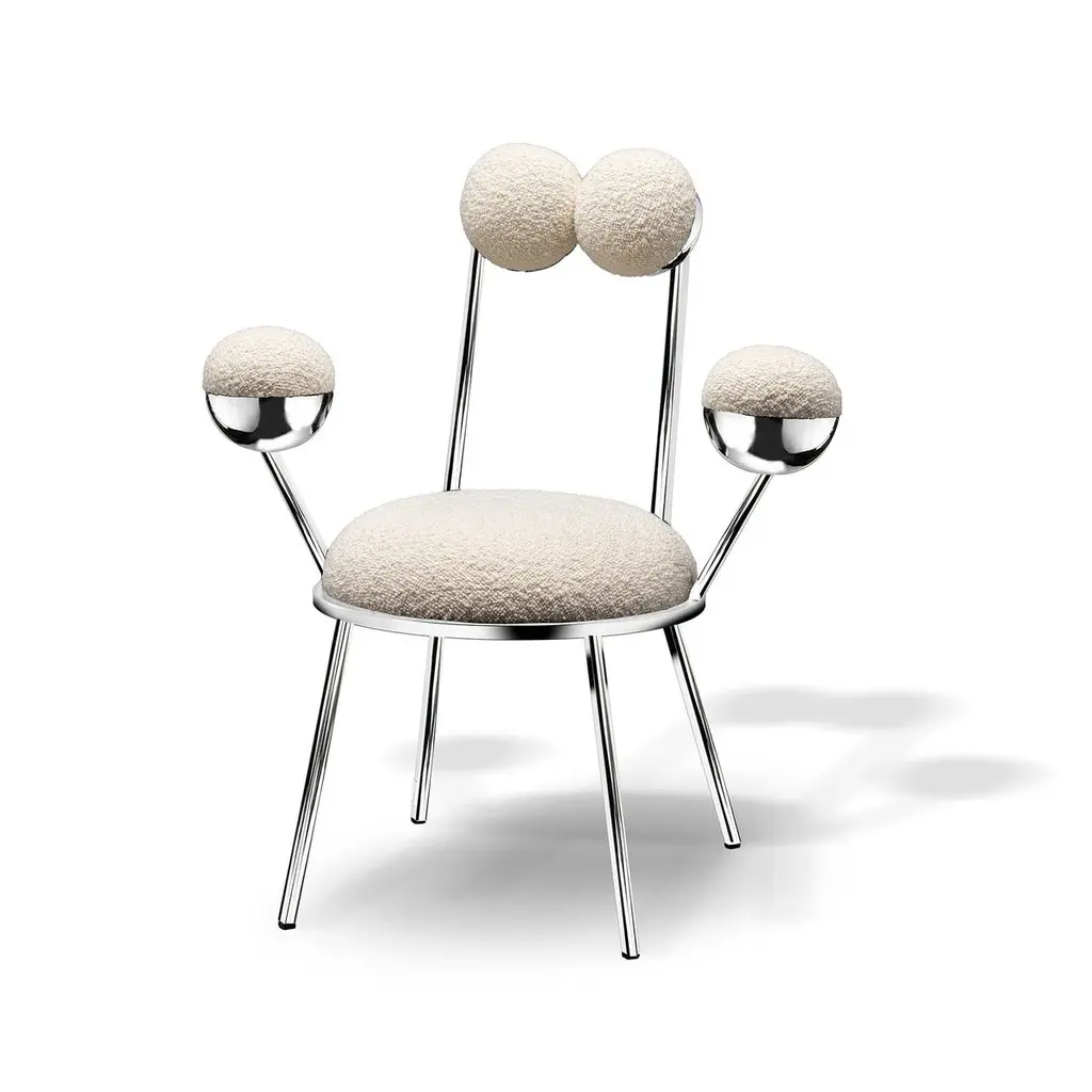 Trevor dining chair makes a perfect accompaniment for the tea room, its round spheres forming backrest and armrests, floating on thin metal rods, just like bonbons speared on cocktail sticks. Almost frog-like in its appearance, the chairs take the form of a friendly creature with a big mouth and bug-eyes. The chairs are made of chrome finish steel, with soft upholstered seat and backrest and are available with and without armrests.Each piece of furniture is individually numbered and comes with a signed “Certificate of Authenticity” to prove that it is Bohinc Studio original.Material: Chrome finish steel frame with bouclé fabricDimensions: 600 x 750 x H 860 mm.