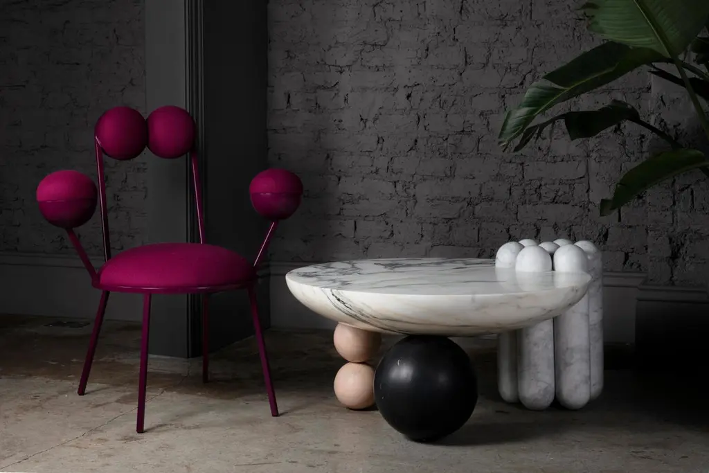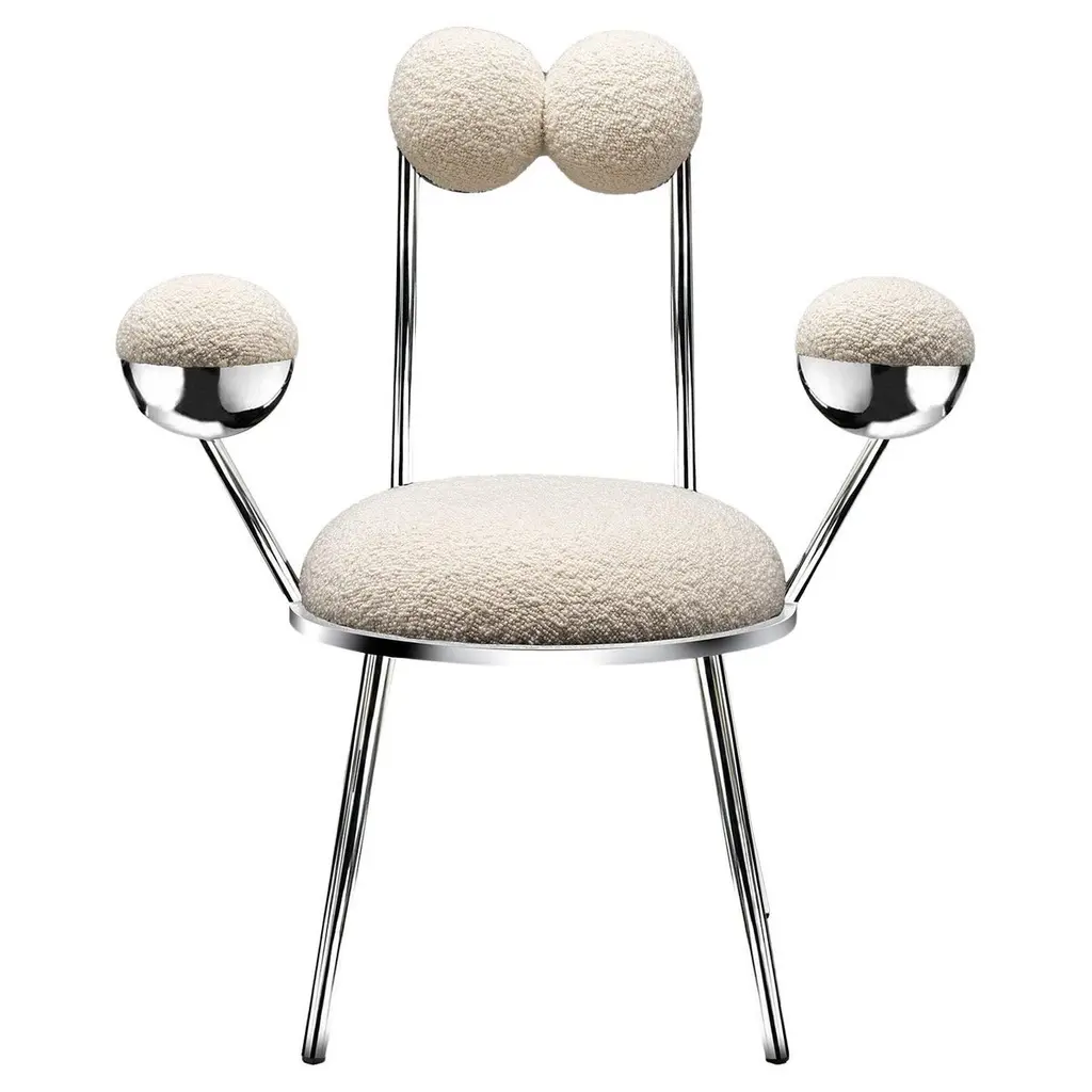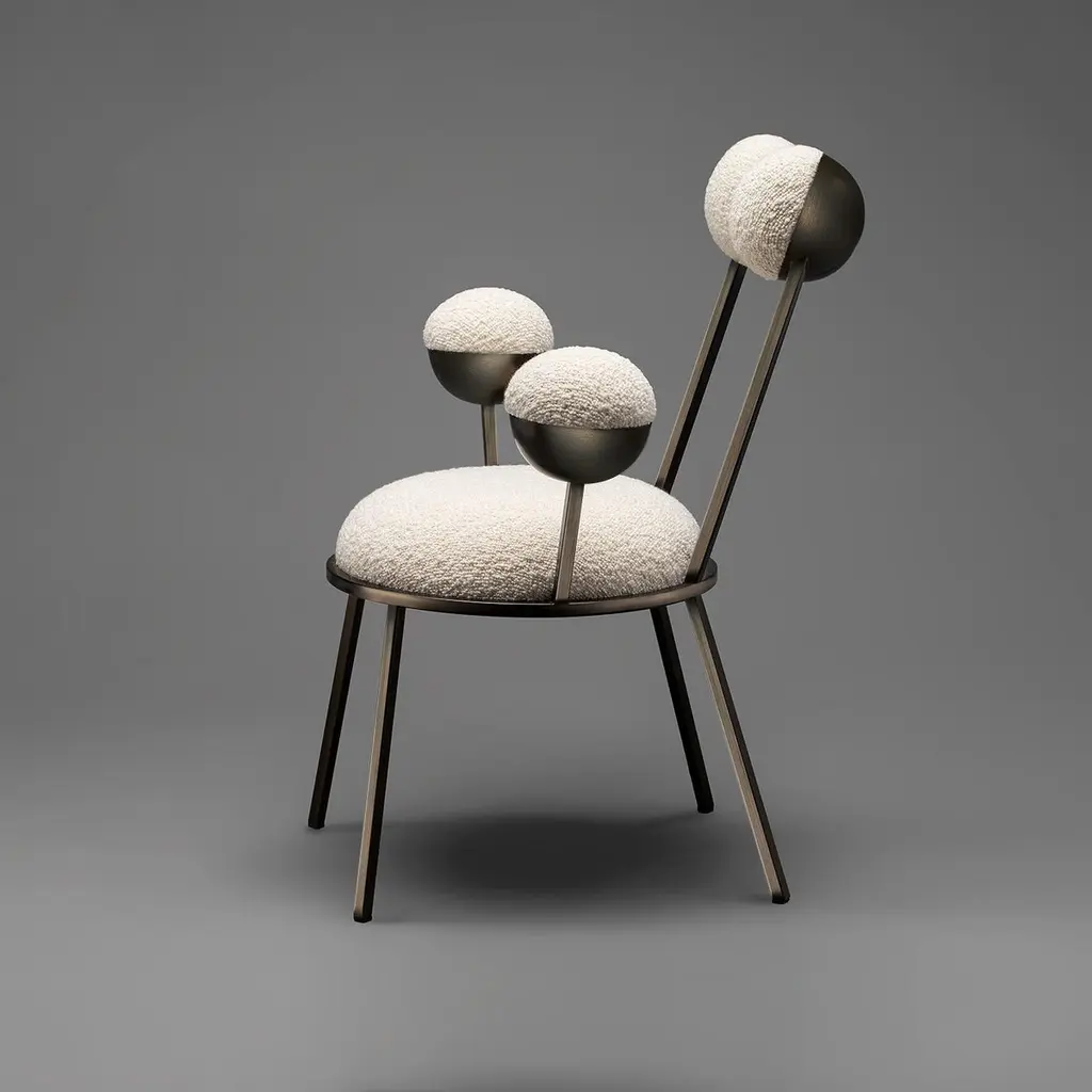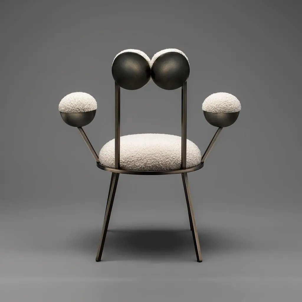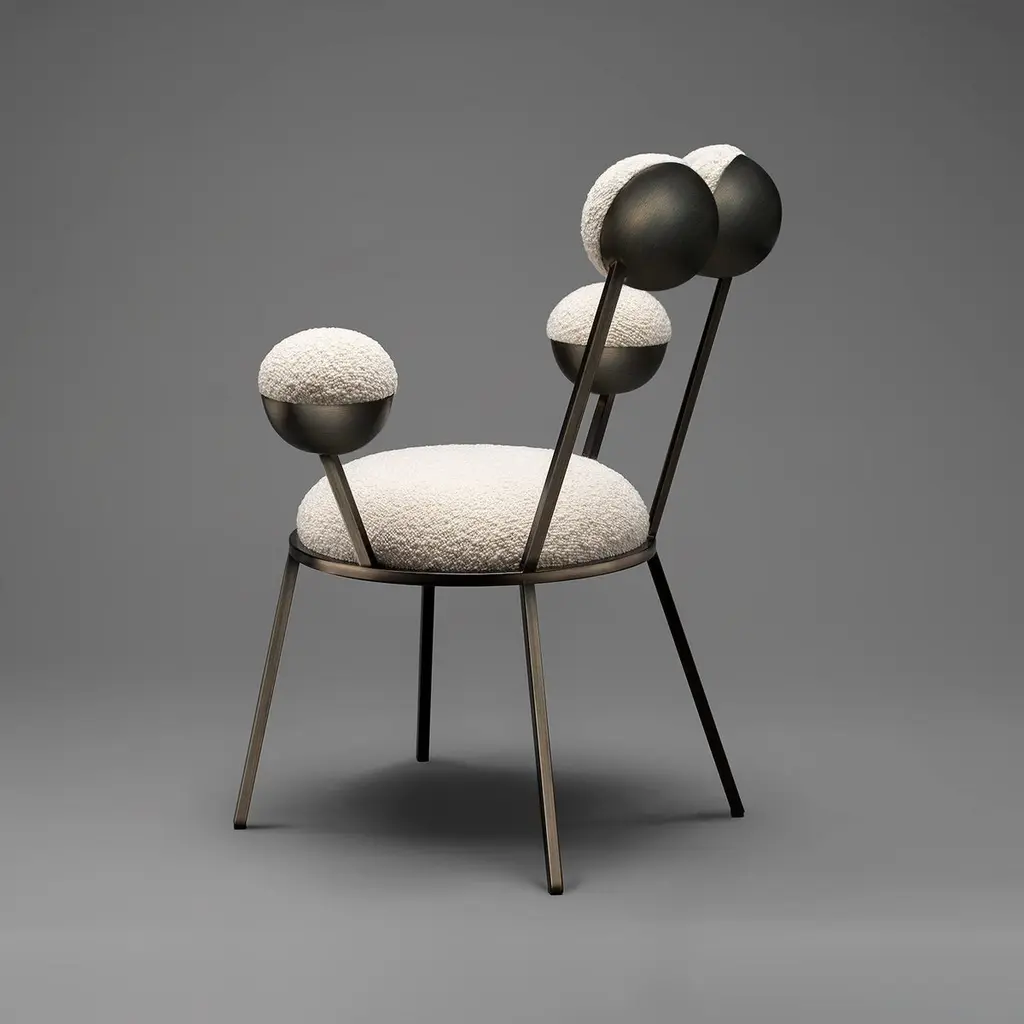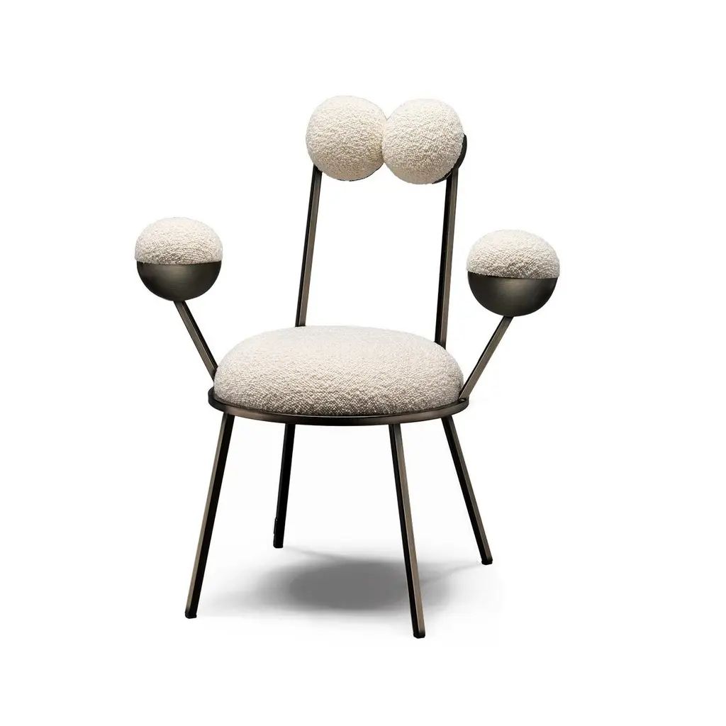 Trevor dining chair makes a perfect accompaniment for the tea room, its round spheres forming backrest and armrests, floating on thin metal rods, just like bonbons speared on cocktail sticks. Almost frog-like in its appearance, the chairs take the form of a friendly creature with a big mouth and bug-eyes. The chairs are made of powder coated steel, with soft upholstered seat and backrest and are available with and without armrests.Each piece of furniture is individually numbered and comes with a signed “Certificate of Authenticity” to prove that it is Bohinc Studio original.Material: Bronze oxidised steel frame with bouclé fabricDimensions: 600 x 750 x H 860 mm.