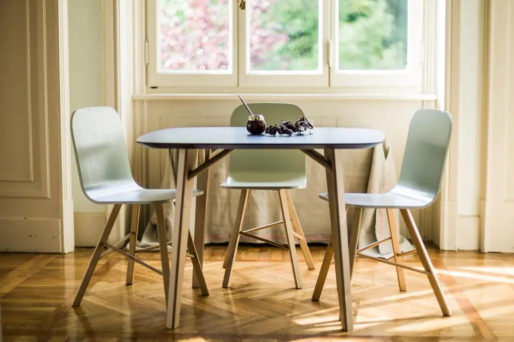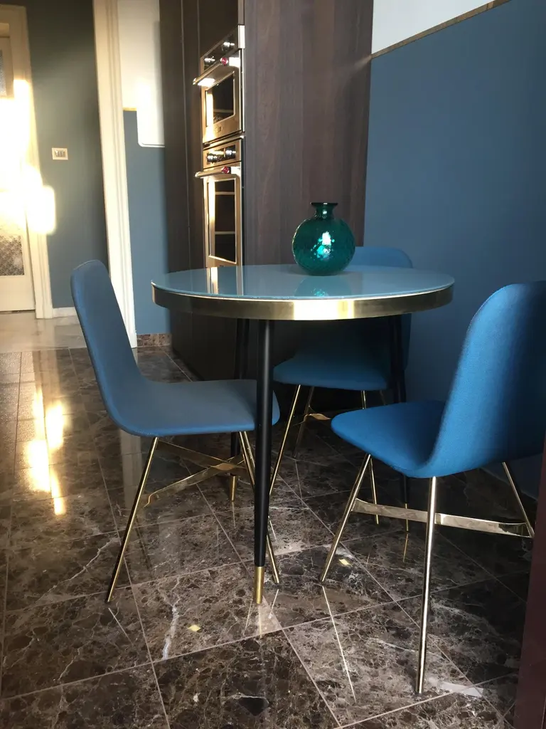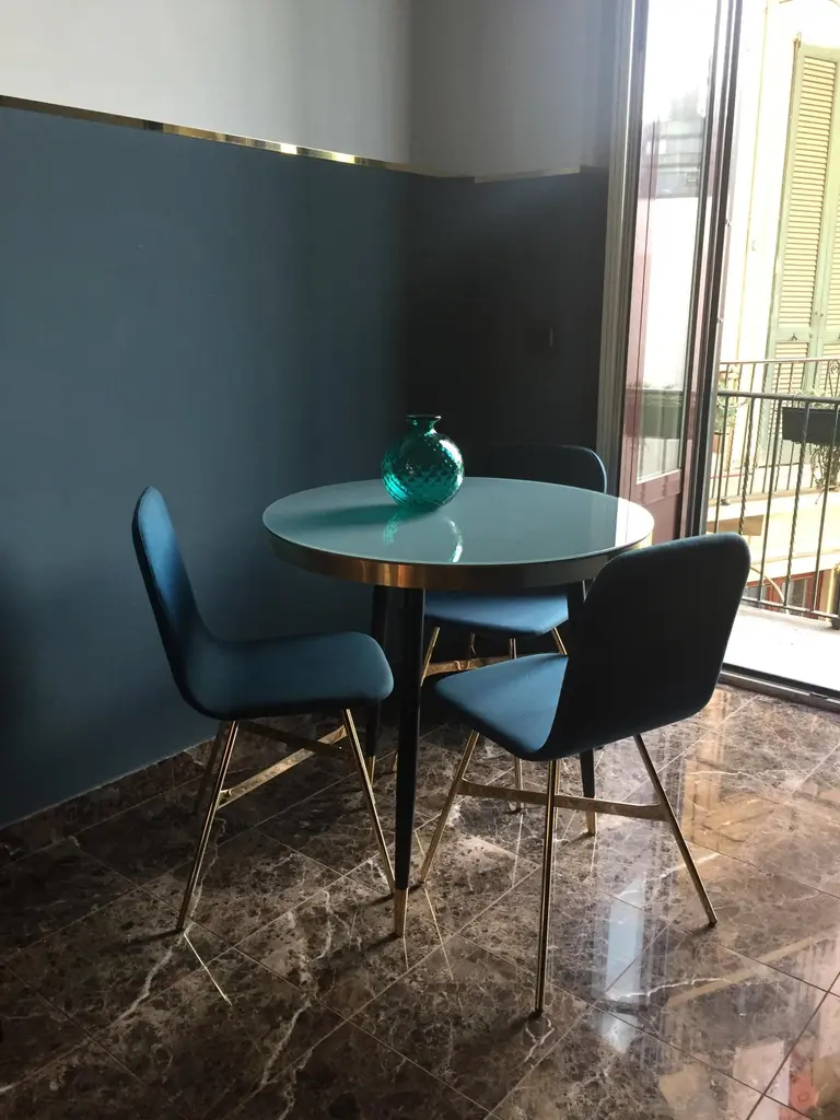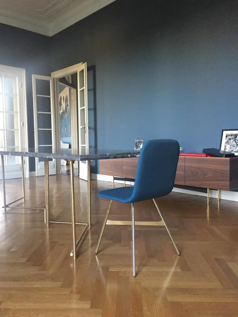 A simple but very elegant chair inspired to graphic art and combining the precious metal used for the legs with the simple and hieratic line of the seat, suggesting interesting and dynamic effects, displayed around a table.. The seat is a plywood shell veneered in natural oak or lacquered white or black; it is also available upholstered in different fabric or leather variations. Fabric lining: C.O.M fabric); cotton, mix cotton-linen, felt; wool, velvet, leather, natural or black.Legs in metal in three optional finishings: Black painted, gold, black chrome.It is also possible to have on the same seat wooden legs in solid oak.
