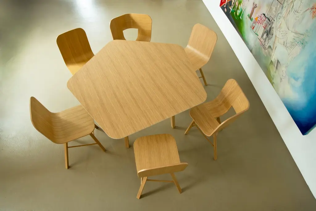 Essential and elegant chair with a bent plywood shell, and four iconic legs with triangular shape in solid oak, joined by transversal wooden bars.The shel is available in two different variations: Wood veneered (natural oak or stained open pore in the colors black, white, red, coffee, in in natural oak or stained open pore black, white, red), or upholstered.(Fabric lining: C.O.M fabric; cotton, mix cotton-linen; felt, wool; velvet ).Tria simple is born from the rib of Tria chair and following its curve for unusual and new compositions. Combined with Tria Wood suggests interesting and dynamic effects , that can be displayed around a table or arrive to get the effect of a bench.Legs can follows the finishing of the shel or upon request remain in natural oak.Available also for the same model a metal base in gold, black chrome or black lacquered