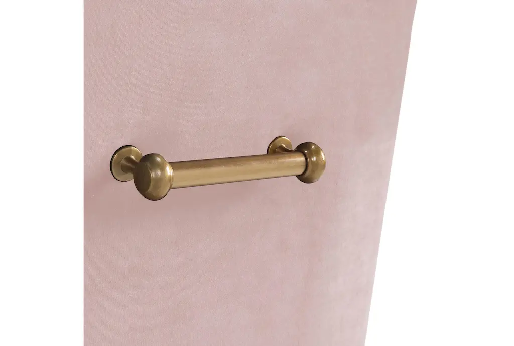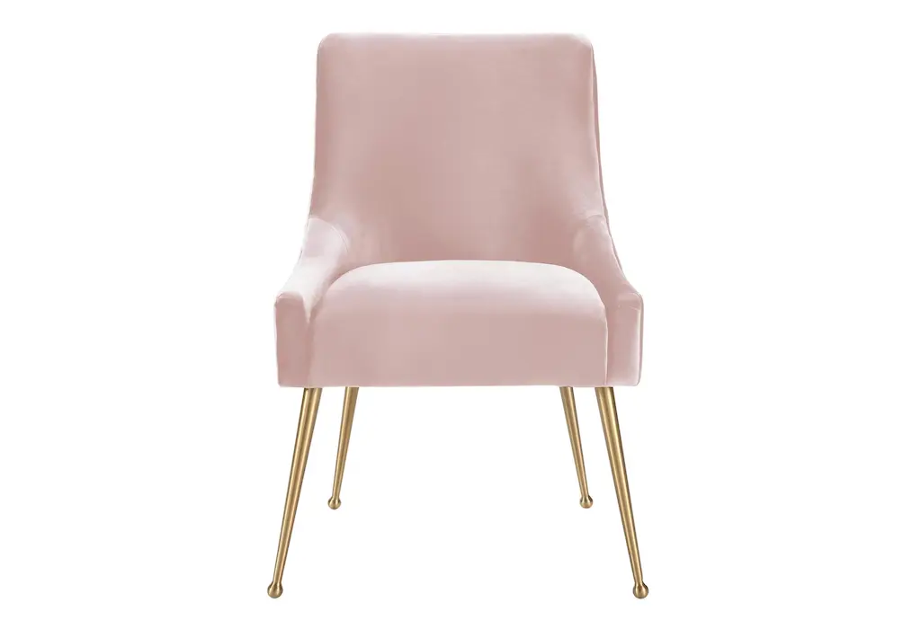 The Trix Blush Velvet Dining Chair is a modern armless chair made of fabric and metal, perfect for the dining room. This handmade chair features a durable yet sumptuous velvet upholstery in a beautiful blush pink color and fab gold stainless steel legs, with an elegantly curved design that adds a touch of sophistication to any dining space.