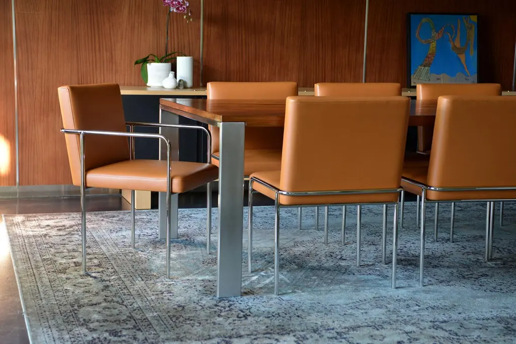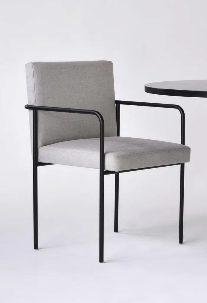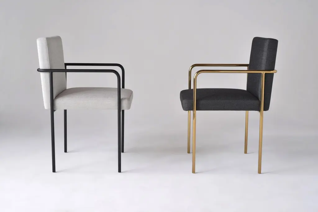 Trolley Side Chair With Arms by Phase DesignDimensions: D 59.7 x W 55.2 x H 81.3 cm. Materials: Upholstery and powder-coated metal.Fabric price not included.Solid steel bar available in a smoked brass, polished chrome, burnt copper, or powder coat finish with upholstered top. Powder coat finishes are available in custom colors. Upholstery may be sourced in Customer Own Material (COM), Customer Own Leather (COL), or in Phase Design's suggested fabrics and leathers. Prices may vary. Please contact us.The chair helps create a polished and purposive environment, while in harmony with the tailored look of its Trolley seating family members. This composed chair is available with or without arms. Autodidact award-winning designer Reza Feiz has always been drawn to the strength in simplicity. Lured to Southern California by its inventive, creative spirit, he quickly discovered his true calling among the vast community of creators and artisans whose skills and ingenuity expertly transform imagination into reality.Inspired by Los Angeles’ iconic landscape and the compelling beauty of the places and spaces he encountered, he envisioned furniture, lighting and tabletop accessories, fabricating them from contemporary materials with the help of a tightly knit coterie of craftspeople.The resulting restrained yet revolutionary pieces have garnered enthusiasm from an international audience.He’s been lauded as “An American designer who influences world design”, a “Style Pioneer” and “One of a group of select young designers who represent the leading edge of discovery in design.” Architectural Digest’s Mayer Rus noted that his “wide-ranging collections make a strong case for the enduring appeal of restrained modern design.” Surface Magazine raved that he “imbues his work with a 21st-century edge. His astute sense of restraint keeps the designs relevant in a constantly evolving industry, without needing to subscribe to trends.”“Reza Feiz imbues his work with a 21st-century edge. His astute sense of restraint keeps the designs relevant in a constantly evolving industry, without needing to subscribe to trends.”