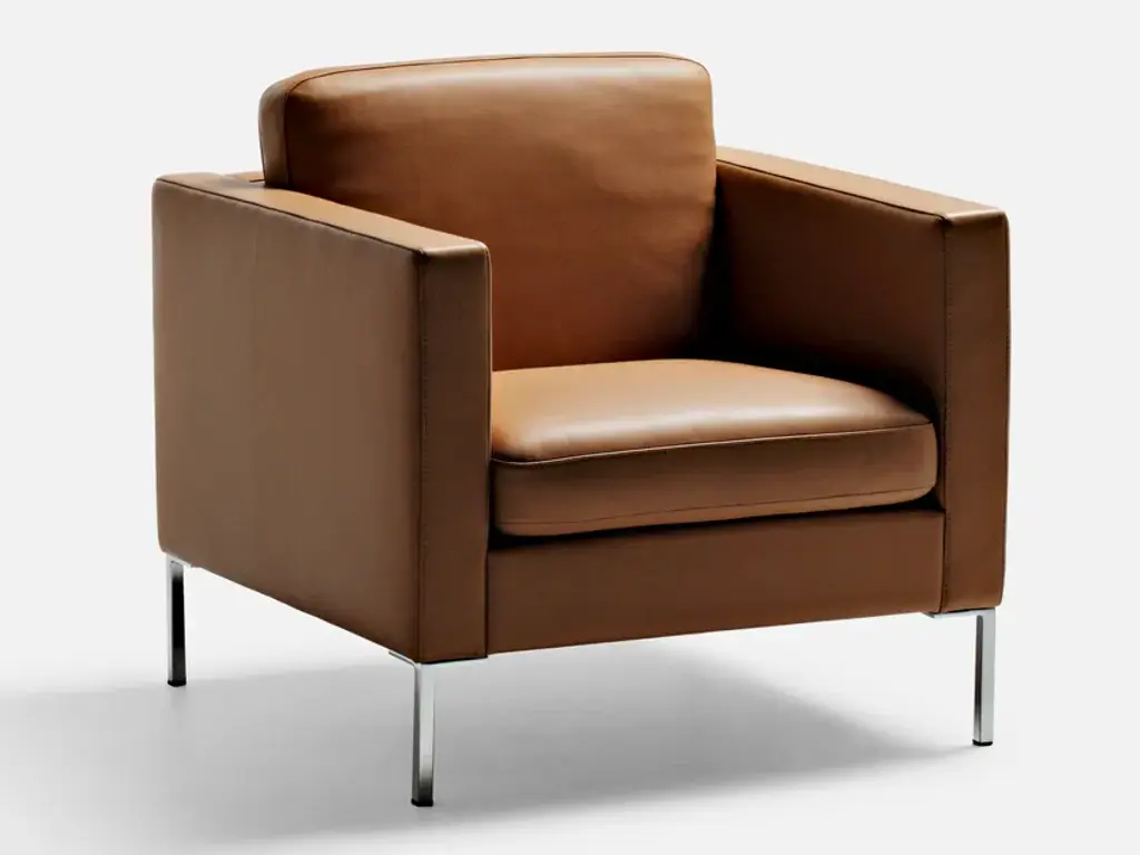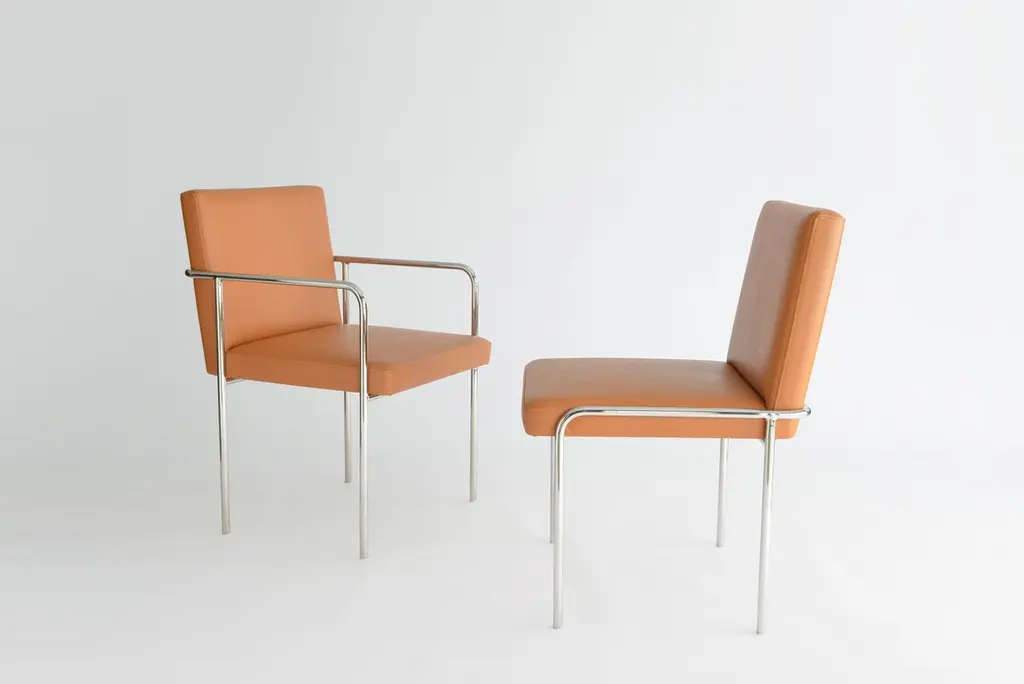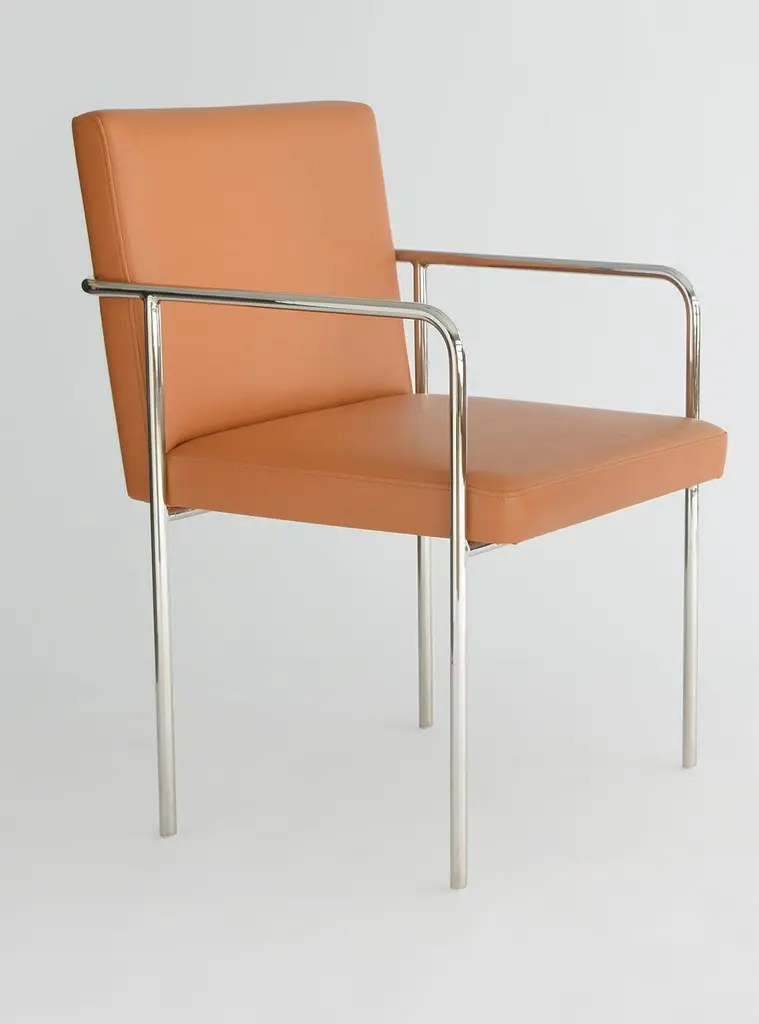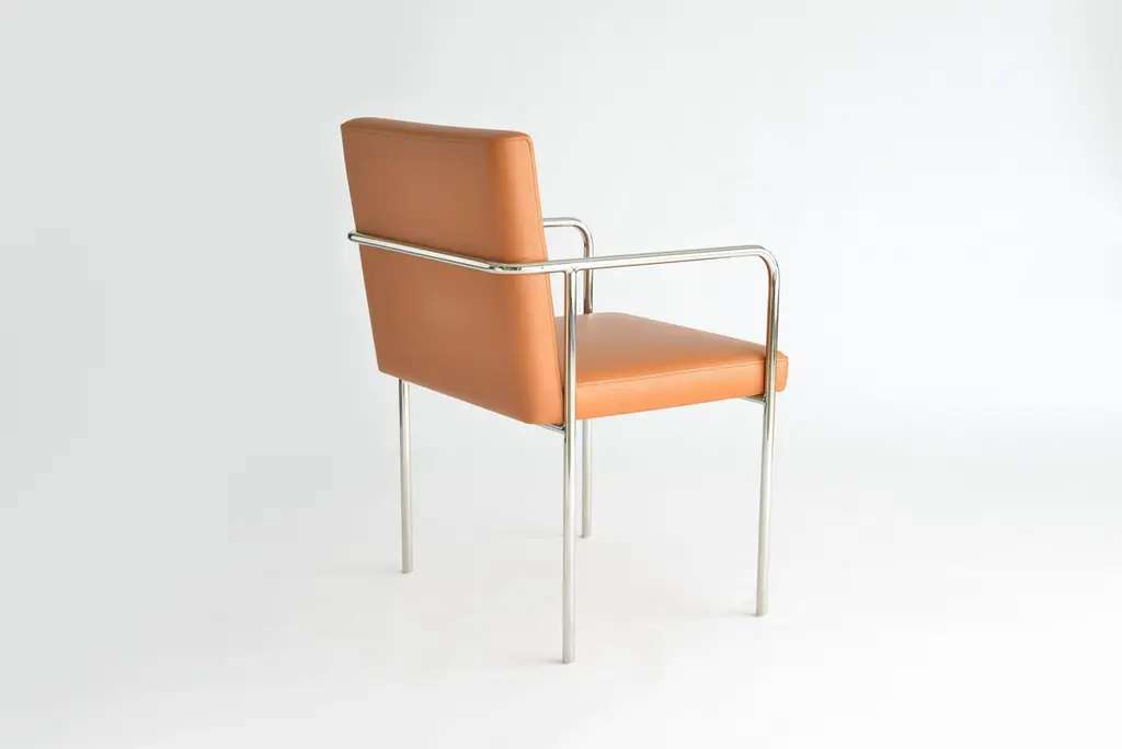 Trolley Side Chair With Arms by Phase DesignDimensions: D 59.7 x W 55.2 x H 81.3 cm. Materials: Leather and polished chrome.Fabric price not included.Solid steel bar available in a smoked brass, polished chrome, burnt copper, or powder coat finish with upholstered top. Powder coat finishes are available in custom colors. Upholstery may be sourced in Customer Own Material (COM), Customer Own Leather (COL), or in Phase Design's suggested fabrics and leathers. Prices may vary. Please contact us.The chair helps create a polished and purposive environment, while in harmony with the tailored look of its Trolley seating family members. This composed chair is available with or without arms. Autodidact award-winning designer Reza Feiz has always been drawn to the strength in simplicity. Lured to Southern California by its inventive, creative spirit, he quickly discovered his true calling among the vast community of creators and artisans whose skills and ingenuity expertly transform imagination into reality.Inspired by Los Angeles’ iconic landscape and the compelling beauty of the places and spaces he encountered, he envisioned furniture, lighting and tabletop accessories, fabricating them from contemporary materials with the help of a tightly knit coterie of craftspeople.The resulting restrained yet revolutionary pieces have garnered enthusiasm from an international audience.He’s been lauded as “An American designer who influences world design”, a “Style Pioneer” and “One of a group of select young designers who represent the leading edge of discovery in design.” Architectural Digest’s Mayer Rus noted that his “wide-ranging collections make a strong case for the enduring appeal of restrained modern design.” Surface Magazine raved that he “imbues his work with a 21st-century edge. His astute sense of restraint keeps the designs relevant in a constantly evolving industry, without needing to subscribe to trends.”“Reza Feiz imbues his work with a 21st-century edge. His astute sense of restraint keeps the designs relevant in a constantly evolving industry, without needing to subscribe to trends.”