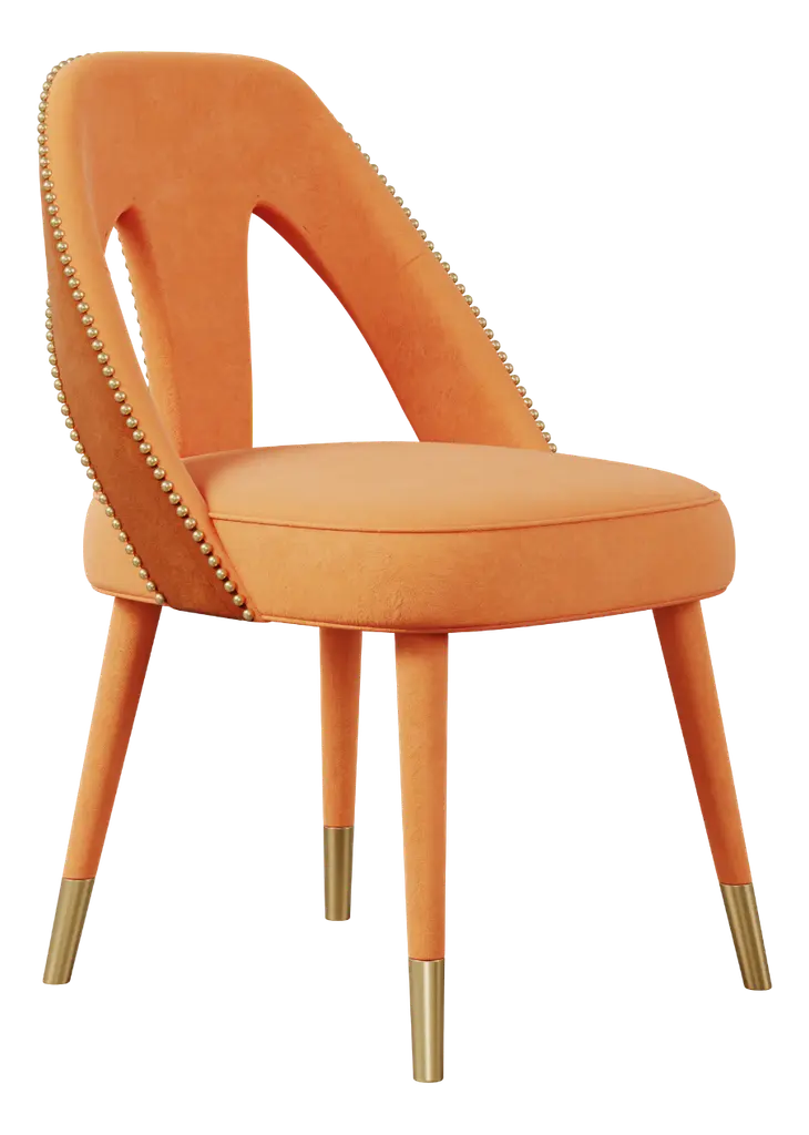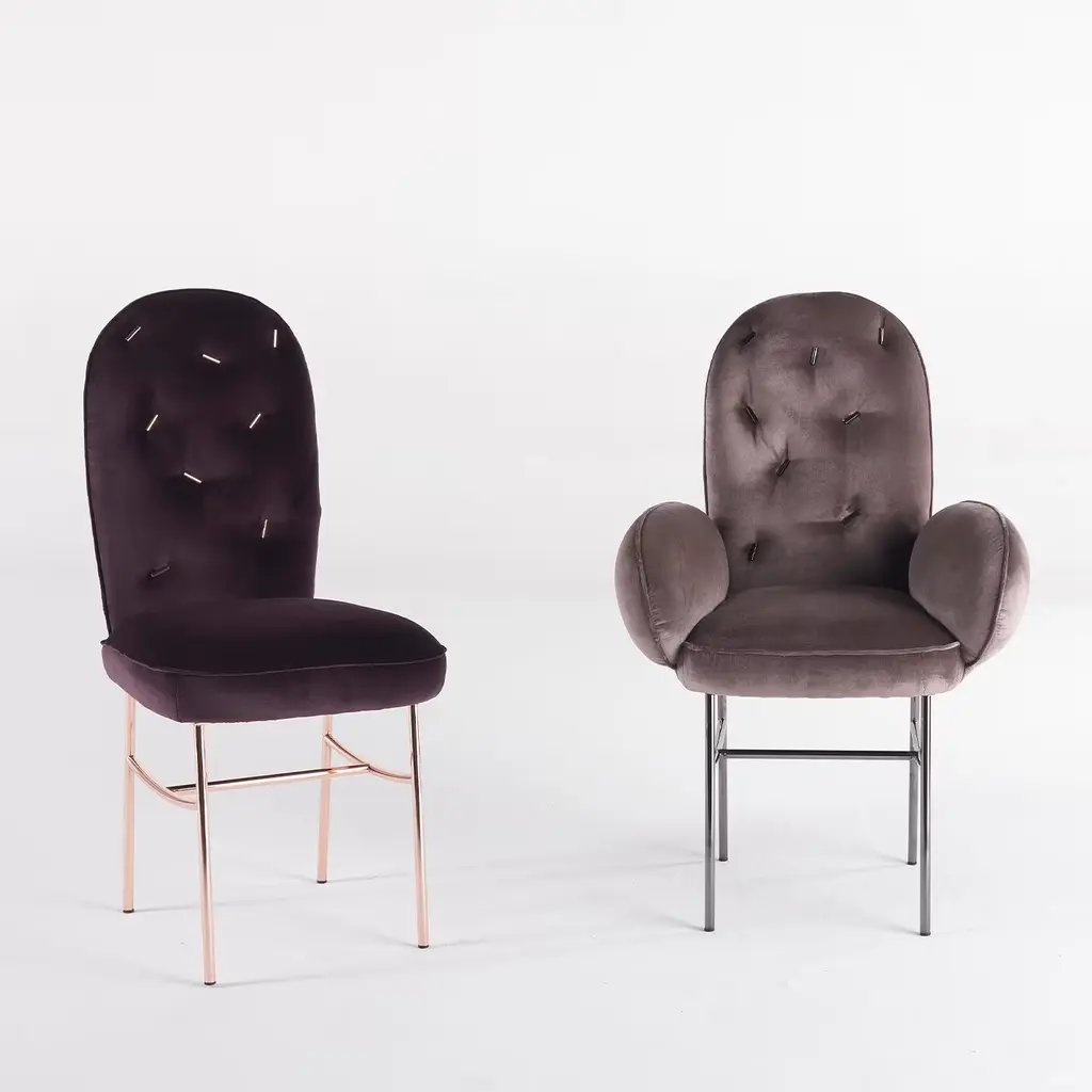 "Ttemic: a wonder-object that revolutionizes the concept of the dining room with its unconventional look. A totemic element dressing home with irony and extravagance, becoming a cult piece of a new reality." Chair with structure in multilayered wood and high-density polyurethane foam. Upholstery in Dark Violet velvet with cylindrical metal applications in glossy copper finishing. Metal legs in glossy copper finishing.