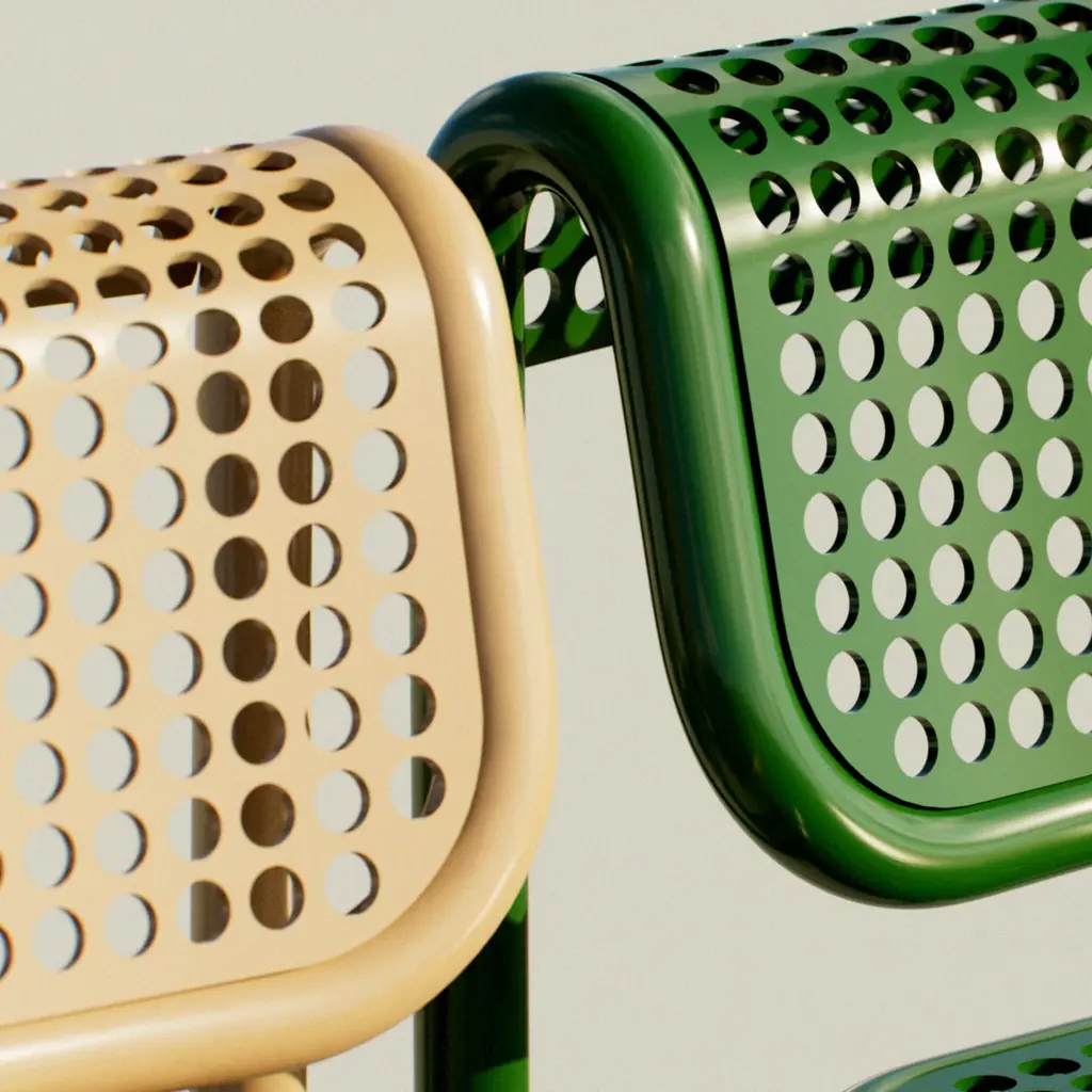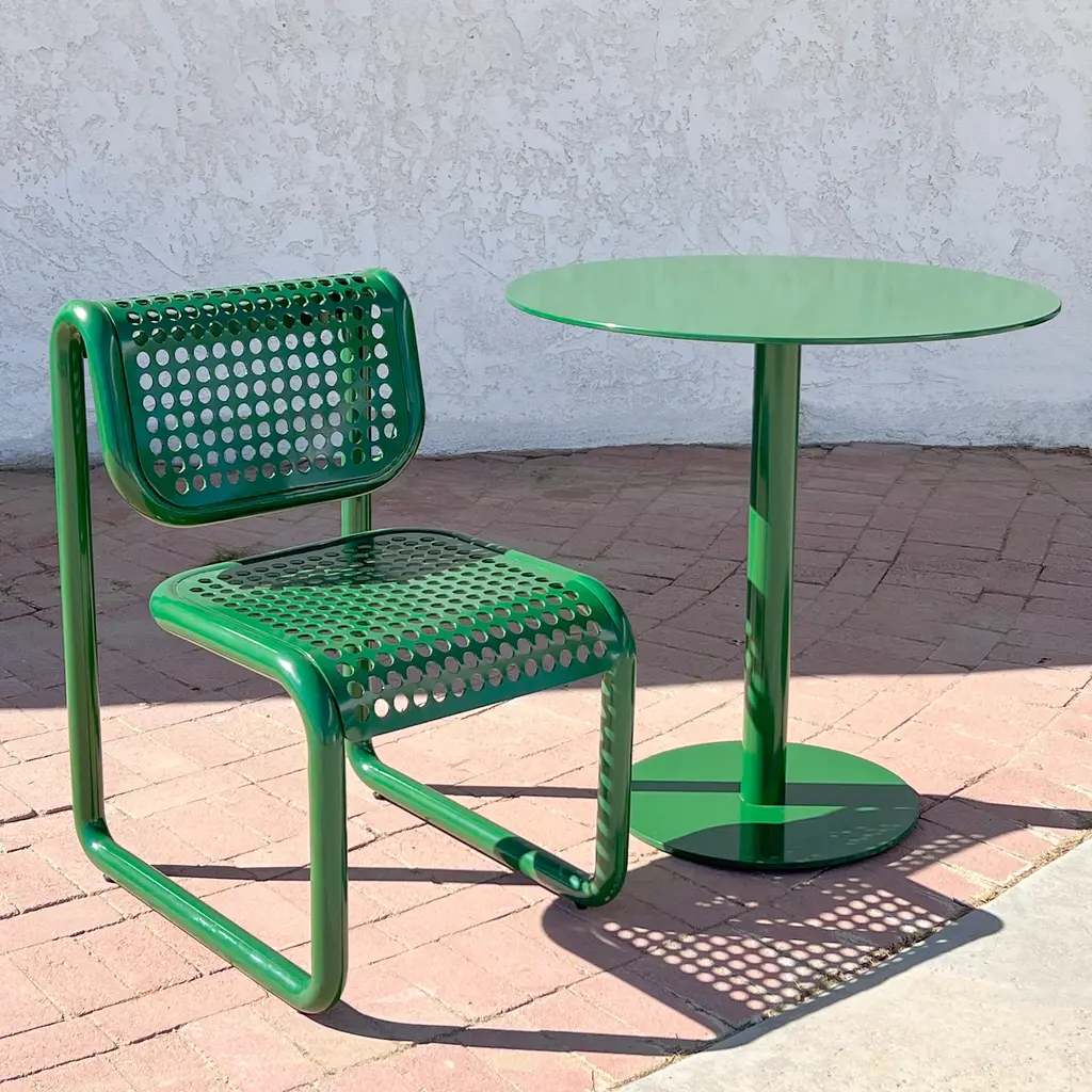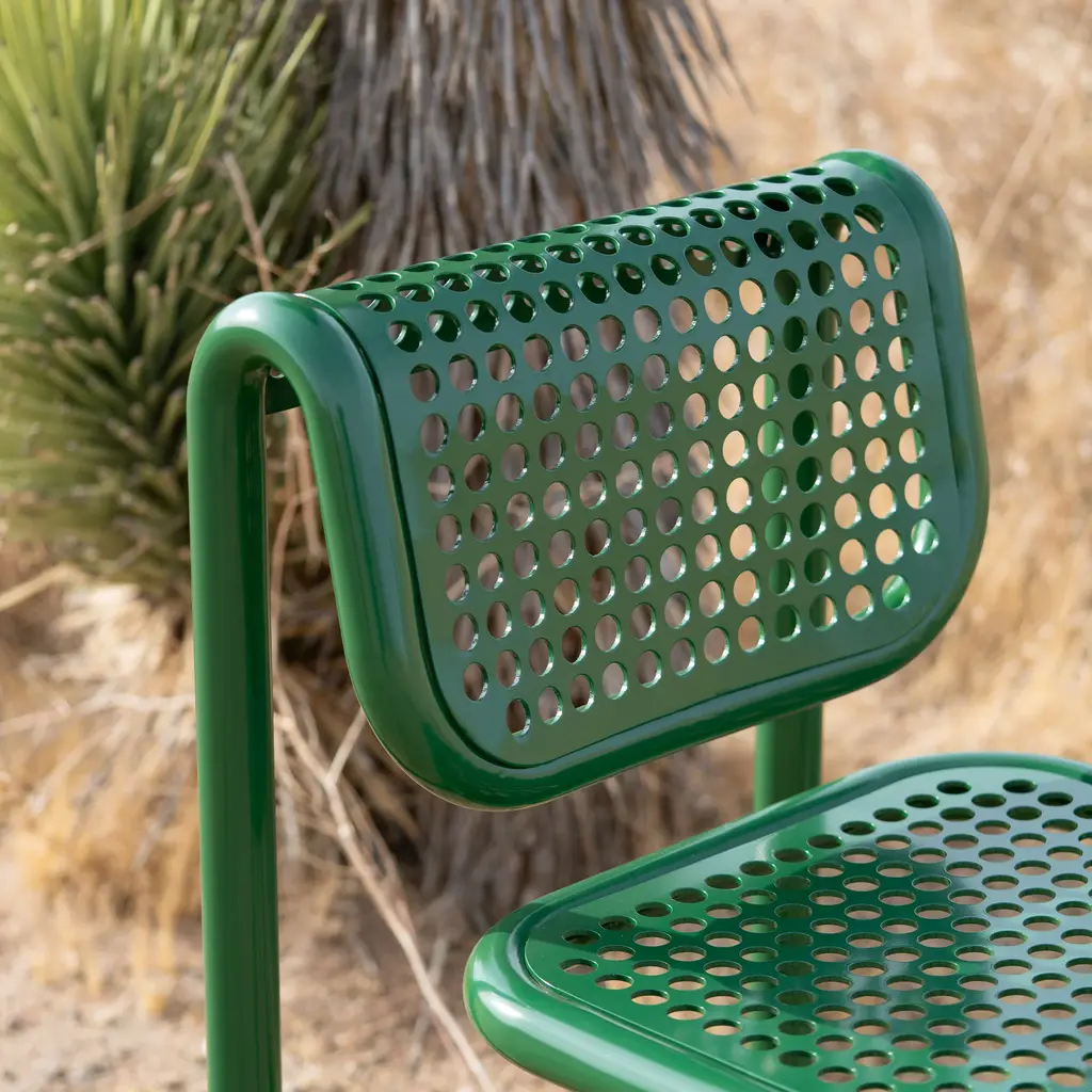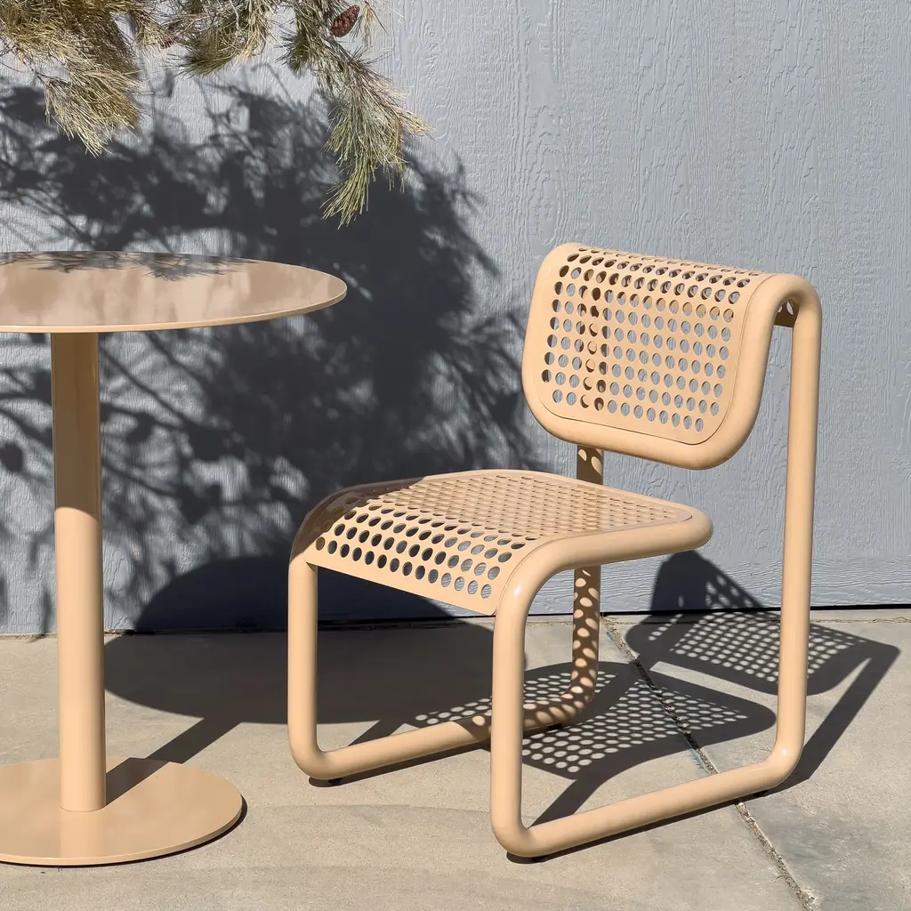 Enhance your outdoor space with Bend Goods's Tube Outdoor Dining Chair. Made from high-quality aluminum, its striking cantilever design and precision-perforated holes bring both durability and a sleek, modern aesthetic. With its lightweight frame and optional cushion, this chair provides both comfort and style for years to come. Highlights