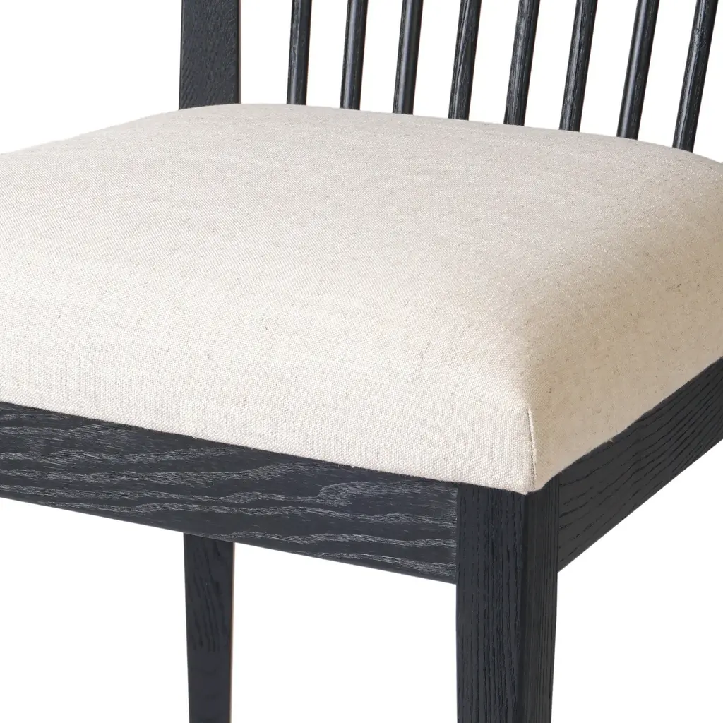 Inspired by the serene, linear style of Japanese tea houses, the Tullio Dining Chair from Four Hands is a statement in modern minimalism. This elegant, armless chair is crafted from solid ash, with a clean, architectural frame that showcases the wood's natural character. Designed for comfort, a thick, fixed seat cushion is upholstered in a durable poly-linen blend. A fusion of global inspiration and timeless design, it brings a sense of sophisticated tranquility to any contemporary dining space. Highlights: