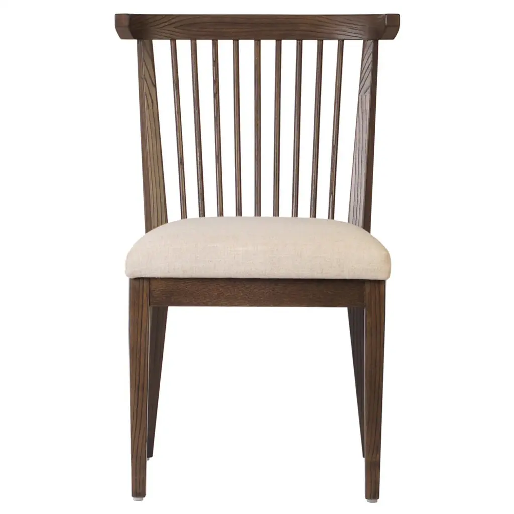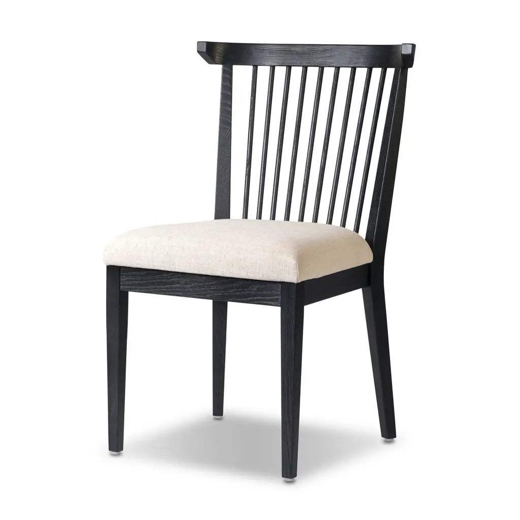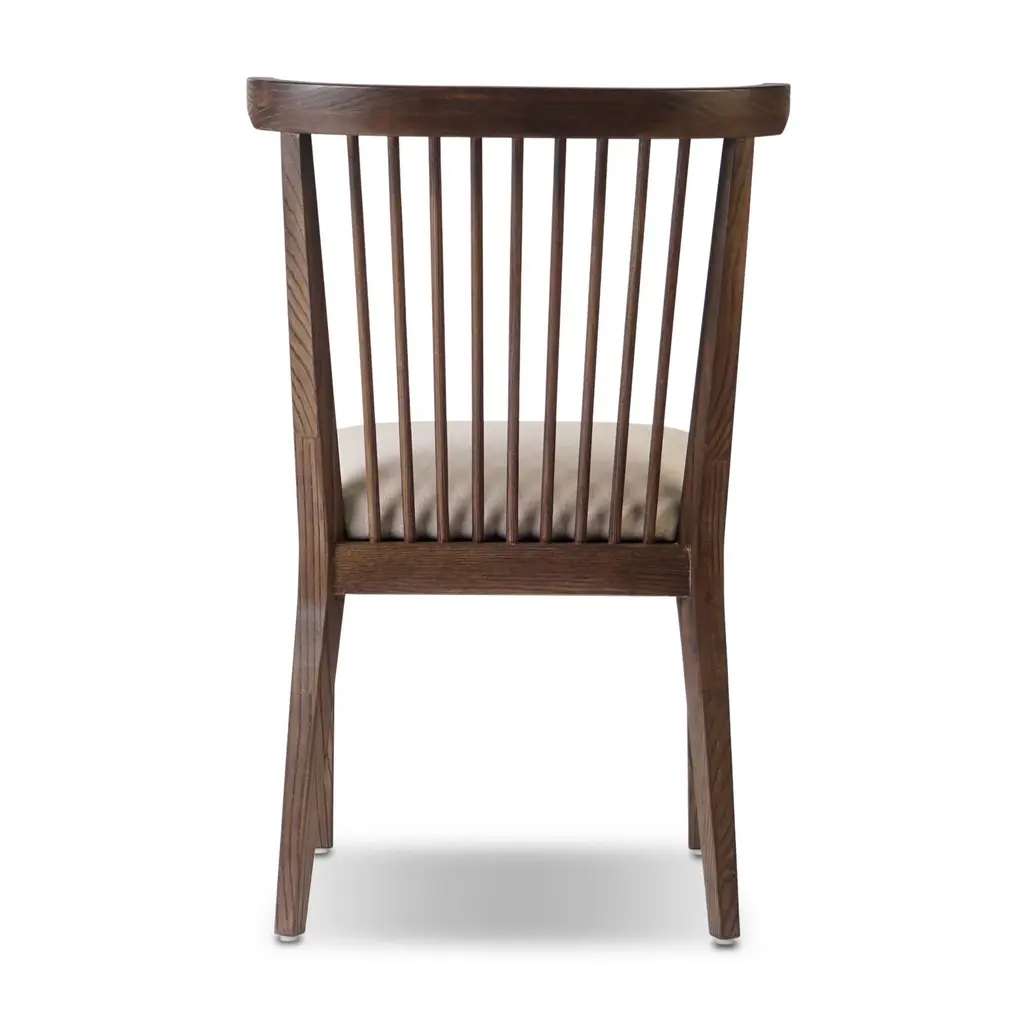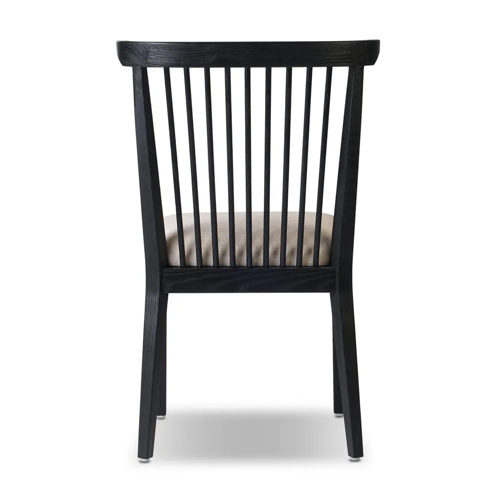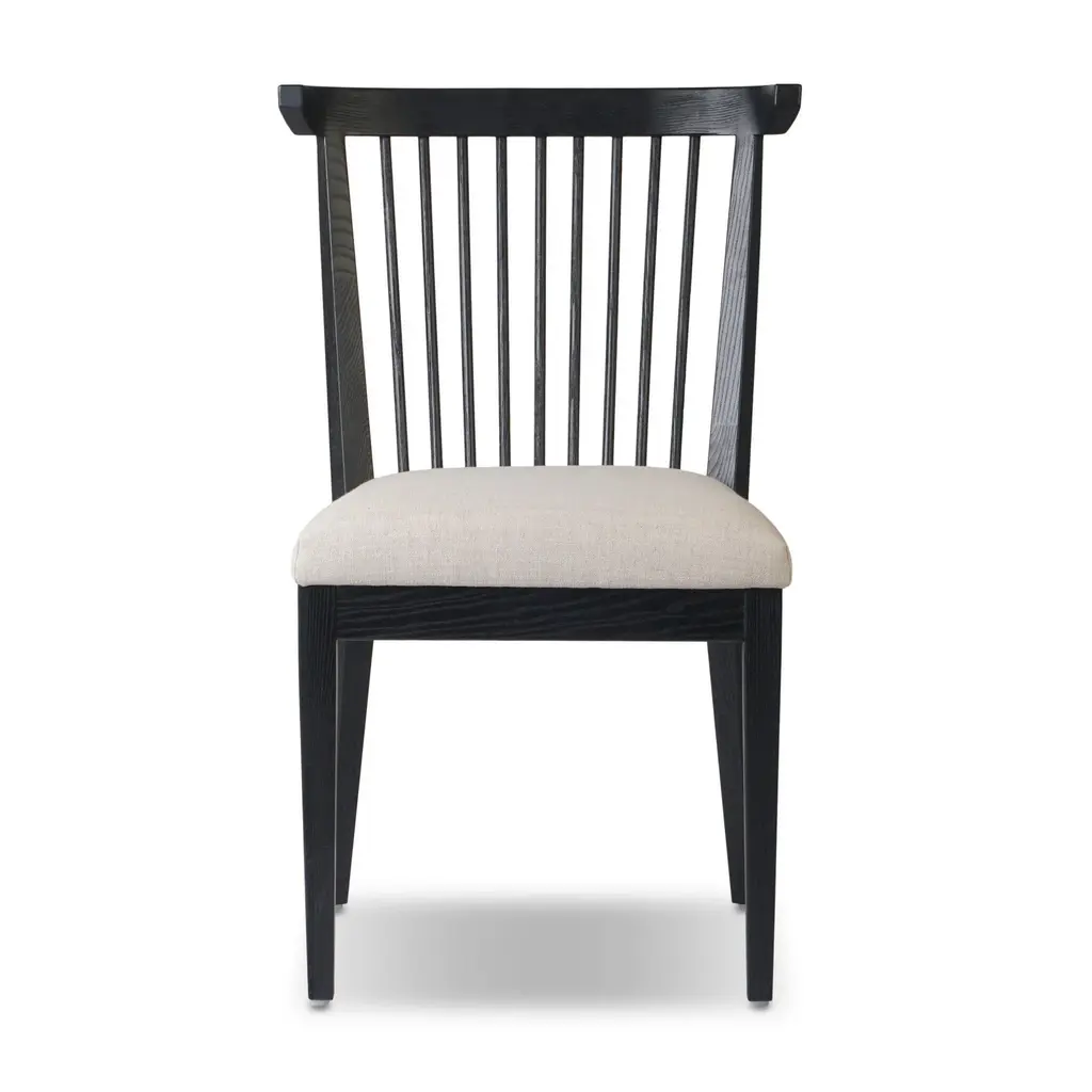 Inspired by the serene, linear style of Japanese tea houses, the Tullio Dining Chair from Four Hands is a statement in modern minimalism. This elegant, armless chair is crafted from solid ash, with a clean, architectural frame that showcases the wood's natural character. Designed for comfort, a thick, fixed seat cushion is upholstered in a durable poly-linen blend. A fusion of global inspiration and timeless design, it brings a sense of sophisticated tranquility to any contemporary dining space. Highlights: