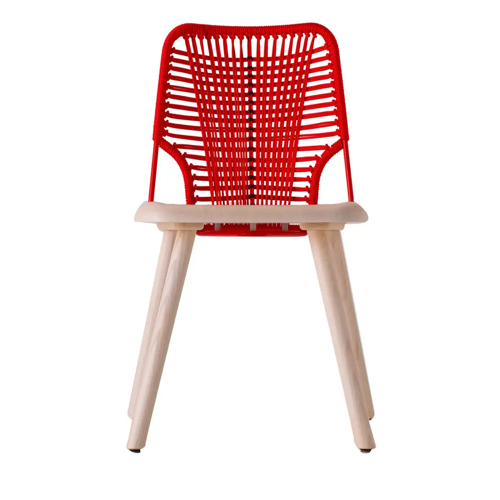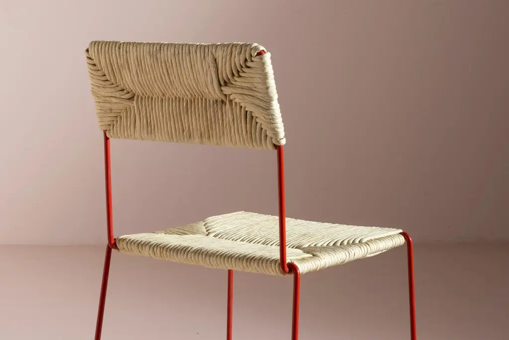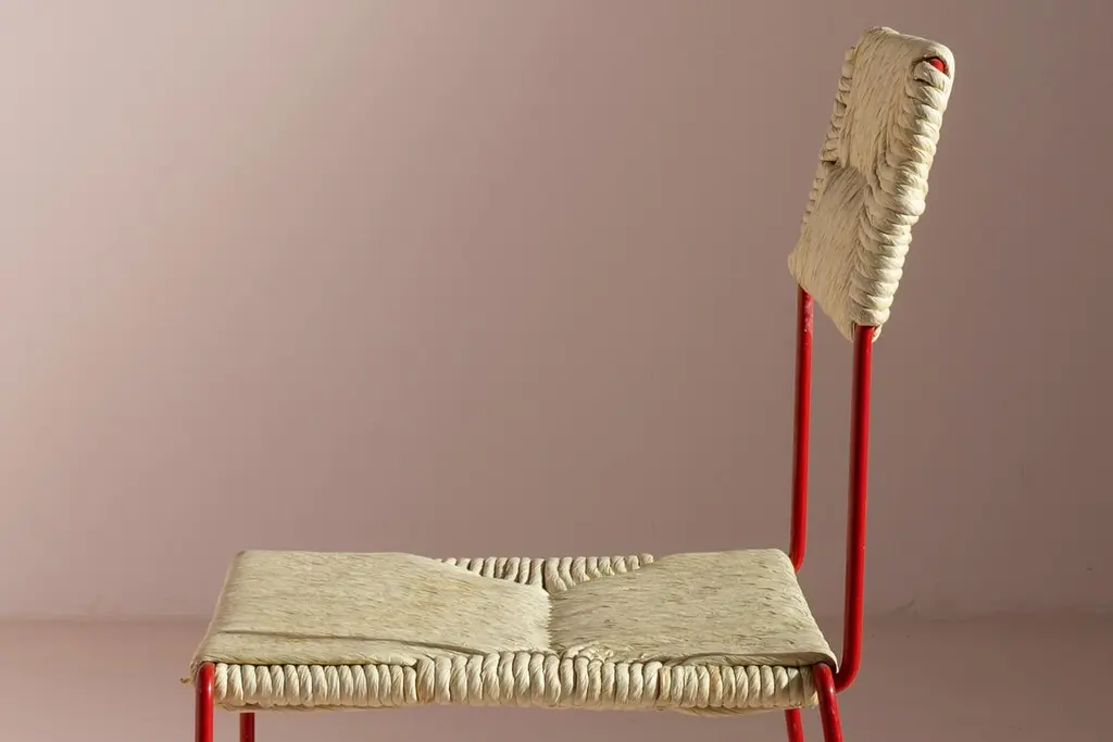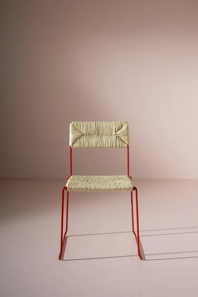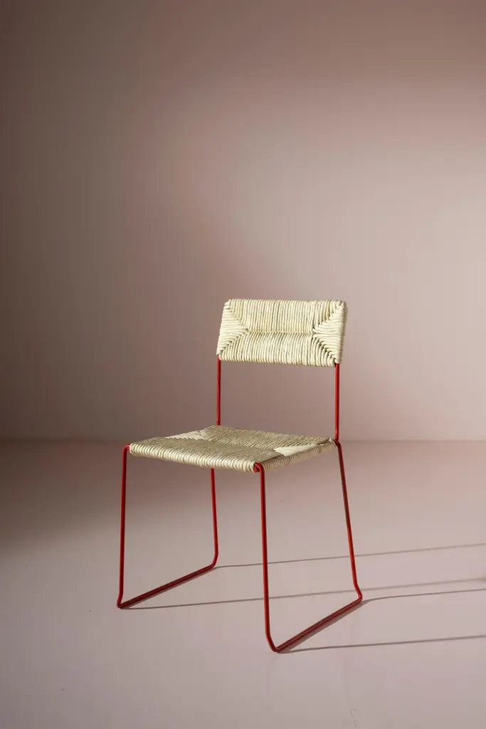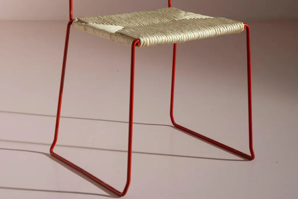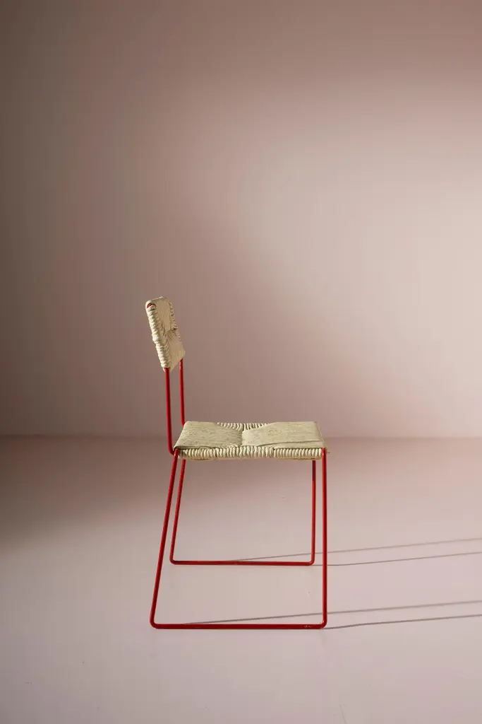With a minimalist design that nods to industrial style, these French chairs from the 1980s stand out for their simplicity. A red metal rod seems to race around, shaping the volume of a multifunctional, lightweight, and stackable seat, suitable for both domestic settings and public spaces such as bars and restaurants.The seat and backrest are made with a dense weave of cellulose fiber. The combination of two different materials - the first industrially produced and the second closely linked to nature - is suggestive for its ability to evoke different emotions.French-made chairs, they are part of a taste trend that has characterized a recognizable national style since the 1960s and has influenced fashions.Offered in their original red, the finish can be modified upon request.Dimensions: Depth 42 cm, Width 43 cm, Height 84 cm.