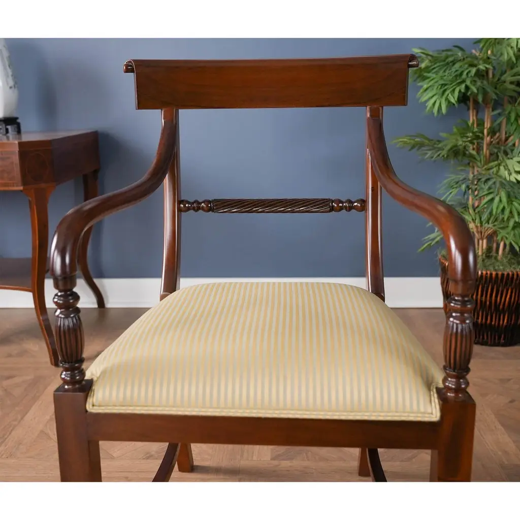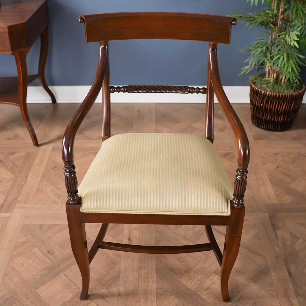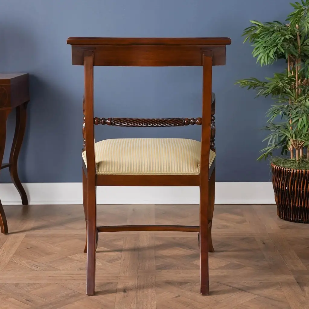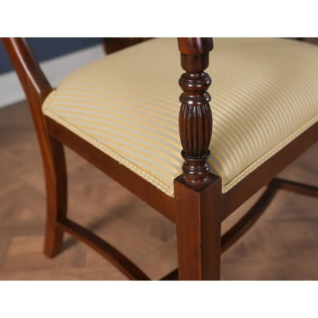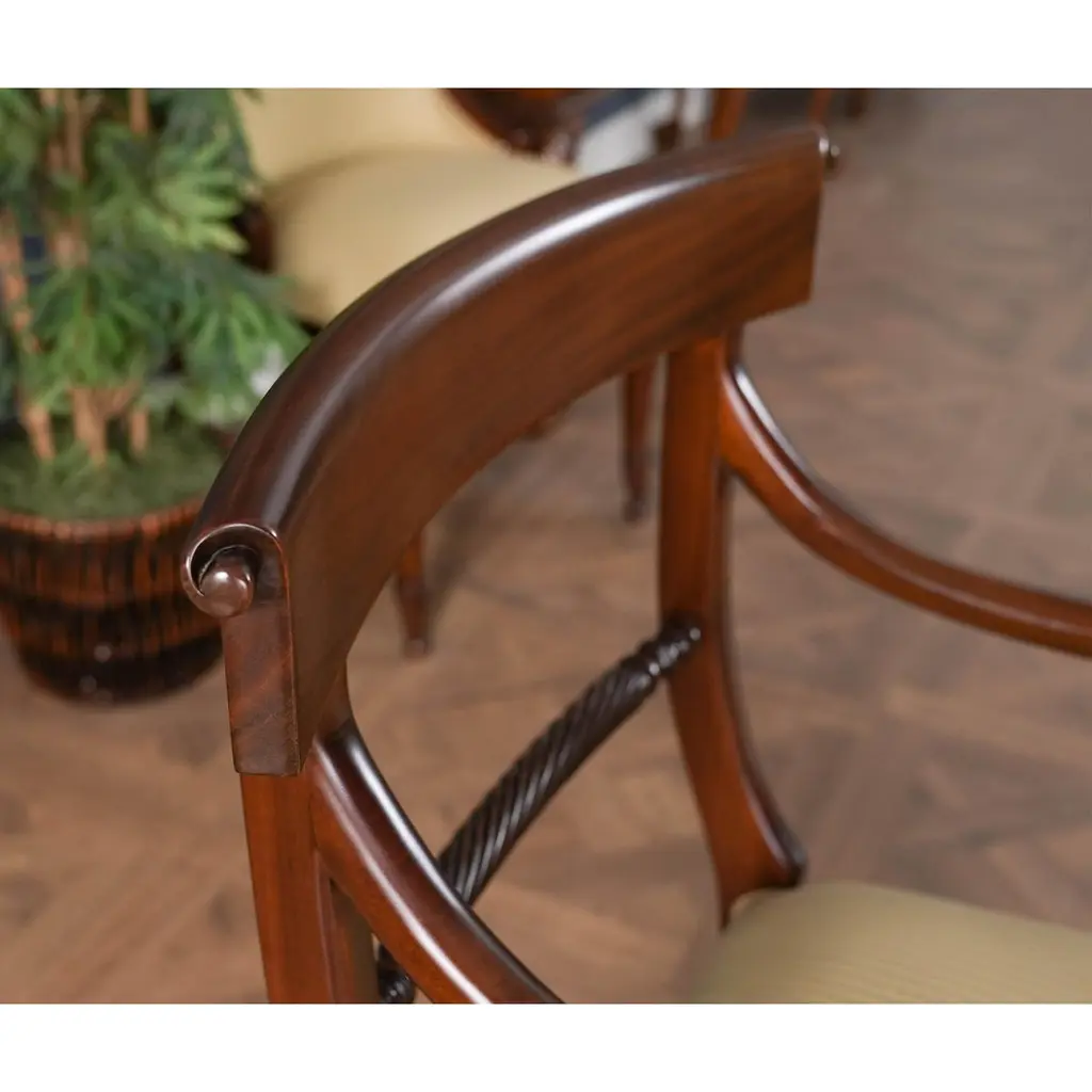 The set of 10 Federal Style, Twist Back chairs are comprised of 2 arm chairs and 8 side chairs. All of the Twist Back Chairs are hand carved from great quality, plantation grown, solid mahogany. The bowed crest rail features turned carvings, the scrolled, downturned and curved arms form a graceful arc for comfort and they are supported on reeded and turned rails over a tapered and curved saber leg. Deceptively simple at first glance the turned and carved back (twist back) adds detail and charm to the chairs’ overall appearance. The H stretcher lends strength and stability to a chair whose narrow width makes it ideally suited for maximum seating capacity around the table during holiday occasions.Arm Height approximately 27 inches and seat height approximately 20.5 inches.Arm Chairs measure 22W x 23D x 35H.Side Chairs measure 19W x 20D x 35H.Set consists of 2 Arm and 8 Side Chairs