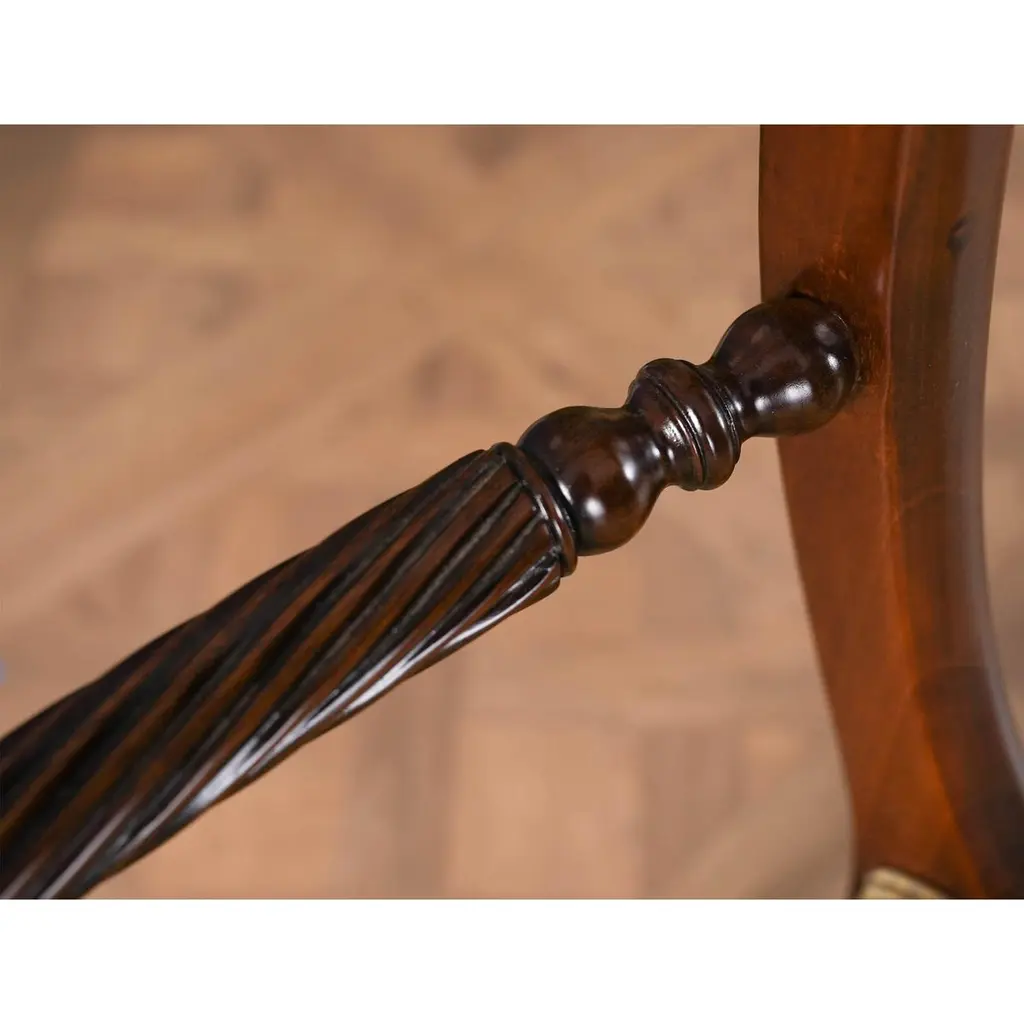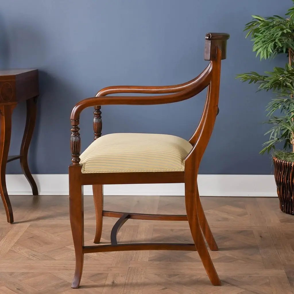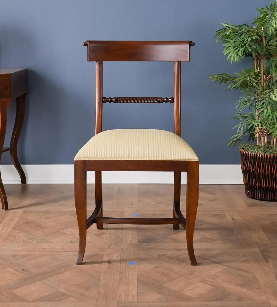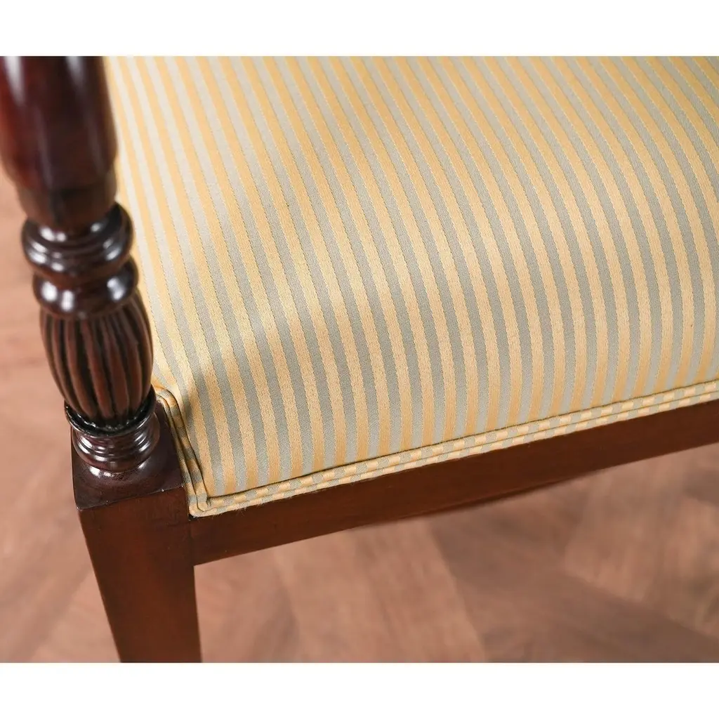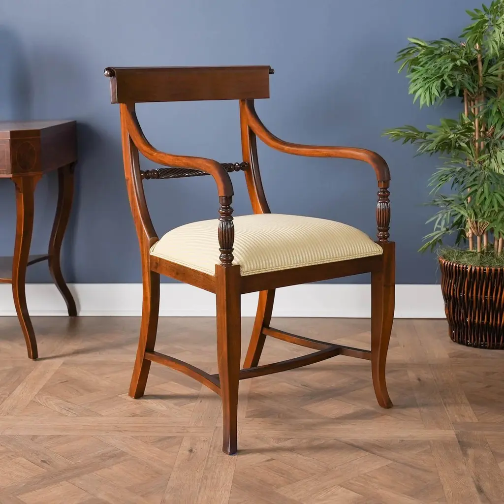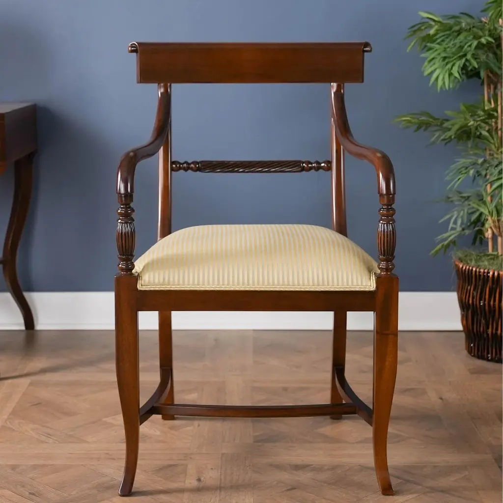 The set of 10 Federal Style, Twist Back chairs are comprised of 2 arm chairs and 8 side chairs. All of the Twist Back Chairs are hand carved from great quality, plantation grown, solid mahogany. The bowed crest rail features turned carvings, the scrolled, downturned and curved arms form a graceful arc for comfort and they are supported on reeded and turned rails over a tapered and curved saber leg. Deceptively simple at first glance the turned and carved back (twist back) adds detail and charm to the chairs’ overall appearance. The H stretcher lends strength and stability to a chair whose narrow width makes it ideally suited for maximum seating capacity around the table during holiday occasions.Arm Height approximately 27 inches and seat height approximately 20.5 inches.Arm Chairs measure 22W x 23D x 35H.Side Chairs measure 19W x 20D x 35H.Set consists of 2 Arm and 8 Side Chairs