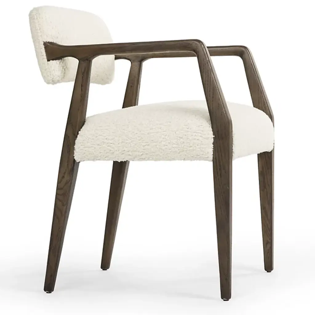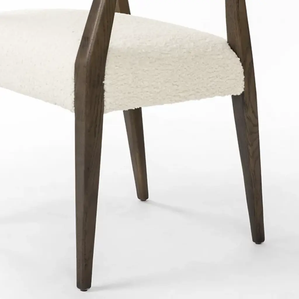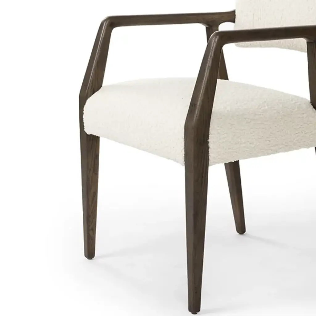 The Tyler Dining Armchair from Four Hands showcases geometric wood framing intersecting with plush softness. An angular solid oak frame rises to trapezoidal armrests, suspending a faux shearling seat and back. The textural fabric provides subtle fluff that contrasts with the chair’s smooth lines, as distressed woodgrain adds an organic touch, contrasting the soft upholstery. The design melds cool geometry with warm materials, creating a striking statement with textural character and enduring comfort.