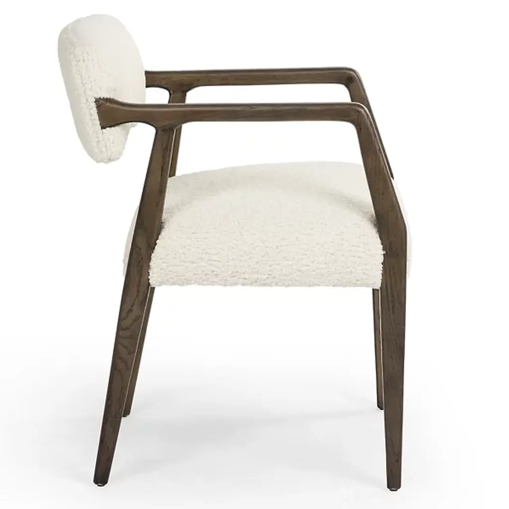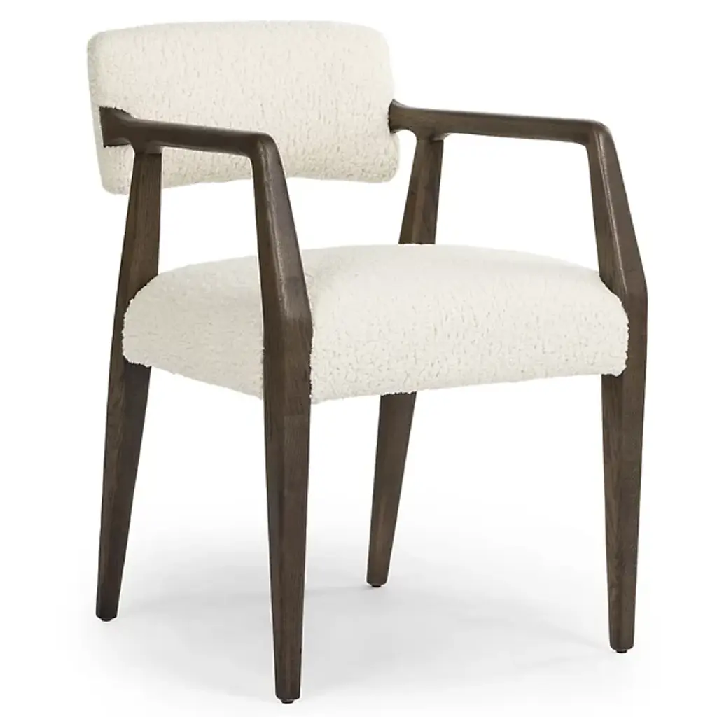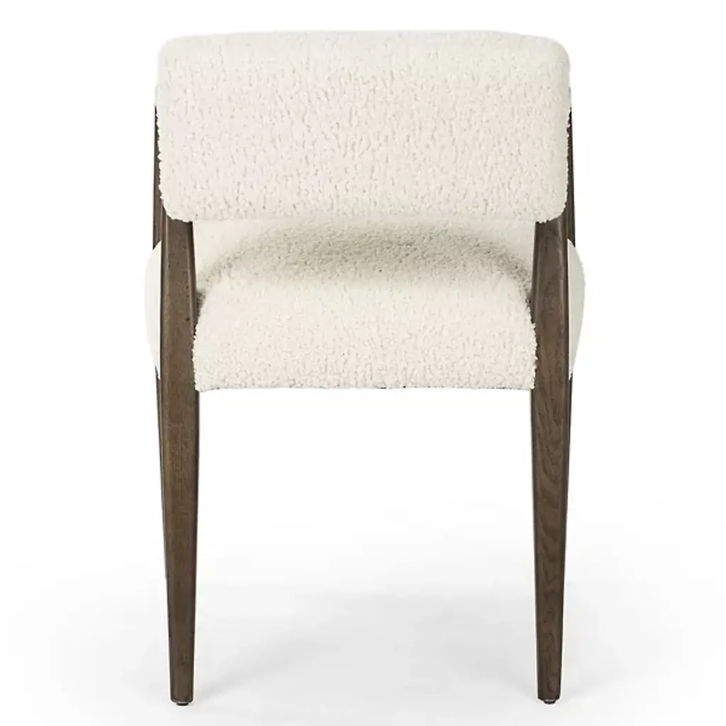 The Tyler Dining Armchair from Four Hands showcases geometric wood framing intersecting with plush softness. An angular solid oak frame rises to trapezoidal armrests, suspending a faux shearling seat and back. The textural fabric provides subtle fluff that contrasts with the chair’s smooth lines, as distressed woodgrain adds an organic touch, contrasting the soft upholstery. The design melds cool geometry with warm materials, creating a striking statement with textural character and enduring comfort.
