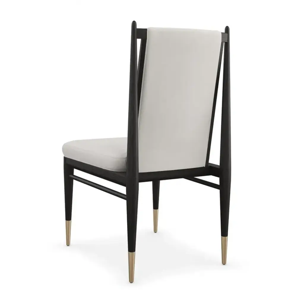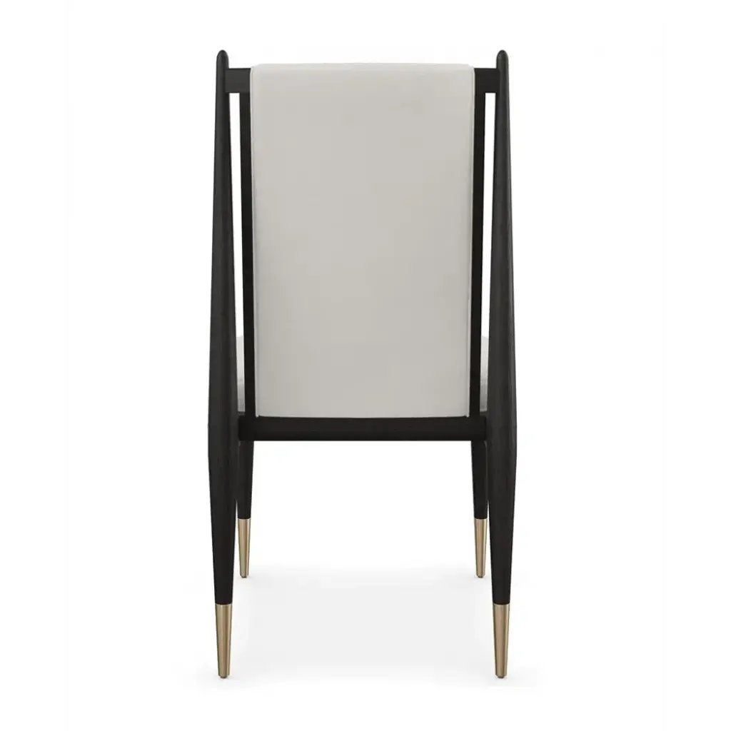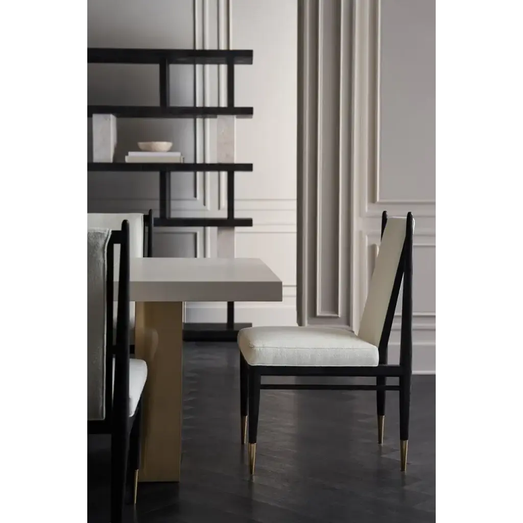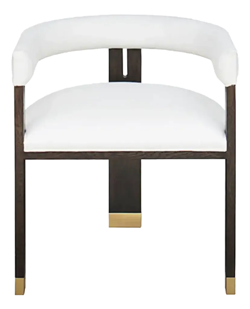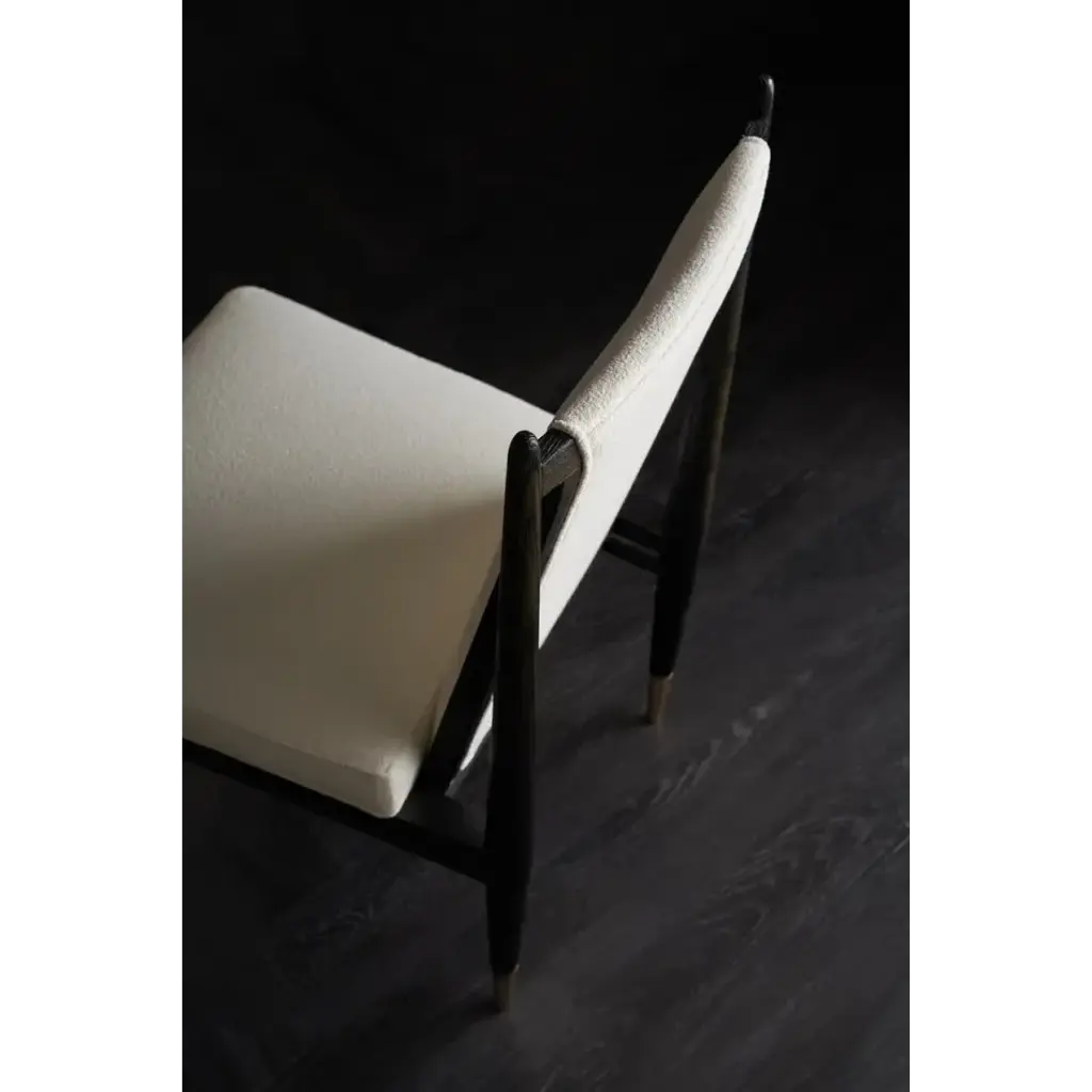 An elegant expression of materiality and form, the Unity dark dining chair is perfectly pitched for entertaining and the everyday. A clean-lined frame crafted in a Cinder-finished, open grain oak sets it apart from its light counterpart. Dressed in an ivory boucle fabric and Lucent Bronze metal ferrules, its dramatic contrast brings a sophisticated modern aesthetic to dining interiors.