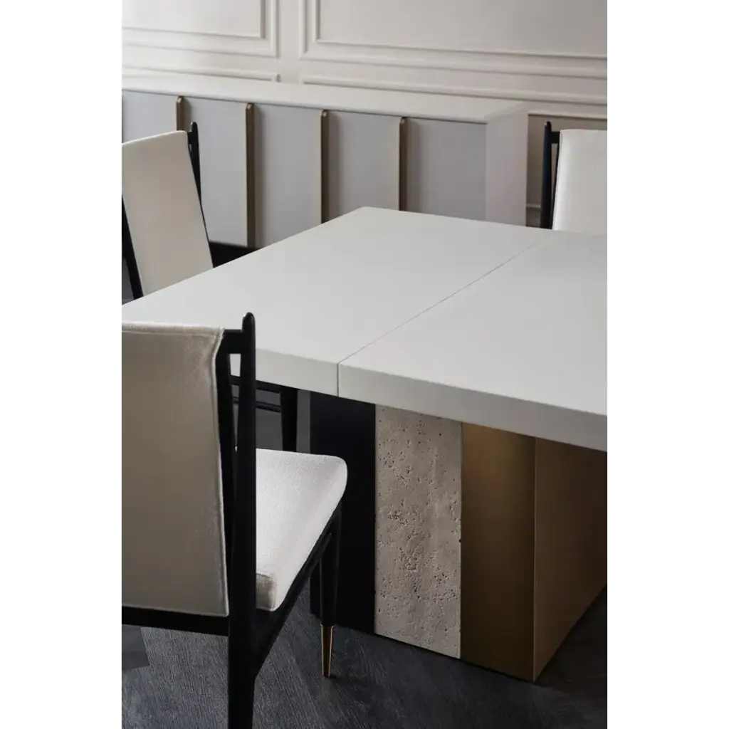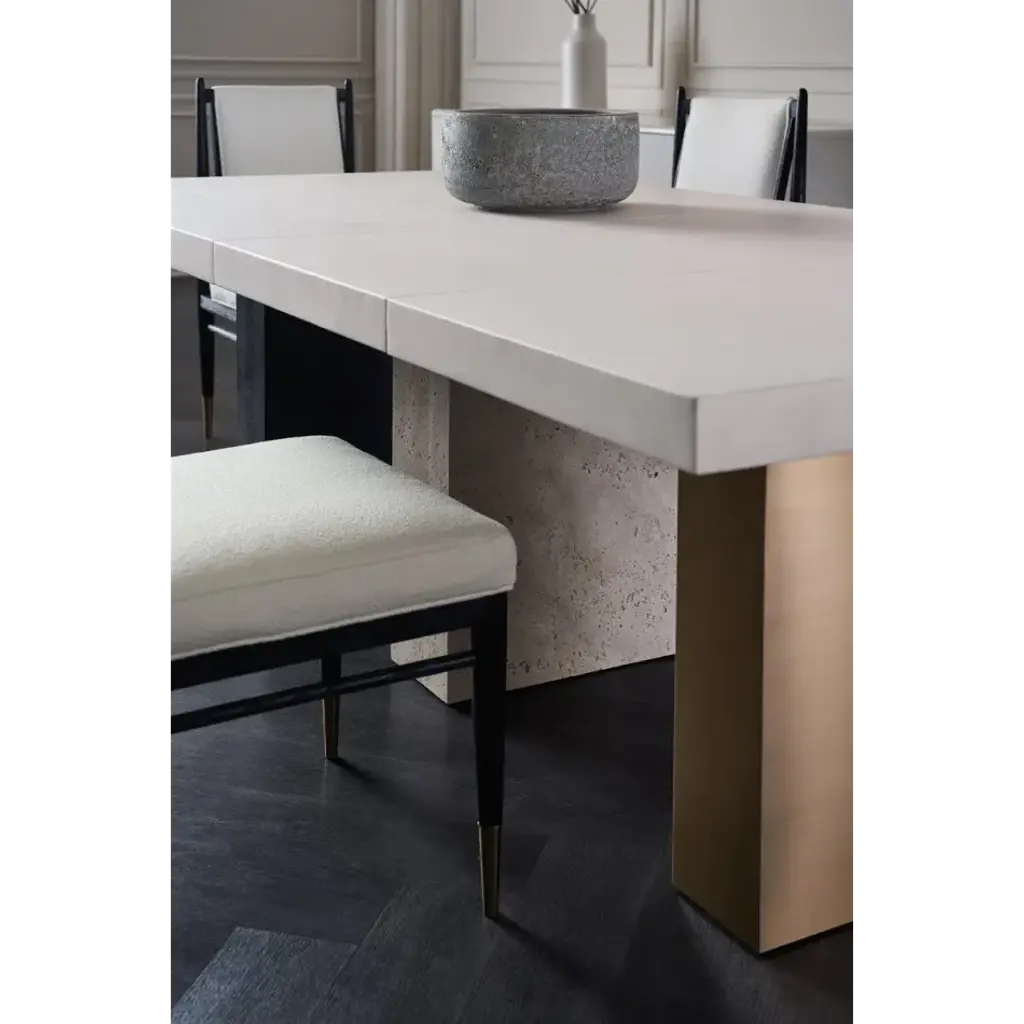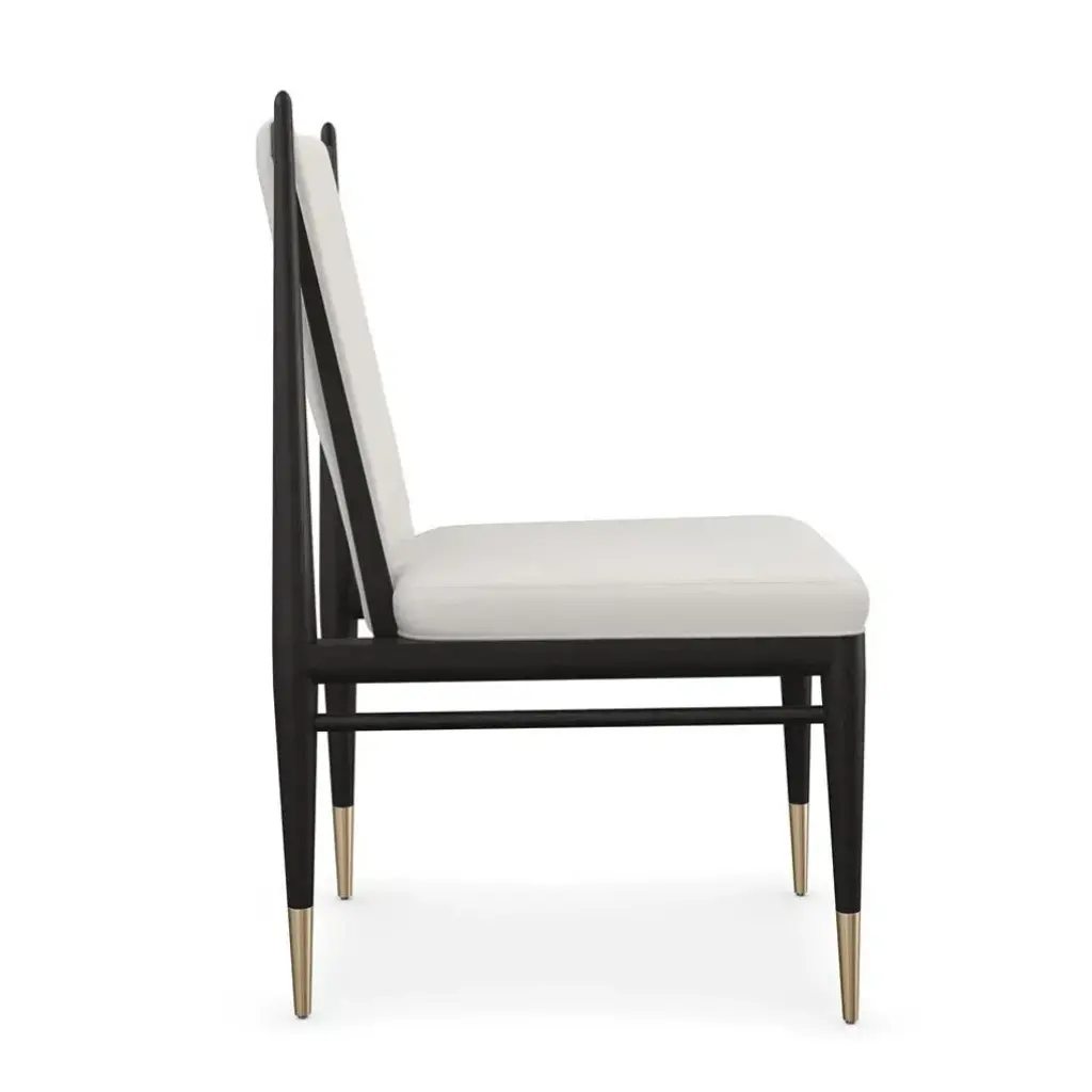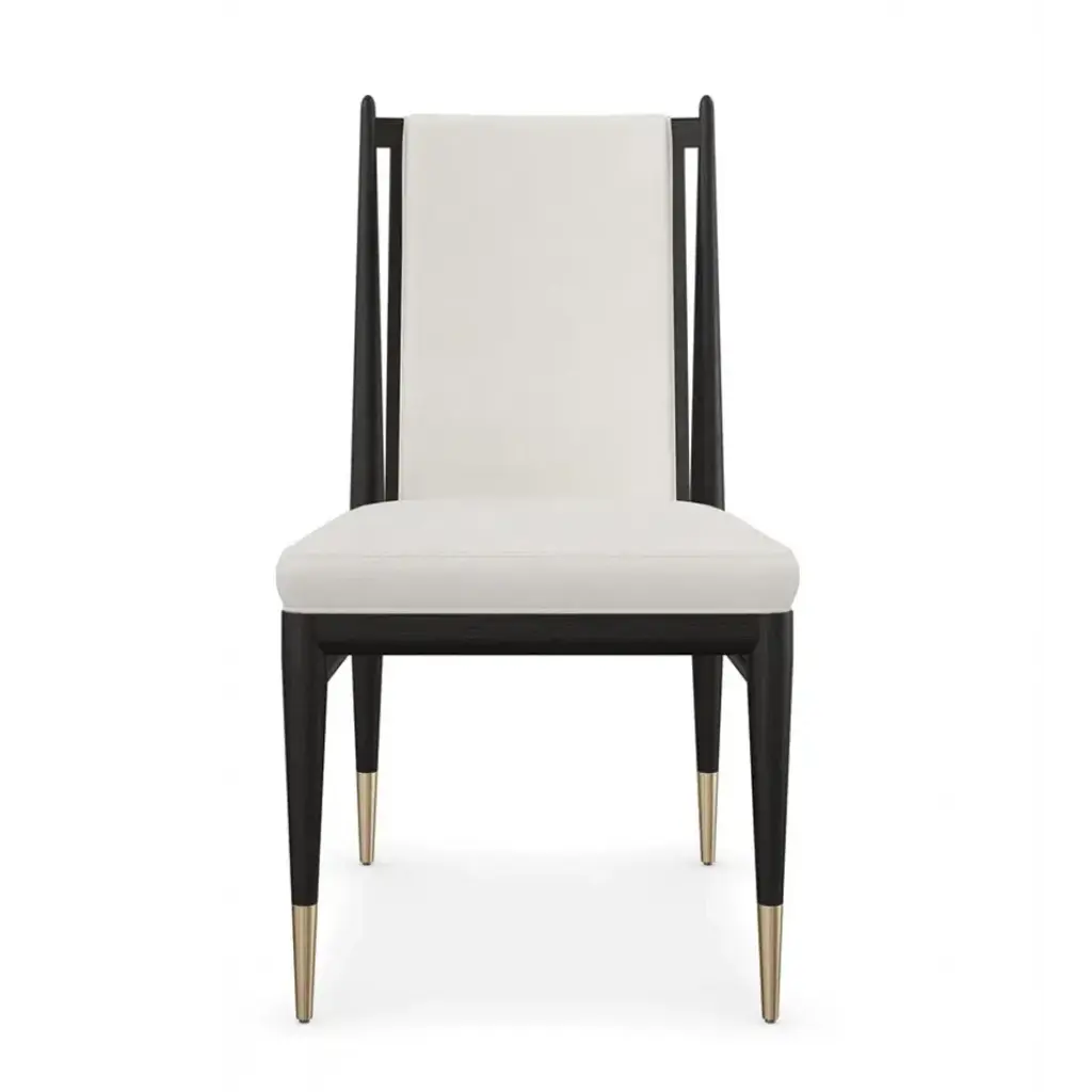 An elegant expression of materiality and form, the Unity dark dining chair is perfectly pitched for entertaining and the everyday. A clean-lined frame crafted in a Cinder-finished, open grain oak sets it apart from its light counterpart. Dressed in an ivory boucle fabric and Lucent Bronze metal ferrules, its dramatic contrast brings a sophisticated modern aesthetic to dining interiors.