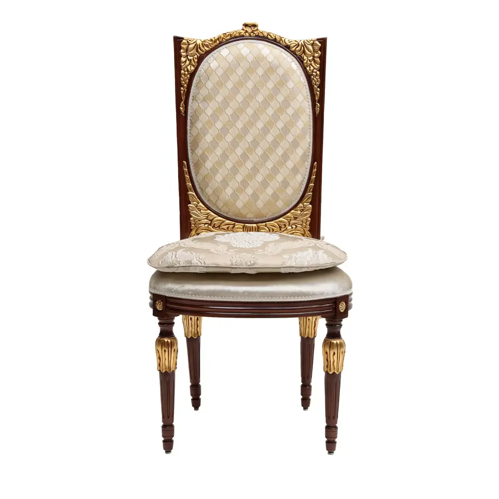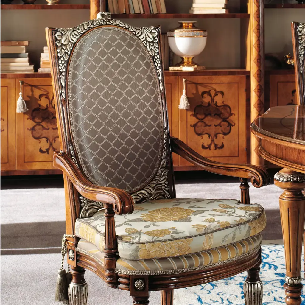 This fascinating armchair is an ideal complement to a Baroque-style dining spaces where it find its place at the head of the table. Open armrests slightly sloping downwards connect the voluptuous backrest to the welcoming seat, both the rested areas flaunting a precious fabric upholstery. Fine carved decorations covered in silver leaf embellish the exposed structure in solid beech.