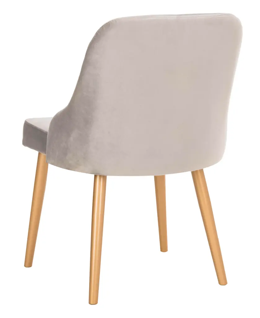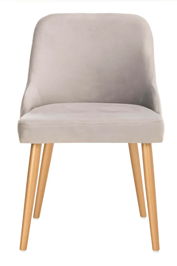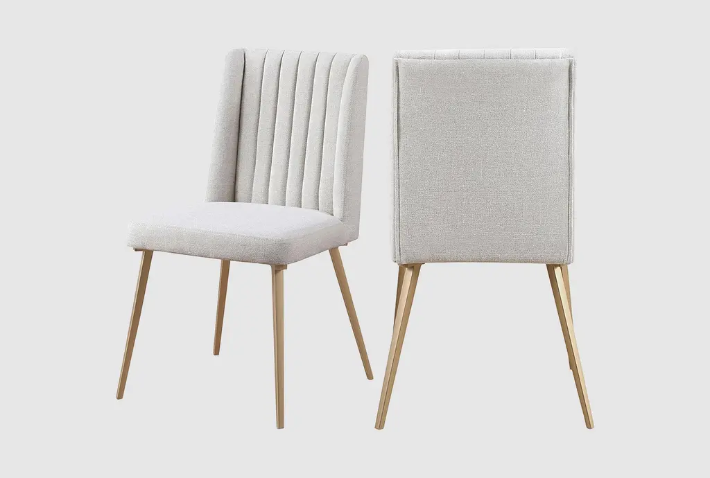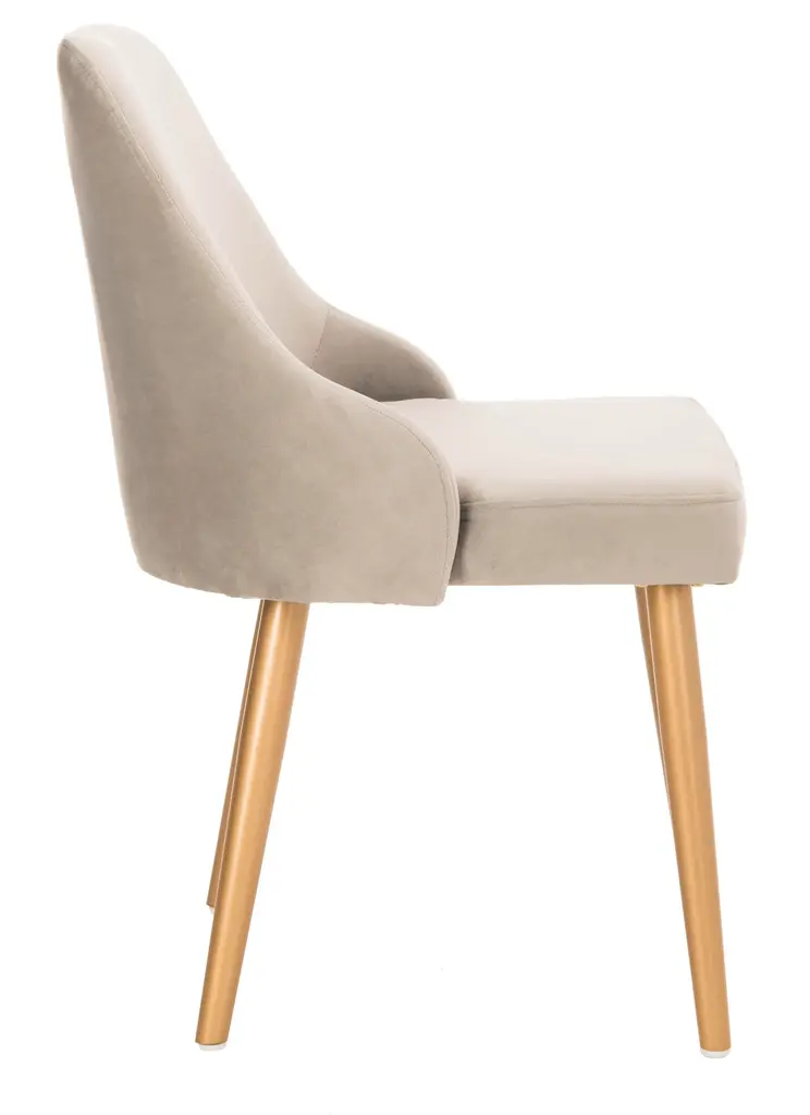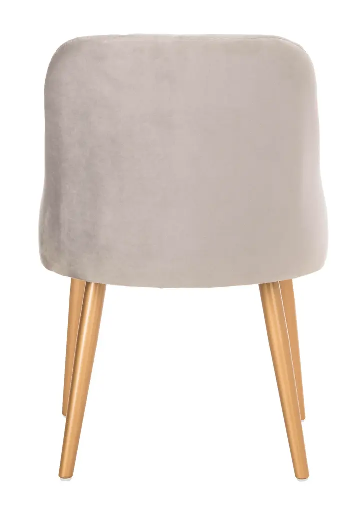 Invite contemporary style to the table with this upholstered dining chair. Created for modern entertaining, it's clean lines and gentle curves are upholstered in a neutral grey hue that complements any dining room. Radiant gold legs add timeless luxury. To prevent overall soiling, frequent vacuum light brushing is recommended. Cushions and pillows should be turned on a weekly basis. Down-filled cushions should be brushed rather than vacuumed. Spot clean, using a mild water-free solvent or dry cleaning product. Only a professional cleaner should undertake a complete overall cleaning. The use of steam or water-based cleaners may cause excessive shrinking or staining.