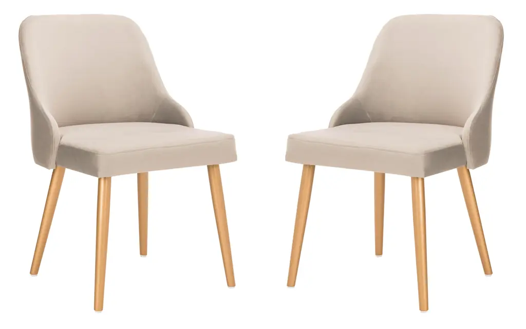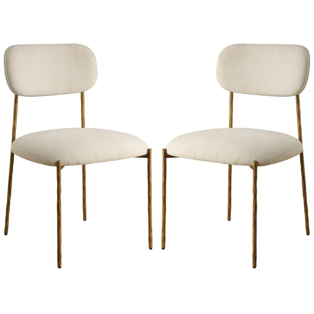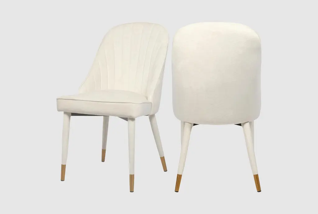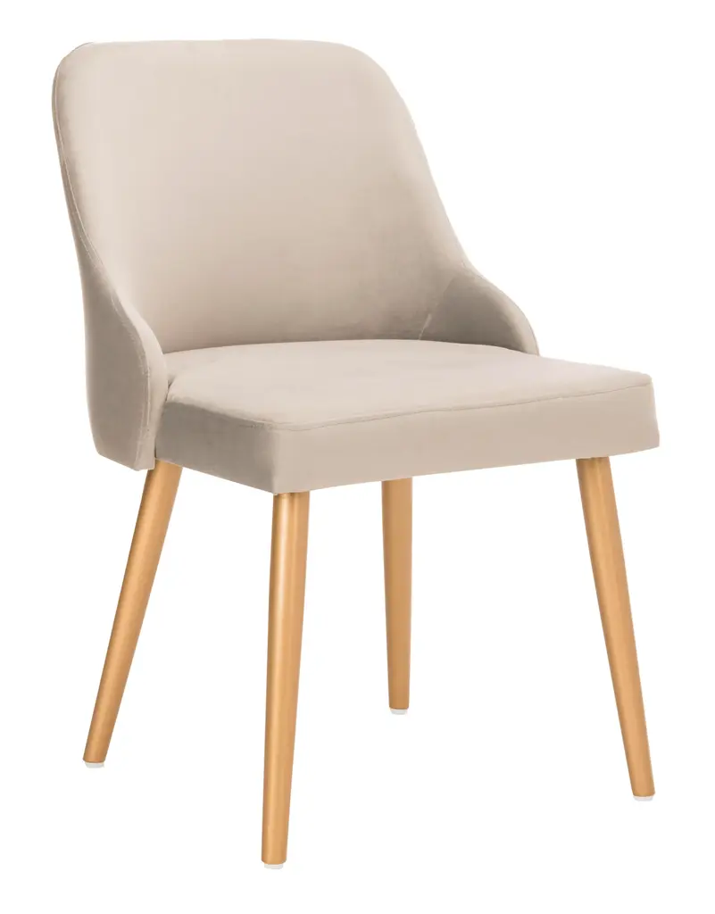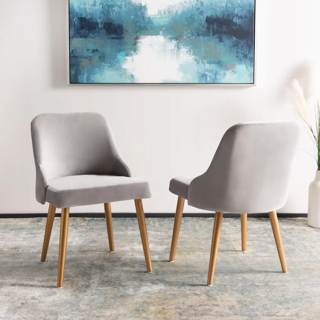 Invite contemporary style to the table with this upholstered dining chair. Created for modern entertaining, it's clean lines and gentle curves are upholstered in a neutral grey hue that complements any dining room. Radiant gold legs add timeless luxury. To prevent overall soiling, frequent vacuum light brushing is recommended. Cushions and pillows should be turned on a weekly basis. Down-filled cushions should be brushed rather than vacuumed. Spot clean, using a mild water-free solvent or dry cleaning product. Only a professional cleaner should undertake a complete overall cleaning. The use of steam or water-based cleaners may cause excessive shrinking or staining.