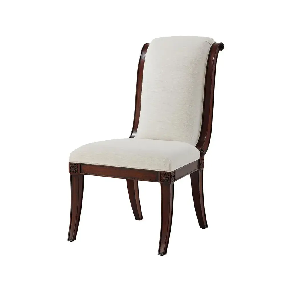 Two large mahogany side chair, with an over scroll padded back and seat above floral capital carved and paneled sabre legs. Inspired by a 19th-century French original. Dimensions: 23" W x 32" D x 42.5" H Seat - 19.5" H x 17.75" D These ship two at a time.