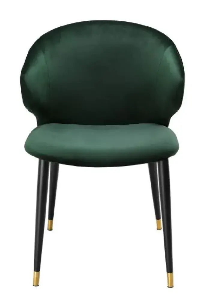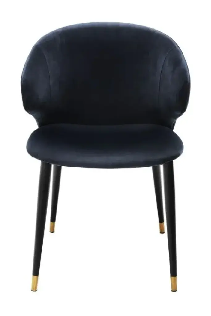 Add Mid-Century Modern appeal to your dining room or kitchen with the Volante Velvet Retro Dining Armchair designed by Eichholtz. Its black frame with sleek tapered legs and brass caps features a seating and backrest in luxurious velvet upholstery. Team up different chairs from this series for a charming vintage style!