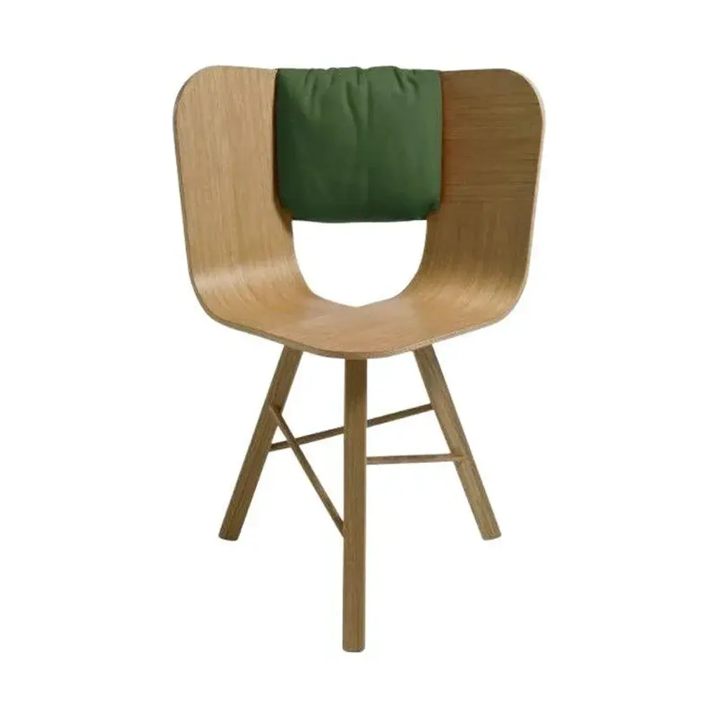 Saddle cushion, verde for tria chair by colé italia with lorenz + kaz 2012 dimensions:- materials: shaped for tria chair; 2 pockets on the back, category c also available: different fabrics and colors. Tc: c.o.m. Fabric - send us your own material ca: cat a - angel (polypropylene), ganesha (synt. Leather), nord wool (felt) cb: cat b - tiffany (polyestere), lana (aquaclean) cc: cat c - velvetforthy (velvet), topia (wool), novum (wool), opera (felt) cp: cat p - milano (full grain leather) special cushion designed to fit with the back angle of tria chair in order to give more comfort to the seat. It is upholstered on the front and velcro fixed on the back with 2 useful pockets. Our iconic chair designed by german duo lorenz + kaz. Tria is a table chair, at the same time many people place it as a sculpture, as ornament in an entrance, a bedroom or in a living room. It recalls the impossible forms of dutch graphic artist and engraver maurits escher, defining itself in a game of twists and elusive leak. The corolla-shaped shell can be used in two different seating positions, center or side, in this case with one armrest. The shell is composed of three equal elements in bent plywood assembled together and veneered with a special wood finishing ivory/ black stripes. It is also available in veneered oak, natural or stained open pore in different colors, as well as customized colors (min. 4 units). Available with 3 or 4 solid wood legs, or 4 metal legs in different finishings. For a better back comfort if you use tria chair in center position, for dining or studying, you can add a back cushion specially designed for it, upholstered and coated with a wide range of fabrics.
