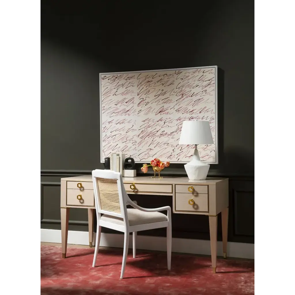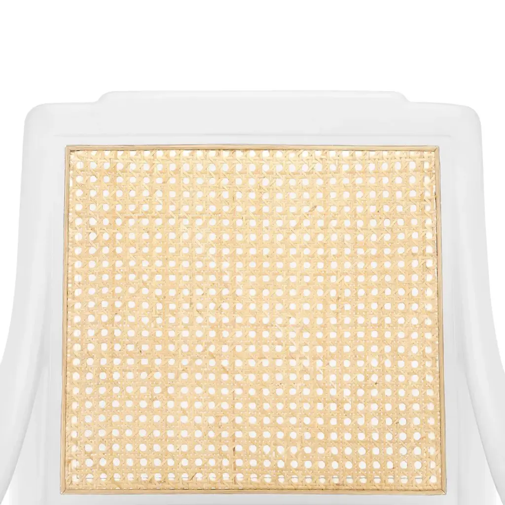 The regal stature and refined curves of our Veronika Armchair lend it an upscale elegance, while glossy finishes and organic materials keep it feeling modern and relaxed. We say it brings the best of both worlds to a dining room or kitchen, blending handsome sophistication with contemporary cool. Its sleek silhouette nods to the styling of mid-century modern designs, with sloping armrests, gently curved back legs, and uniquely tapered proportions. A lacquered mahogany frame in white provides a light contrast to the back panel of natural cane, giving the seat an airy, beachy presence. Finished with a plush, upholstered drop-in cushion, the Veronika serves as the chicest seat in the house.