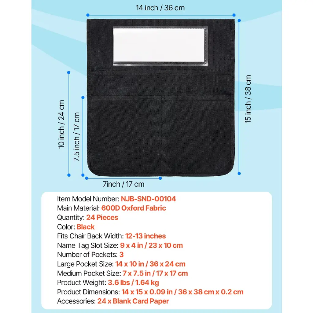Feature: 24-Piece Chairback Pocket Set: Includes 24 black chair pockets with name tags, ideal for Grade K-6. Each 14 x 15 inches bag fits 12-13 inches chair backs—great for organizing desks and keeping everything within reach! Tidy Desks: With 1 large pocket (14 x 10 inches) and 2 medium pockets (7 x 7.5 inches), kids can easily store books, notebooks, and supplies. No more clutter—everything is in its place to help them stay focused! Durable Oxford Fabric: Our chairback buddy pocket is made with tough, tear-resistant 600D Oxford fabric and double stitching for long-lasting use. Machine washable for easy maintenance—ready for years of use. Quick Setup: Simply slide the seat pocket onto the chair for easy, secure storage. The name tag slot helps with classroom management, making it simple for kids to find their seat! Versatile Options: Available in multiple sizes and quantities to fit your classroom needs. The back of chair organizer is ideal for back-to-school gifts, keeping desks organized, and creating a more efficient learning environment. Package Content: 24 x Chair Pockets 24 x Blank Card Paper