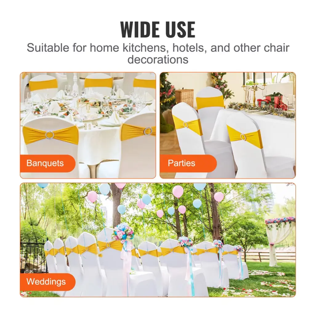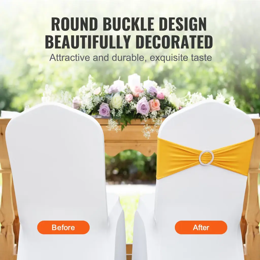 Feature: Round Buckle Chair Bands: Wedding chair bands, 100PCS per box, in golden yellow color. Made of premium fabric, with a stylish design that not only enhances chair uniformity but also adds elegance to your wedding, graduation ceremony, birthday, and other events. Premium Material: Crafted from 95% Polyester Fiber & 5% Spandex. The sturdy material and well-done stitching provide extra comfort and elasticity. These universal chair bands are perfect for both indoor and outdoor activities. Exquisite Sewing and Design: The chair band decorations are reusable, meticulously sewn with a one-piece design that ensures durability against wear and excessive stretching. Compatible with Various Chairs: Moderately sized chair bands: 13.4x6.3 inch / 340x160 mm; Decorative ring diameter: φ2.6 inch / 65 mm. Stretchable spandex chair sashes can be installed on most chairs without armrests, including dining chairs, stacking chairs, and banquet chairs. Easy to Use and Clean: The sash can be hand-washed, machine-washed, or dry-cleaned with a mild detergent, meeting your cleaning needs more effectively. Package Content 100 x Chair Sashes