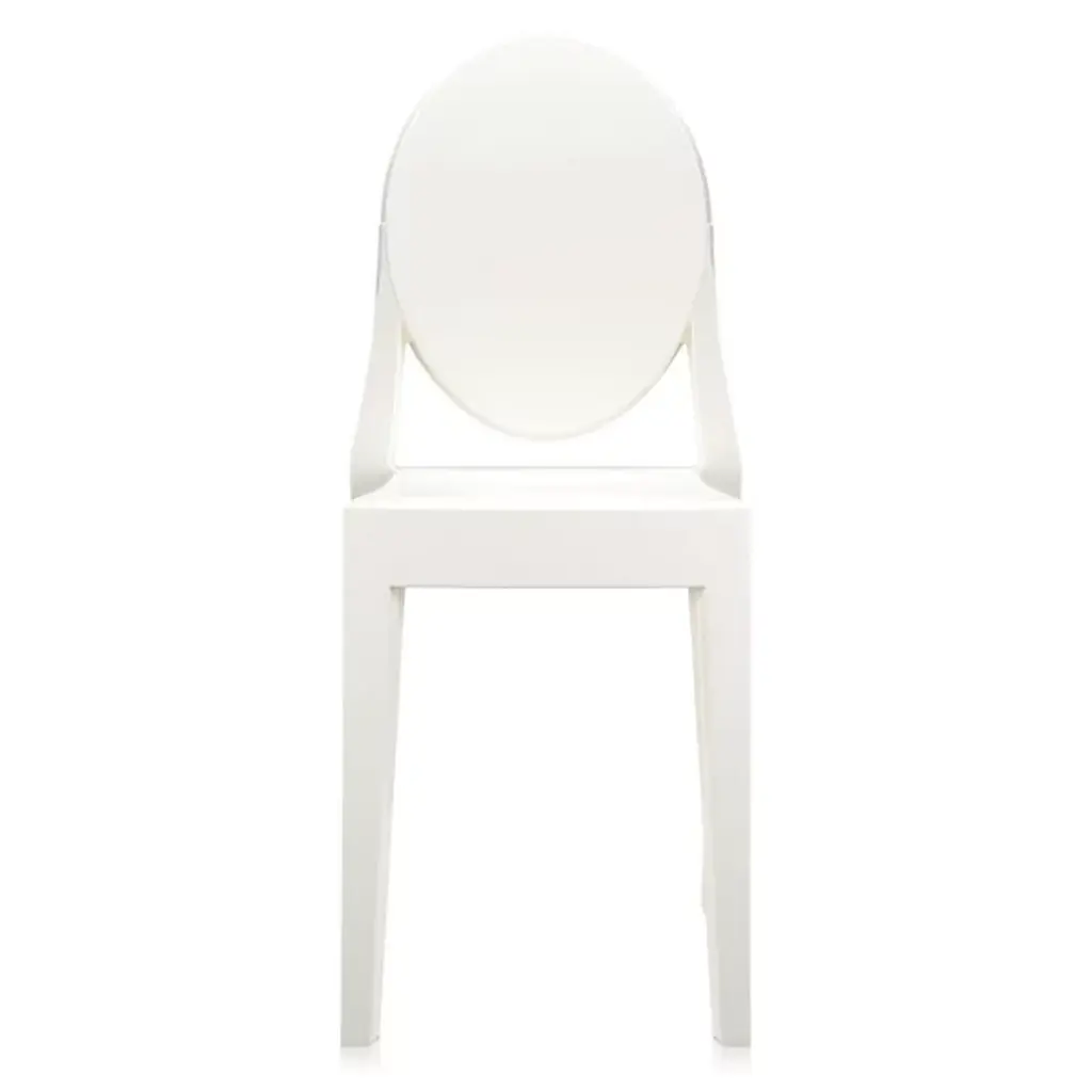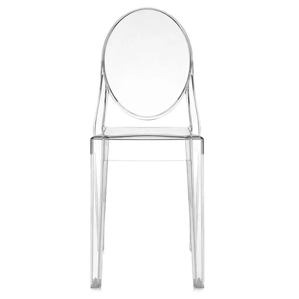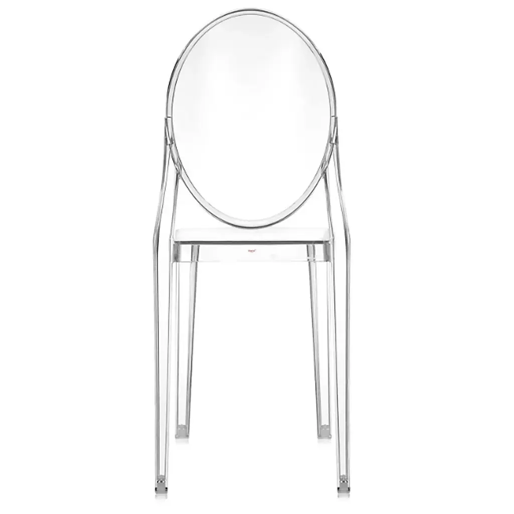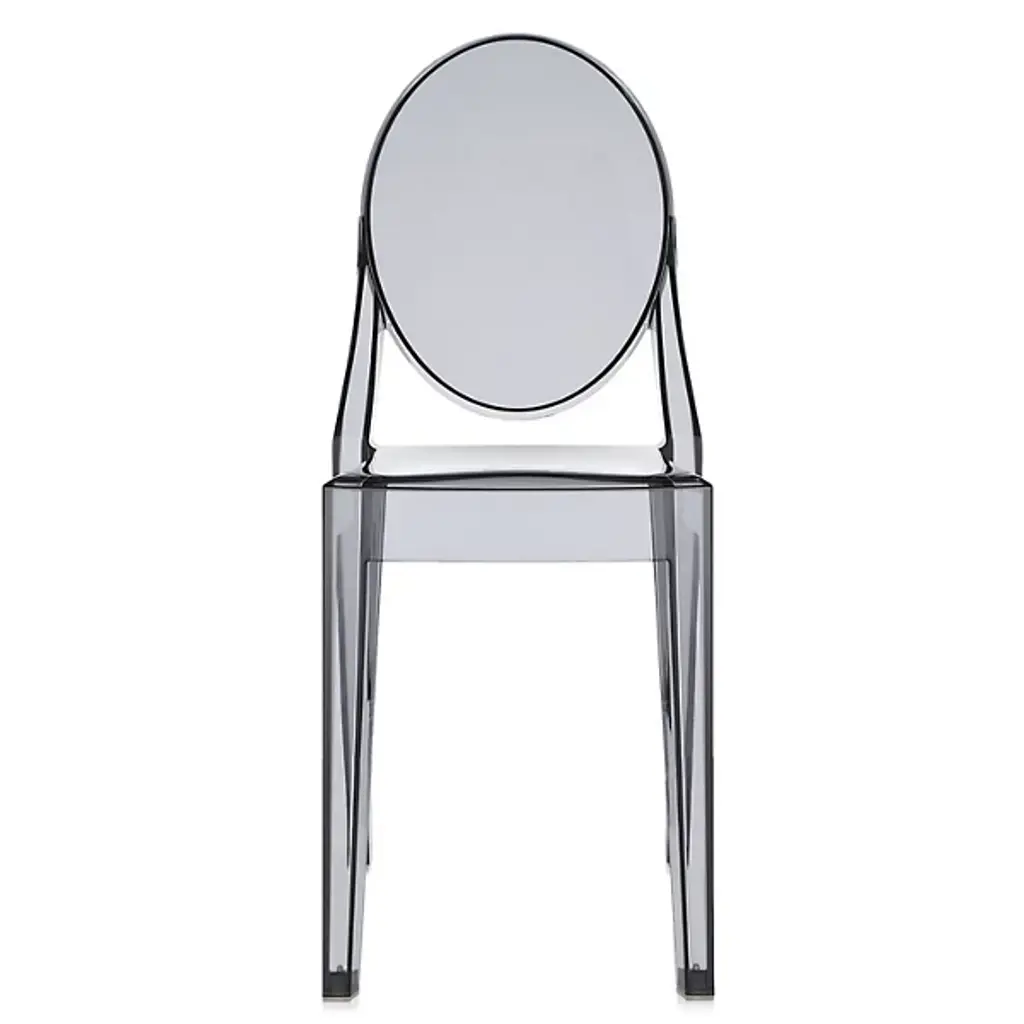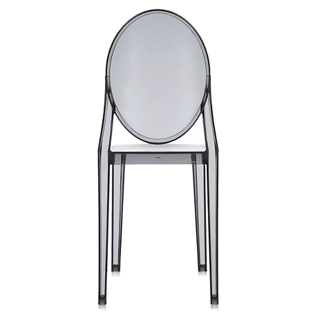 The Kartell Victoria Ghost Chair is a chair born of classic lines and modern technologies. The rounded backrest recalls the shape of antique medallions, with a linear and geometric seat completing the look. Made of polycarbonate formed out of a single mold. The result is stable and comfortable, charming and personable in a variety of settings indoors or out. Designed by Philippe Starck. Set of 2.