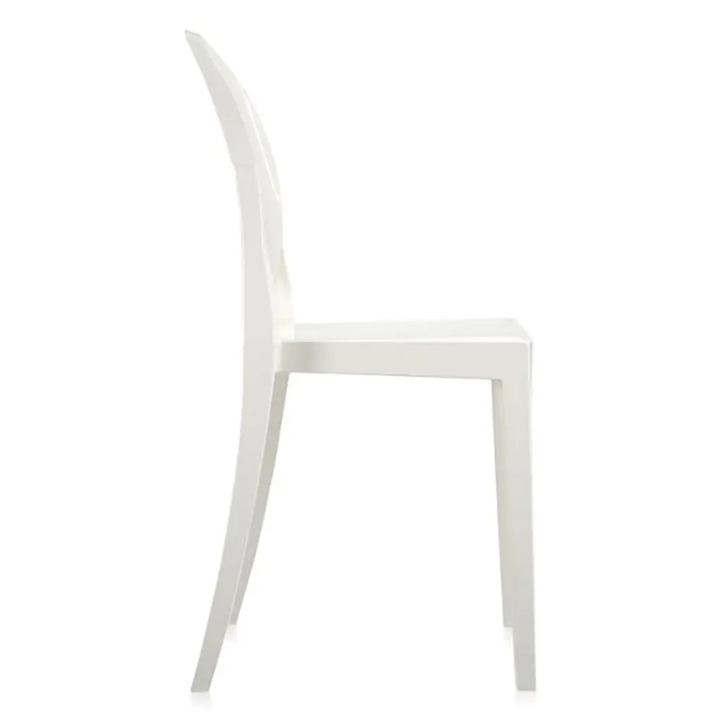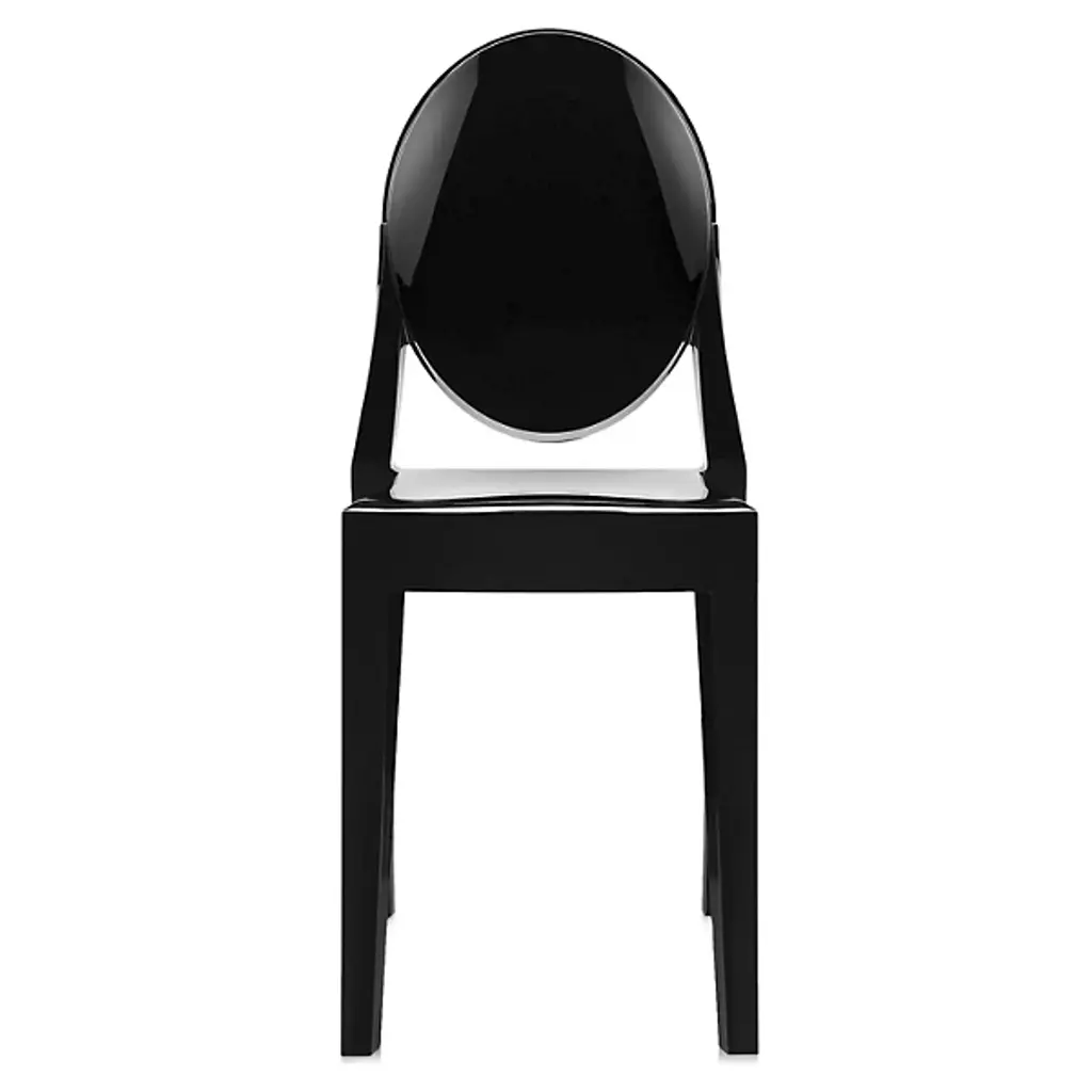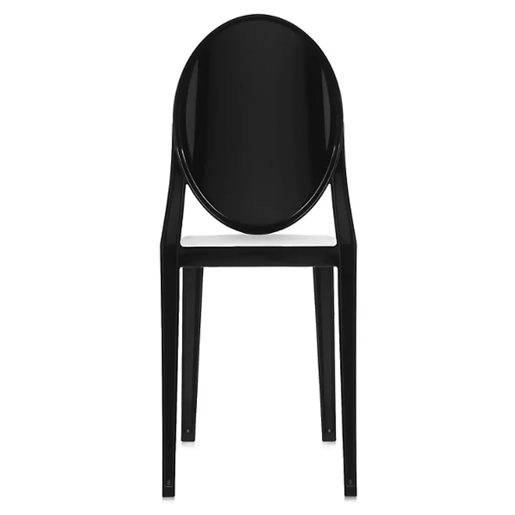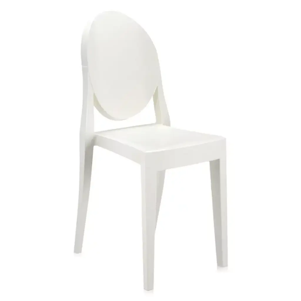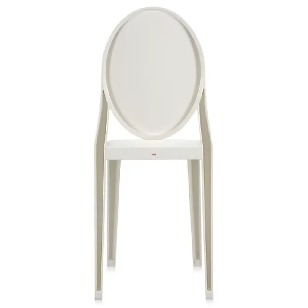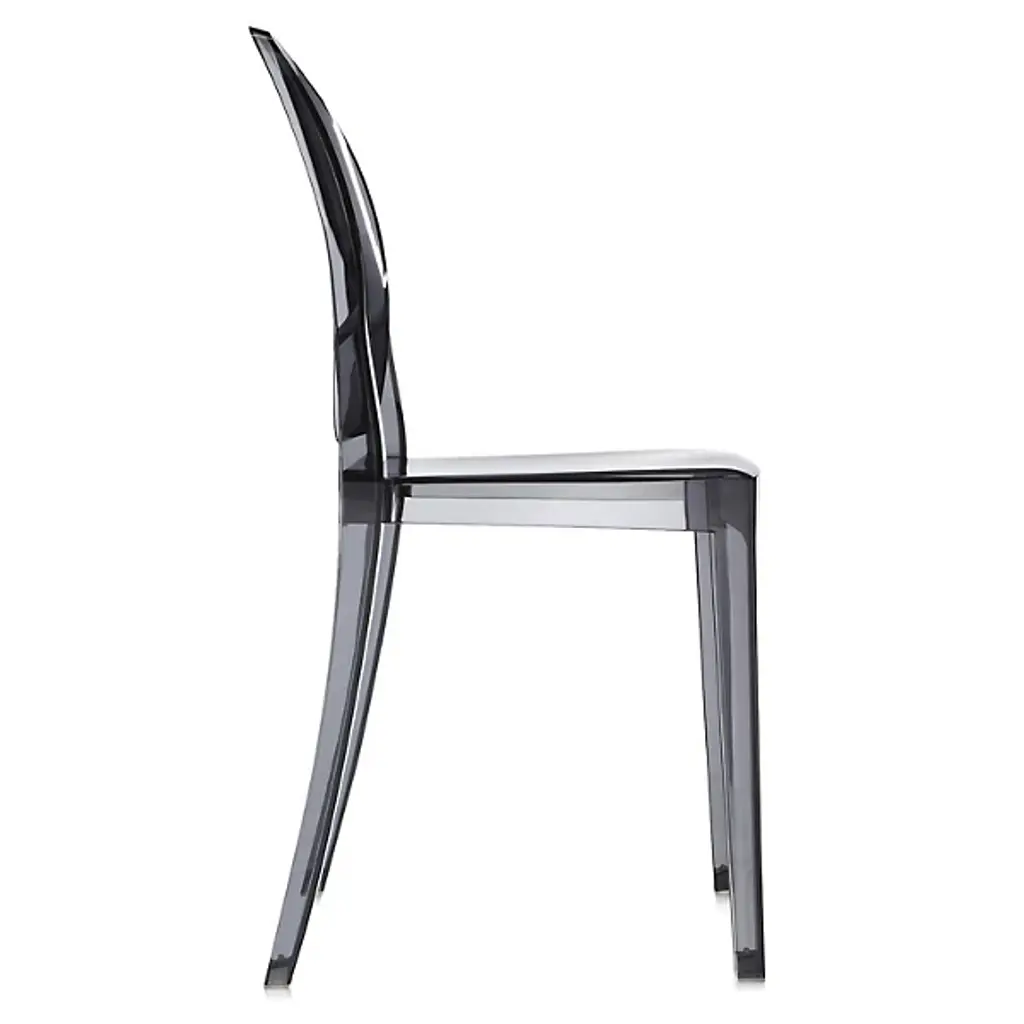 The Kartell Victoria Ghost Chair is a chair born of classic lines and modern technologies. The rounded backrest recalls the shape of antique medallions, with a linear and geometric seat completing the look. Made of polycarbonate formed out of a single mold. The result is stable and comfortable, charming and personable in a variety of settings indoors or out. Designed by Philippe Starck. Set of 2.