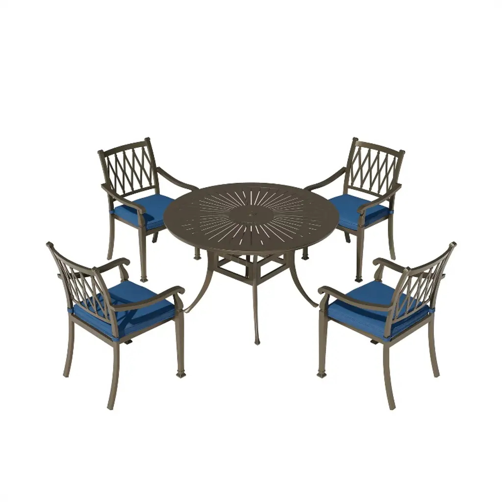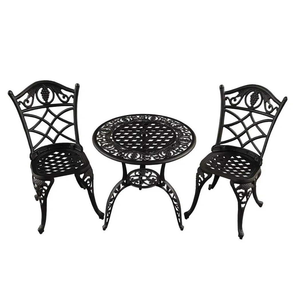 This Bronze Cast Aluminum Bistro Set stylishly blends style and practicality, perfect for outdoor dining spaces or cozy afternoon relaxation. Designed to enhance patios, balconies, and gardens, it offers a visually striking appearance that matches various themes, from traditional to modern aesthetics. Stylish Appearance: The rich bronze patina finish enhances the look of your outdoor area, making it a striking centerpiece.Quality Craftsmanship: Made with durable cast aluminum, this set is built to handle outdoor elements while keeping its style.Functional Design: With a built-in umbrella hole, it easily accommodates shade, making your outdoor time more enjoyable in warm weather.Compact Size: The medium-sized table and chairs are just right for small gatherings, providing comfort without crowding your space.Easy Maintenance: The materials resist UV rays and water, requiring little effort to keep them looking sharp.