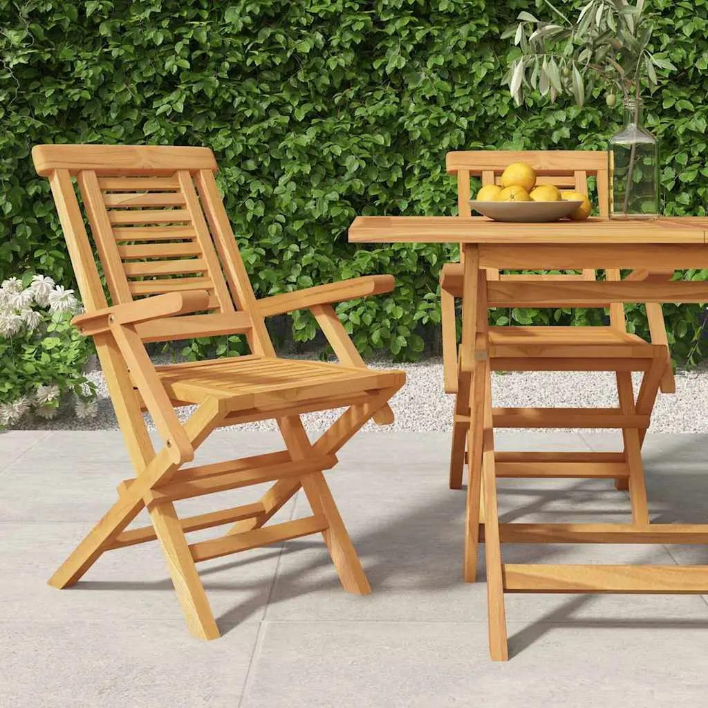 This set of teak folding garden chairs mixes elegance with practicality, making them perfect for any outdoor setting. Their inviting design has a smooth feel and natural finish that blends in well with patio furniture, creating a warm spot for chilling out or hosting guests during summer fun. Durable Construction: Made with solid teak wood, these chairs are built to last and can handle outdoor conditions.Space-Efficient: The foldable design makes them easy to store away when not in use.Versatile Use: Great for patios, balconies, or gardens, perfect for dining or relaxing.Comfort Features: With a supportive backrest and armrests, they ensure comfy seating even for long periods.Elegant Aesthetics: The natural brown teak color adds charm and warmth to your outdoor decor.