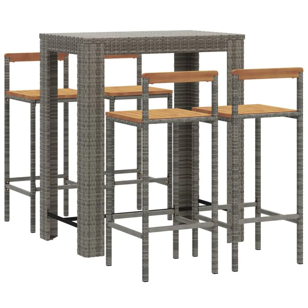 This 5-Piece Modern Garden Bar Set, crafted from high-quality Poly Rattan and solid Acacia wood, combines style and functionality to enhance any space. With its sleek grey finish and elegant design, it invites relaxation while offering a perfect spot for dining or social gatherings. Durable Materials: The combo of synthetic Poly Rattan and solid Acacia wood makes sure this set lasts long, perfect for outdoor and indoor use. The powder-coated steel frame adds extra sturdiness, resisting bending and rust.Comfortable Seating: With a thoughtful design and a footrest, each chair promises a comfy dining experience. Your mates will appreciate the supportive seating, making meals even more enjoyable.Versatile Use: This set is great for many settings, from casual balcony hangs to posh dinner parties. Its modern look fits in with various decor styles.Easy Assembly: Putting this set together is a breeze. With just a screwdriver, two people can enjoy their new furniture setting in no time, ready for their first meal or drink.Ideal Size: The bar table is well-sized at 39.4 in in length and 23.8 in in width, offering plenty of space for hosting five people comfortably. Perfect for small garden parties or family get-togethers.