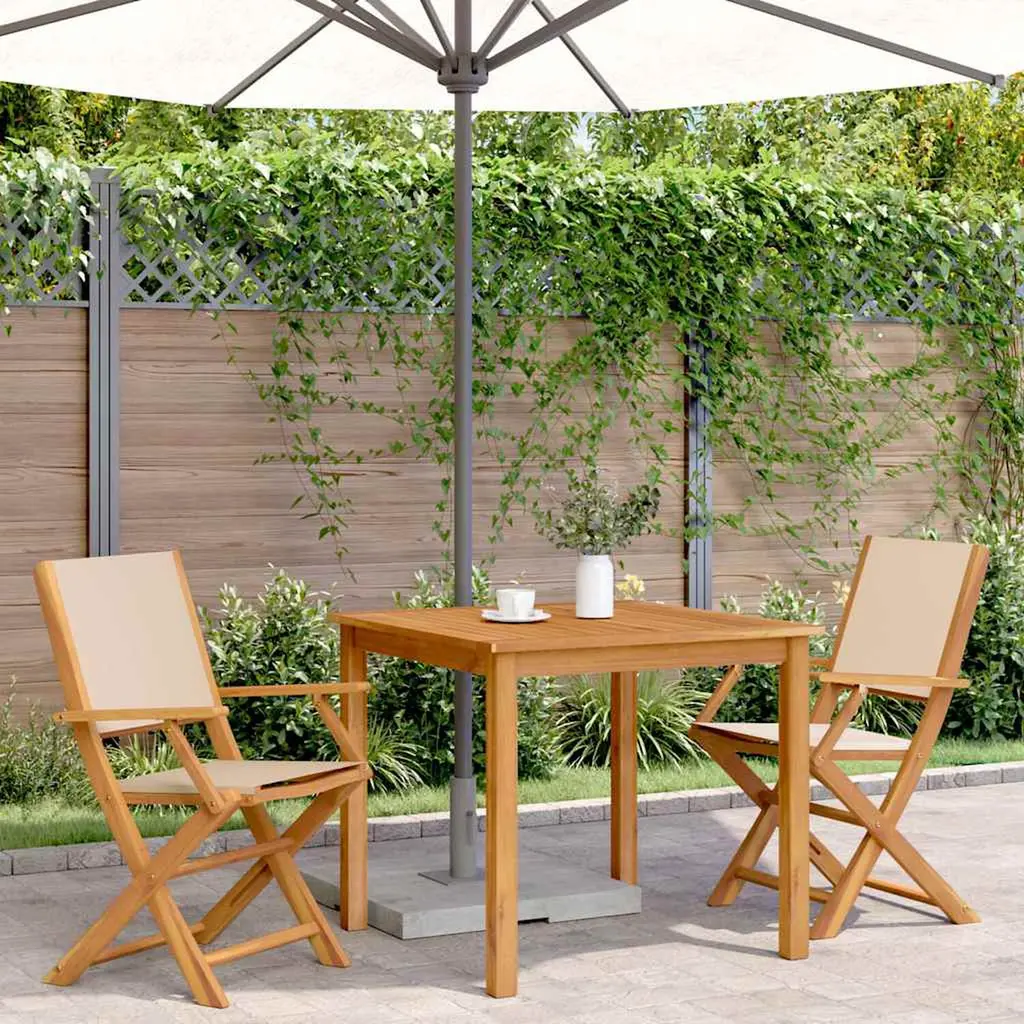 This garden chair set is a stylish and functional way to spruce up your outdoor areas. With its beige solid acacia wood build and sleek look, each chair fits nicely into different setups, making it a handy addition to any garden, patio, or balcony. Versatile outdoor seating: Made for easy use in gardens, patios, or balconies. Handy foldable feature: Folds down for compact storage or transport. Sturdy build: Made from solid acacia wood for long-lasting durability. Nice oiled finish: Protects against moisture and enhances the wood's natural look. Comfy design: Fits one adult comfortably, perfect for your relaxation needs.