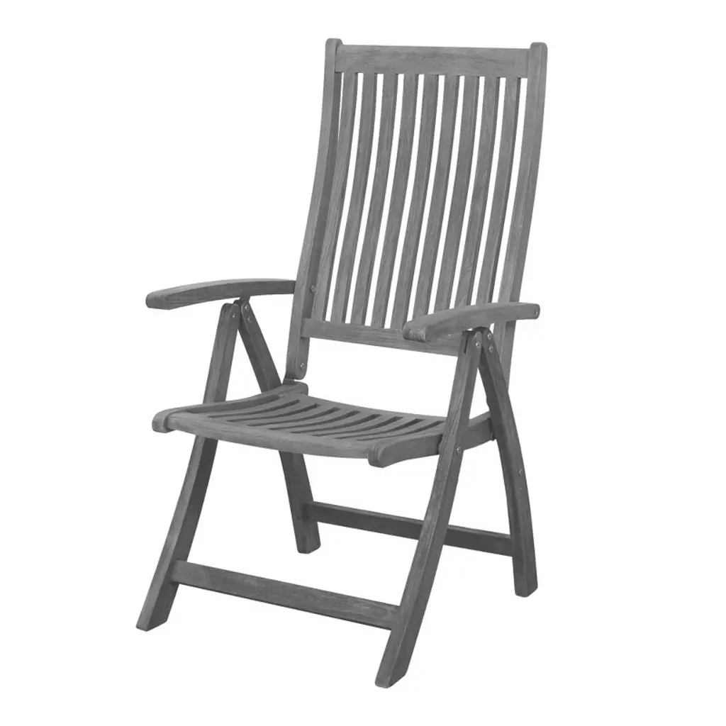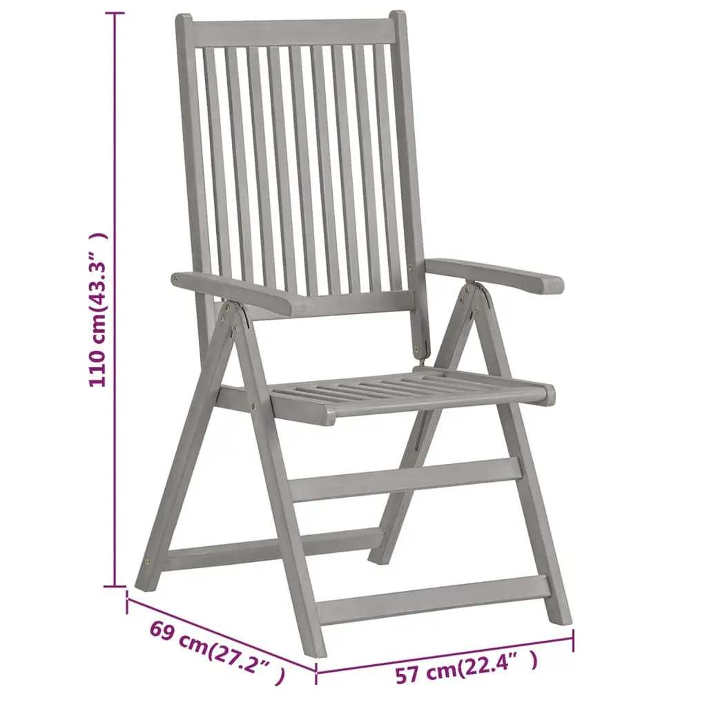 This outdoor garden chair set is all about practicality and style, offering comfy seating for any garden, balcony, or patio. With solid acacia wood and a charming grey wash finish, these reclining chairs not only look good but also let you relax in the sun or shade. Flexibility: Each chair has a 5-position adjustable backrest, so you can make your seating just how you like it. Whether you want to lounge, read, or have a meal outside, you can easily find the right angle to kick back and relax.Durability: Made from solid acacia wood, these chairs are ready for whatever Mother Nature throws at them while keeping their charm. Robust and stable, they'll have you and your friends settled in for ages.Stylish Finish: The grey wash finish isn't just about looks; it goes with all sorts of outdoor styles. This makes them a fab addition to any garden or patio setting, blending perfectly with your outdoor vibe.Versatile Use: Perfect for both dining and relaxing, these chairs can handle your entertaining needs. Whether it's a summer BBQ or dinner under the stars, they’ll make your outdoor dining experience grand.Ease of Maintenance: The UV resistant material means easy cleaning, so you can keep your chairs looking fresh without a hassle. A bit of regular cleaning will keep them inviting for all your get-togethers.