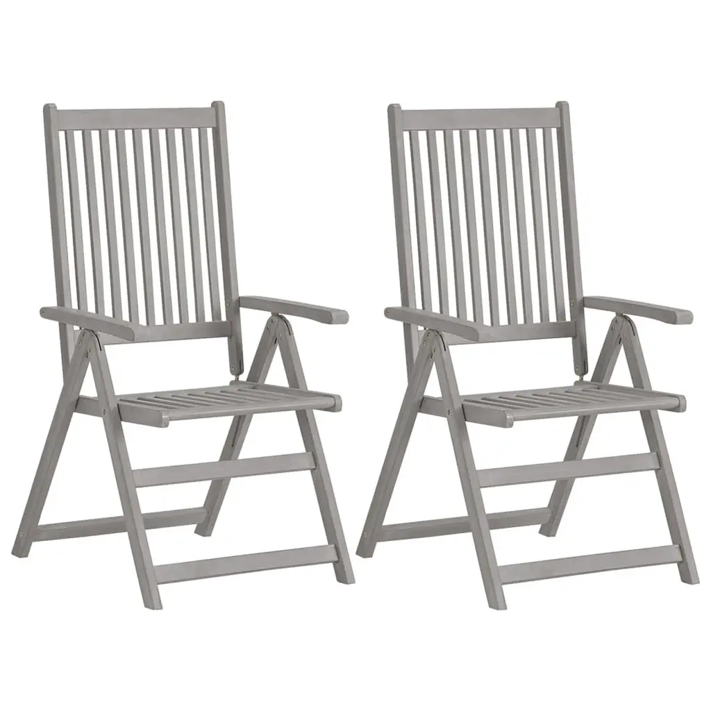 This outdoor dining chair set mixes style and practicality with its sleek design and sturdy build, perfect for laid-back chats over alfresco meals. With a smooth, grey finish, it fits right in on terraces or patios, inviting you to relax in comfort all day long. Comfortable Seating: Each chair features a backrest that can adjust to five angles, so you can find your sweet spot for lounging or dining under the stars.Robust Construction: Crafted from solid acacia wood, these chairs are not just comfy but built to last through all seasons.Stylish Cushions: The set comes with four cushions made from weather-resistant fabric, adding a touch of class while keeping you comfy.Easy Maintenance: The smooth, matte finish means you just need to wipe the chairs down with a cloth to keep them tidy.Versatile Use: Perfect for balconies, patios, or even garden dinners, this set accommodates four people for meals or a good book outdoors.