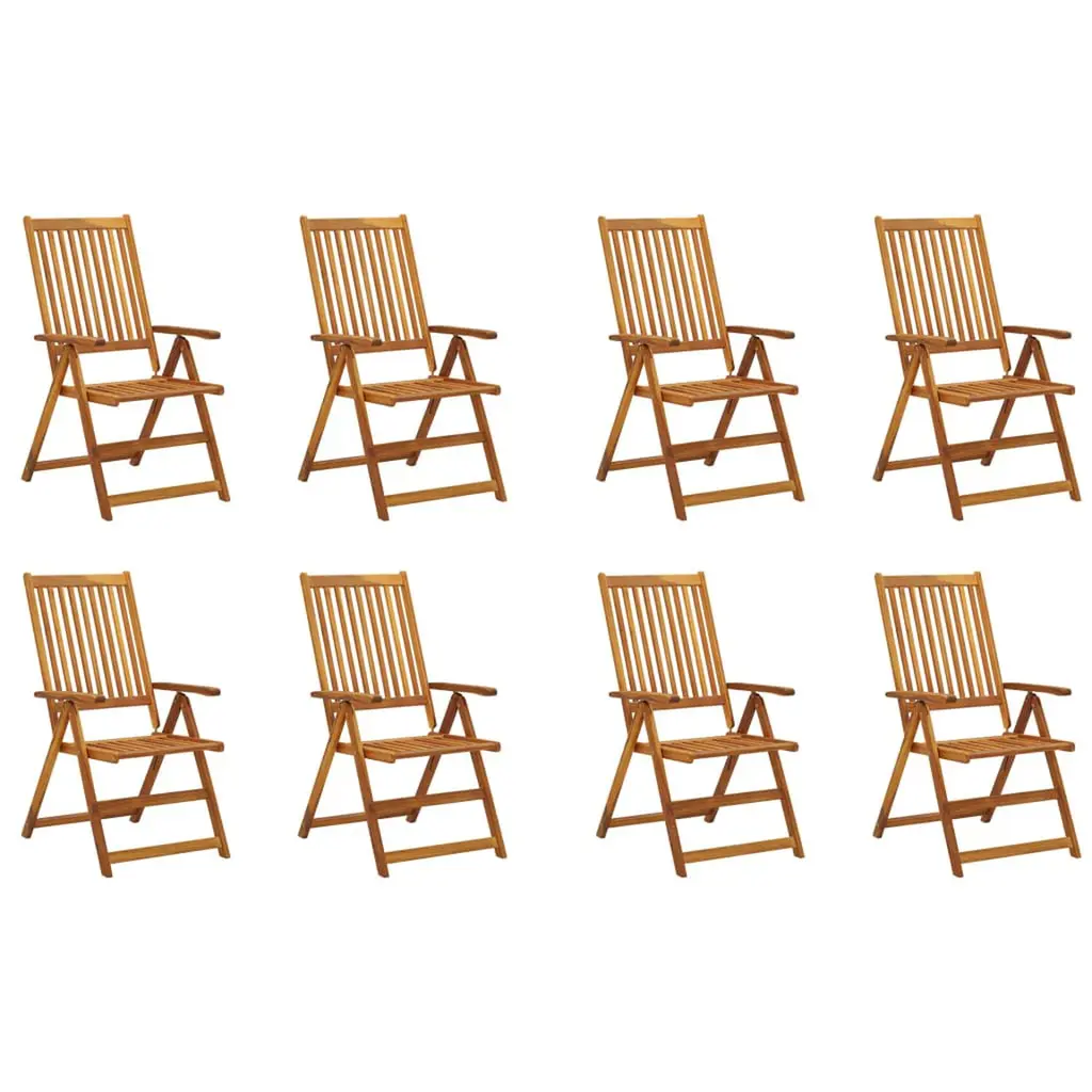 This 8-piece folding garden chair set mixes old-school style with modern practicality, perfect for outdoor dining or chilling out. Ideal for gatherings on the patio or terrace, every chair has a smooth finish and classic lines, adding a stylish touch to any outdoor space. Adjustable Comfort: Each chair has a multi-position backrest, letting you find just the right angle for sitting back, making long meals or chillouts super comfy.Durable Construction: Crafted from solid acacia wood, this set’s ready for outdoor use without losing its looks.Easy Storage: The folding design makes these chairs easy to store, perfect for smaller areas or taking along to gatherings.Weather Resistant: With an oiled finish, these chairs can handle various outdoor conditions, keeping them looking good for ages.Complete Set: This set comes with 8 chairs, all designed for comfort, making it ideal for family get-togethers or hosting friends.