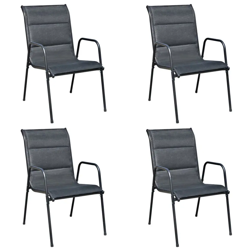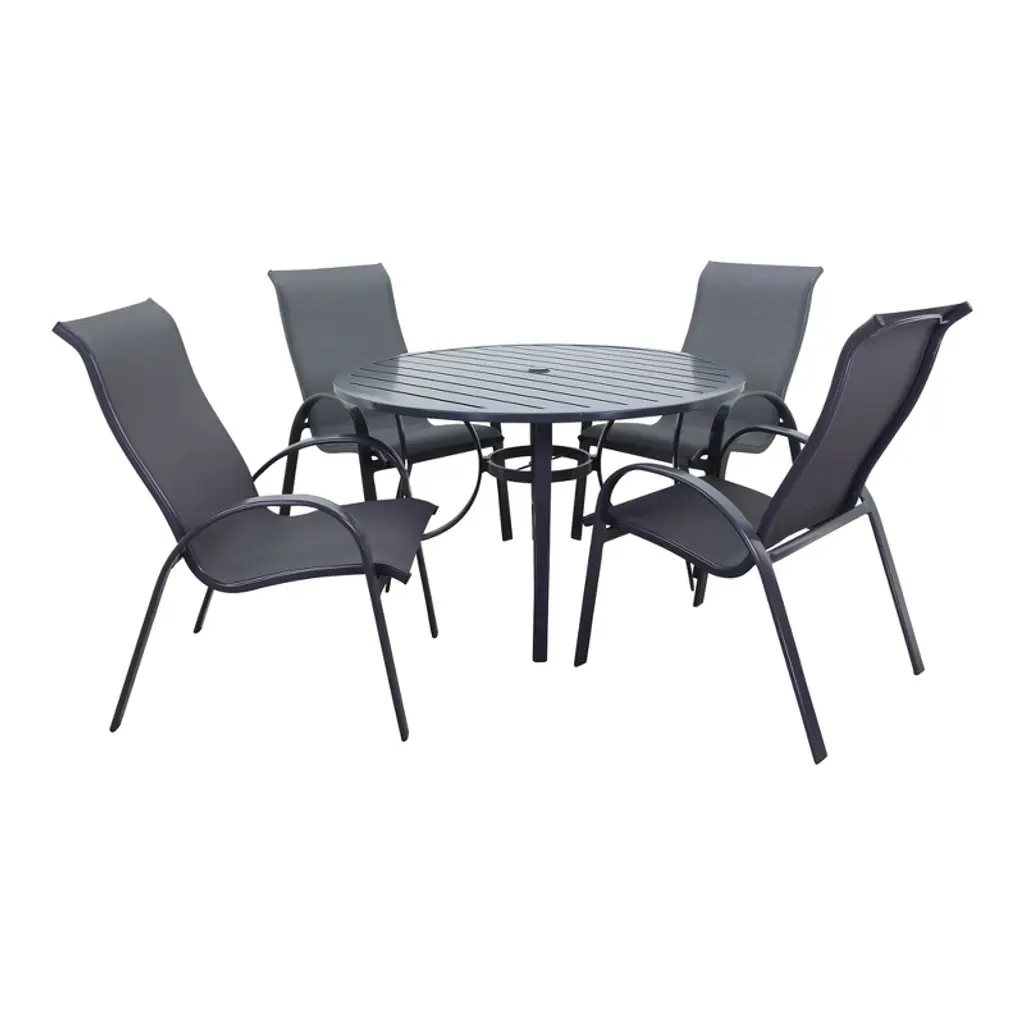 This 5-piece Outdoor Dining Set features a spacious round table and four comfy chairs, designed to elevate your outdoor dining experience. With a sleek black finish and a clear tempered glass top, it brings modern elegance to any patio, whether it’s a cozy balcony or a big garden. Strong Build: The set’s made from tough powder-coated steel, made to hold up against daily outdoor wear while staying sturdy.Comfortable Seating: The textilene fabric used for the seats looks great and is a breeze to clean, keeping them fresh.Weather Resistant: With smart design using waterproof materials, this set is ready for all kinds of weather, perfect for year-round use.Parasol Compatible: A central hole in the table lets you easily attach a compatible umbrella, giving you some shade on sunny days.Stackable Design: You can stack the chairs neatly for easy storage, keeping your outdoor area tidy when not in use.