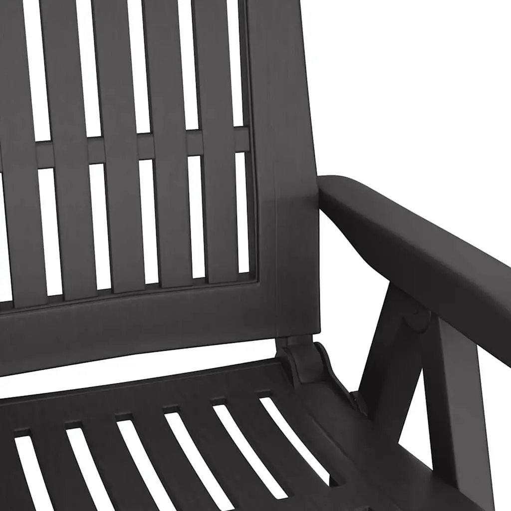 This garden reclining chair set is designed with a modern vibe to bring style and comfort to your outdoor area. The sleek anthracite color and smooth texture make it look sophisticated, perfect for balconies, patios, and terraces. Adjustability: The multifunctional backrest can be adjusted to four different angles, accommodating any preference for relaxation. Whether you’re lounging in the sun or enjoying a cool evening breeze, this feature allows you to customize your seating experience for maximum comfort. Foldable Design: These chairs have a foldable structure, making them easy to store and transport. Ideal for those who love to bring comfort to picnics or beach outings, you can easily pack them away when not in use. Durable Material: Made from high-quality synthetic polypropylene, these chairs are built to withstand the elements while keeping their stylish appearance. This weather-resistant material ensures longevity and ease of maintenance, giving you peace of mind. Modern Aesthetic: The matte finish and sleek lines of these chairs give them a contemporary look that will complement any outdoor decor. They effortlessly enhance your garden or patio with a touch of sophistication. Comfortable Seating: Designed for maximum comfort with a depth of 19.3 in. and width of 17.7 in., these chairs accommodate a relaxed posture, making them an excellent choice for outdoor dining or lounging.
