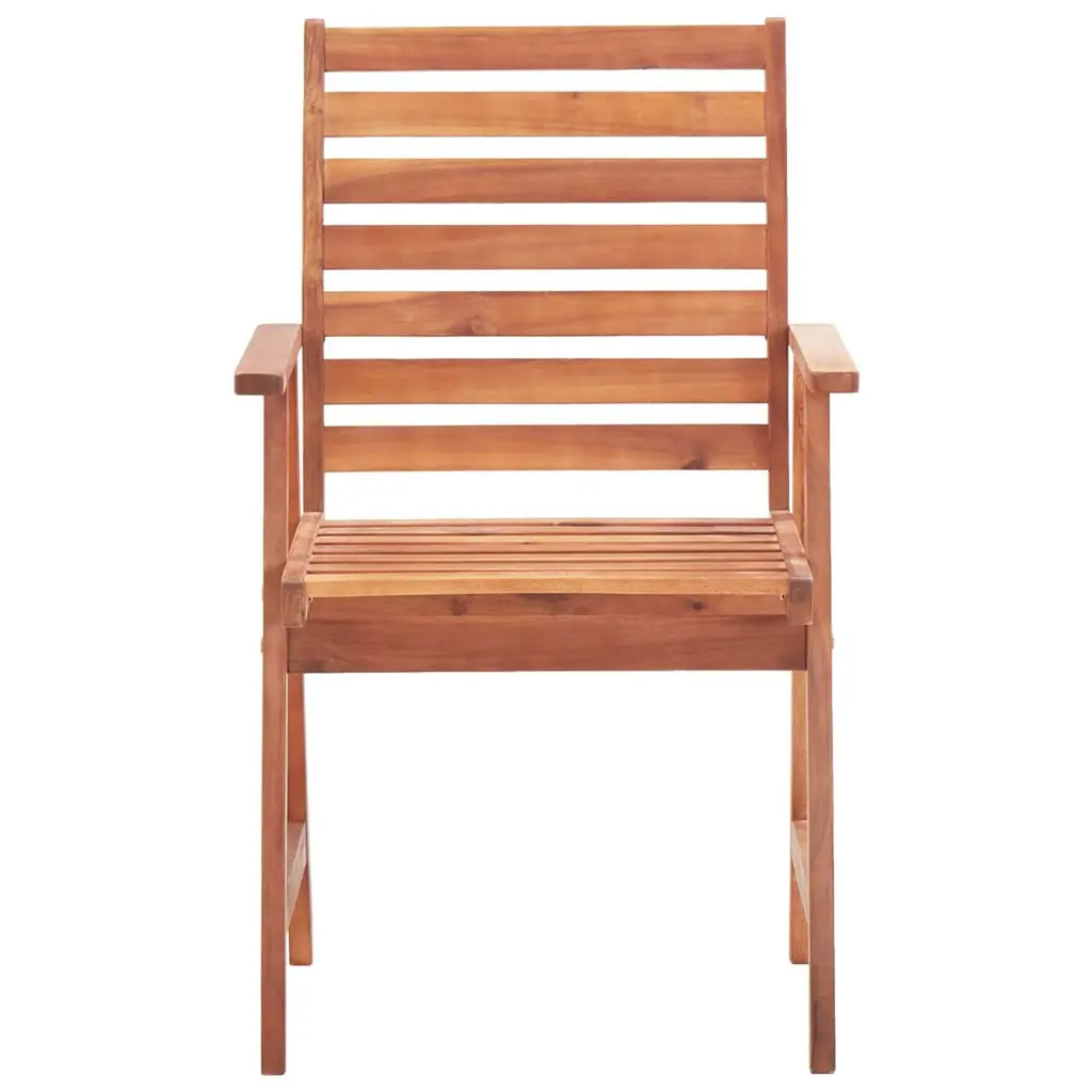 This set of 2 outdoor dining chairs mixes style and comfort, perfect for patio meals or lounging in the garden. Highlighting a modern design, these chairs have solid acacia wood frames and soft polyester cushions for a snug fit that matches outdoor vibes. Weather Resistant: These chairs have an oil finish protecting the wood from moisture, ensuring they last in various conditions.Comfy Design: Cushions are made with a tie closure that keeps them in place and gives a nice seating feel.Versatile Use: Great for outdoor parties, these chairs fit well on romantic balconies or lively family get-togethers in the garden.Stylish & Functional: The modern design goes well with any outdoor decor, inviting relaxed dining experiences.Dimensions: Each chair is 24.4 in wide, 19.7 in long, and 36.2 in high, balancing easy portability with stability.