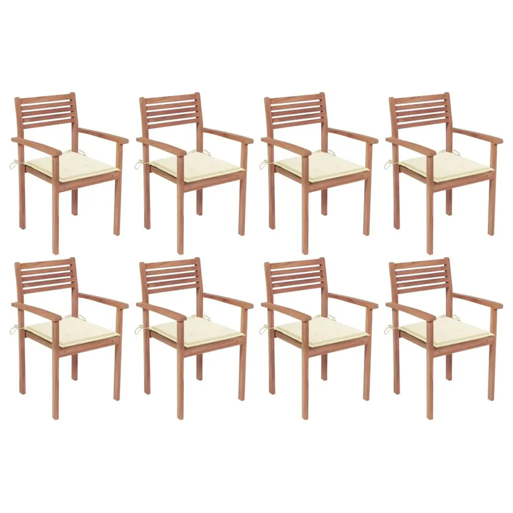 This set of 8 patio dining chairs perfectly combines comfort and style. Skillfully made from solid teak wood, these chairs not only boost your outdoor dining but also look awesome in your garden furniture collection. Picture gathering outdoors, surrounded by nature, enjoying meals with friends and family, while the cushions add extra support and match the rich, natural look of the teak. The combination of solid teak wood and weather-resistant cushions means this set is long-lasting and comfy.Each chair’s rustic design adds character and warmth to outdoor spots.These chairs are perfect for gatherings, fitting up to 8 people comfortably around a dinner table.With their robust build, each chair provides great stability, making them reliable for frequent use.Easy to maintain with simple cleaning that keeps the teak finish looking nice.