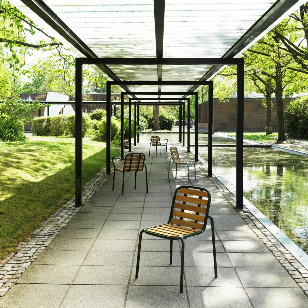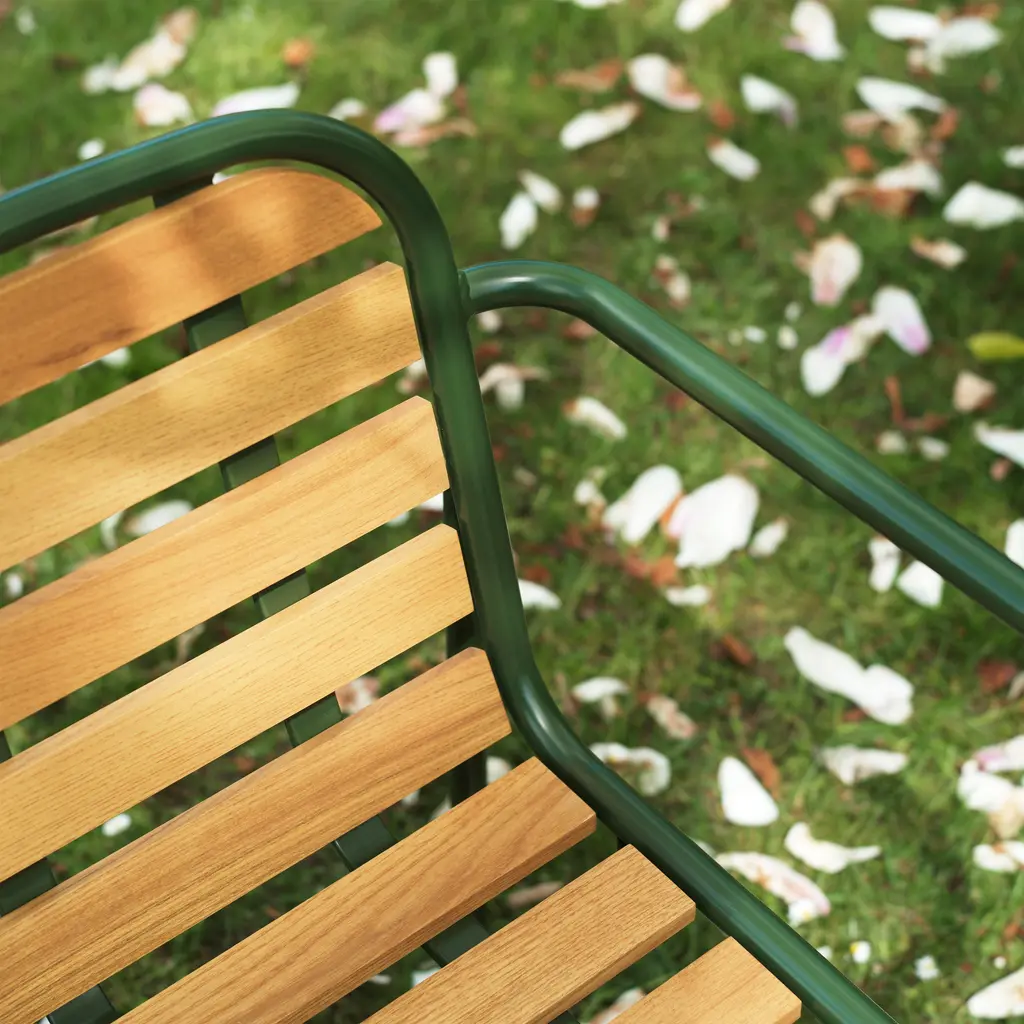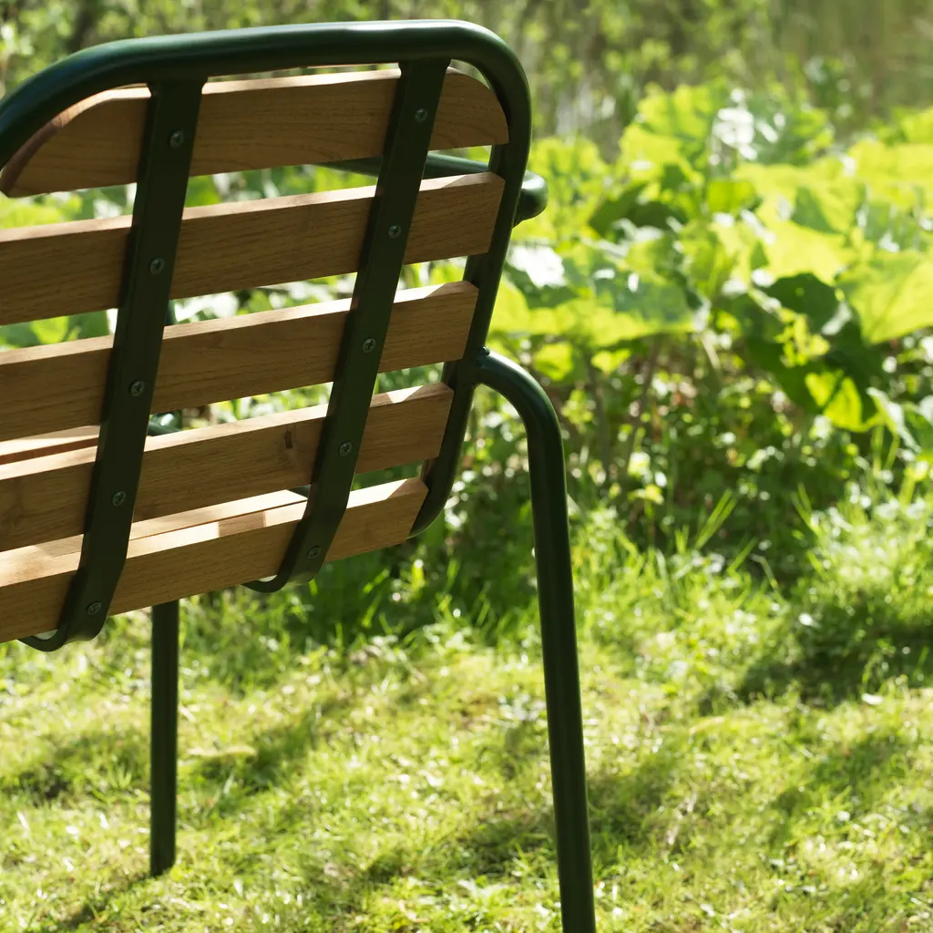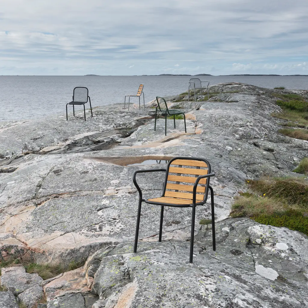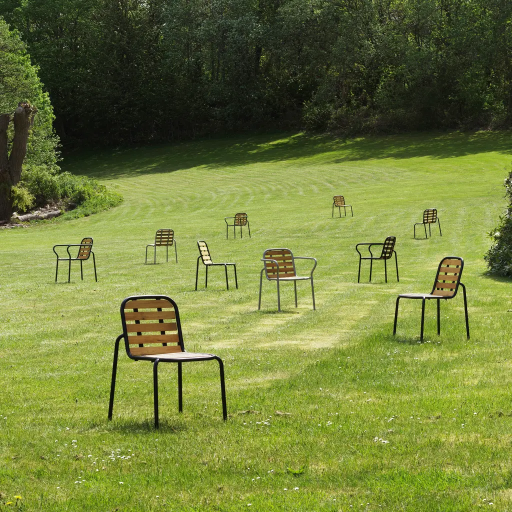 The Vig Stacking Armchair is a versatile outdoor seating option crafted from durable double powder-coated steel, making it ideal for extended outdoor use while maintaining its sleek appearance. Its stackable design makes it highly functional for flexible seating arrangements. The chair comes with a simple seat made from oiled robinia, free of excessive decoration, highlighting the refined take on outdoor dining. Available in colors black, grey, and dark green, the Vig collection offers a cohesive collection of outdoor furniture.