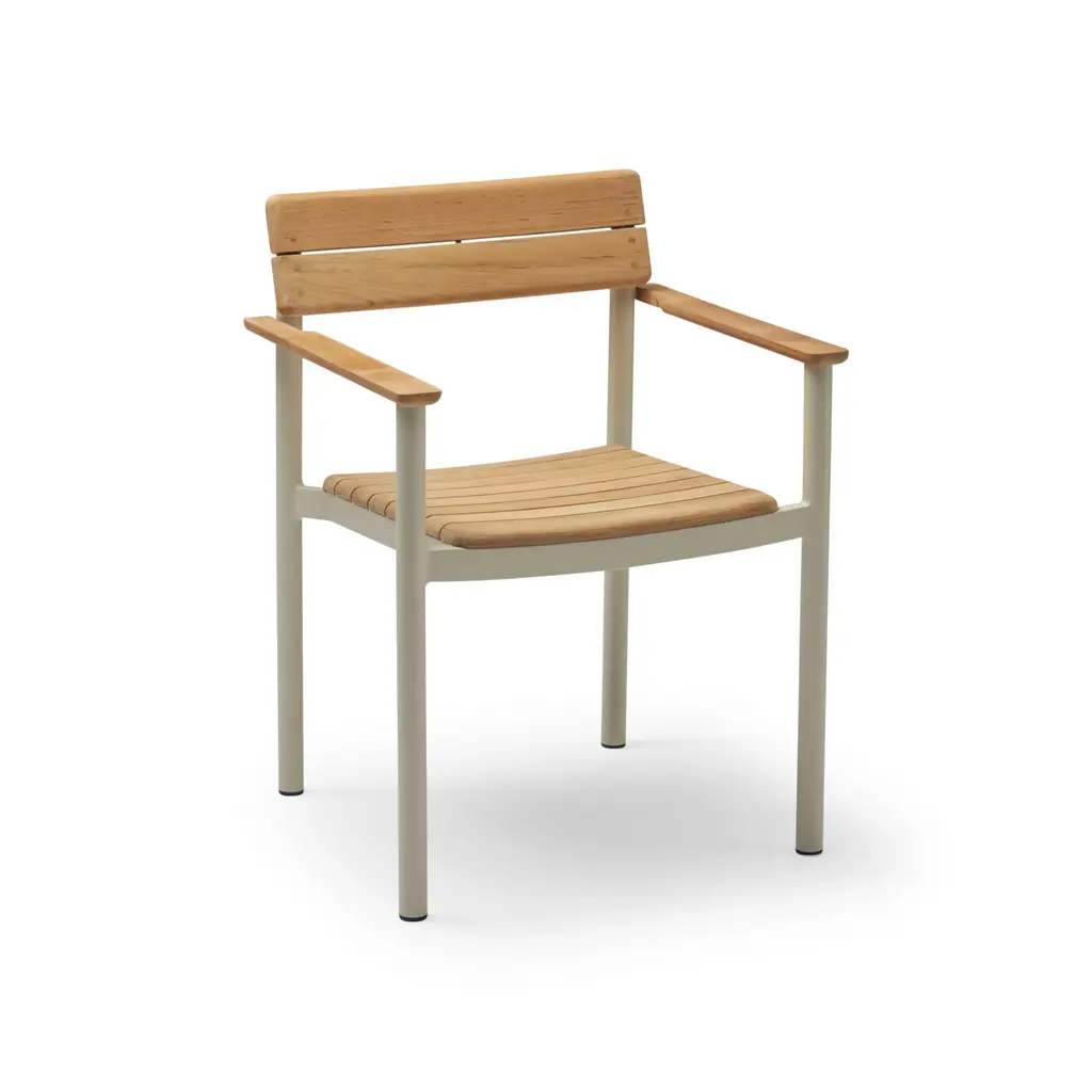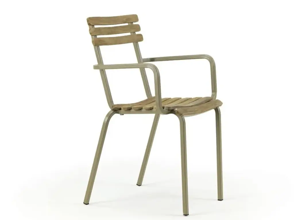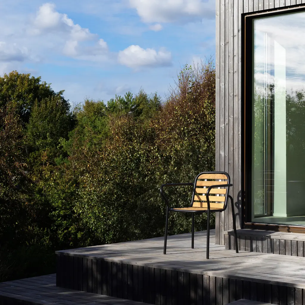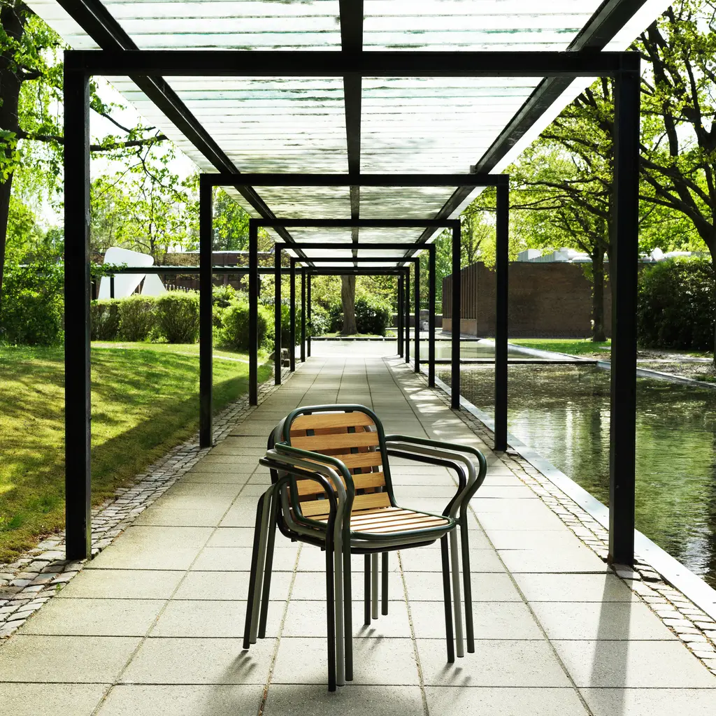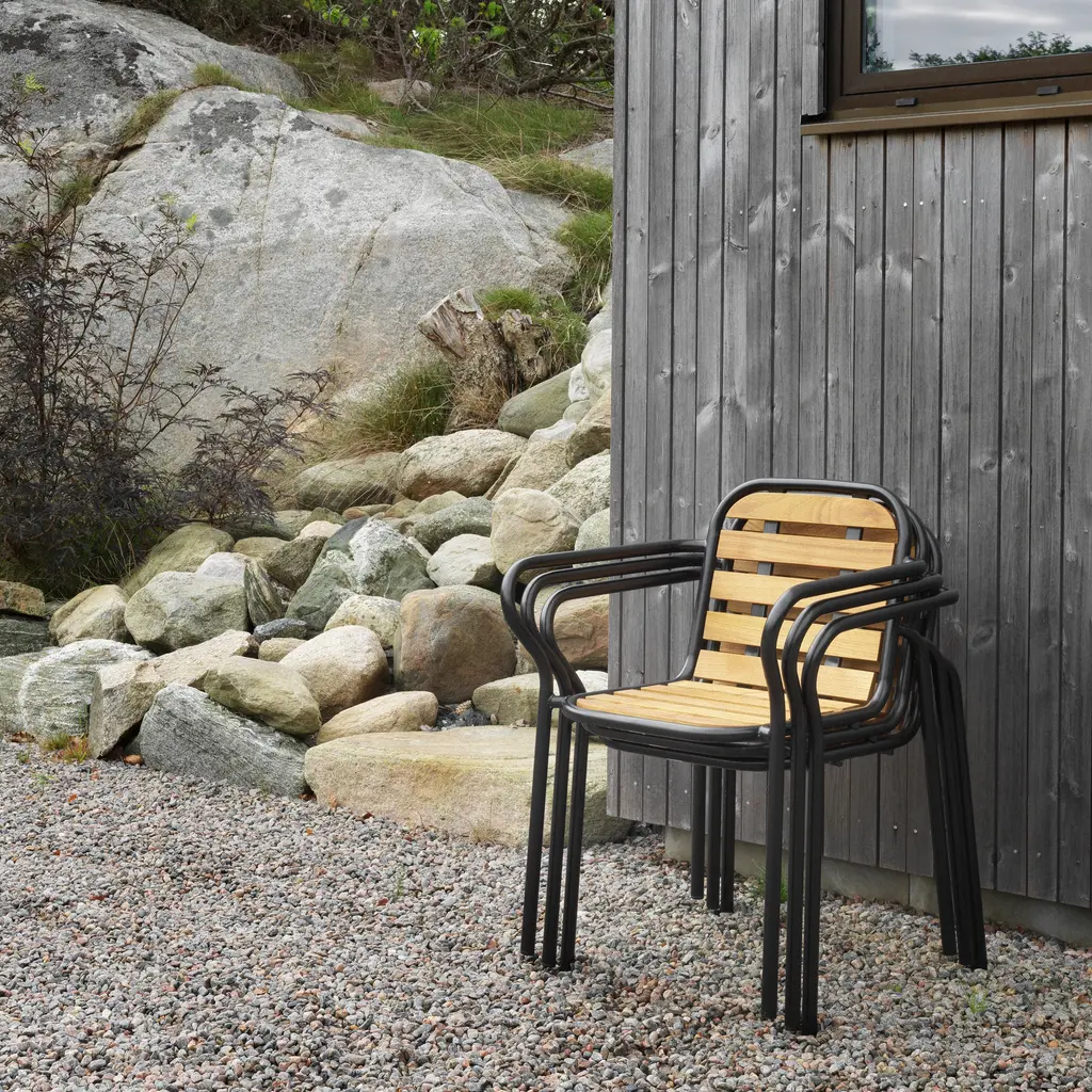 The Vig Stacking Armchair is a versatile outdoor seating option crafted from durable double powder-coated steel, making it ideal for extended outdoor use while maintaining its sleek appearance. Its stackable design makes it highly functional for flexible seating arrangements. The chair comes with a simple seat made from oiled robinia, free of excessive decoration, highlighting the refined take on outdoor dining. Available in colors black, grey, and dark green, the Vig collection offers a cohesive collection of outdoor furniture.