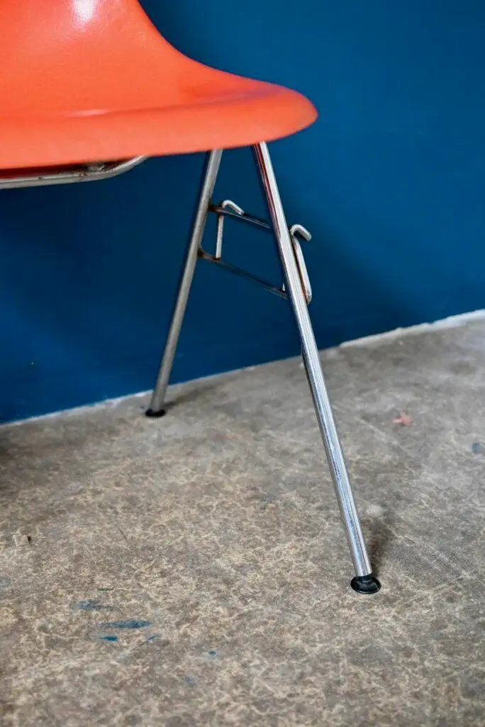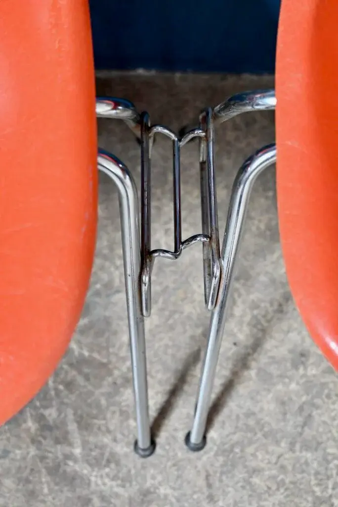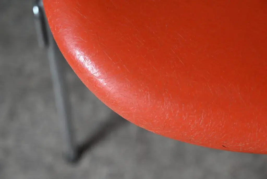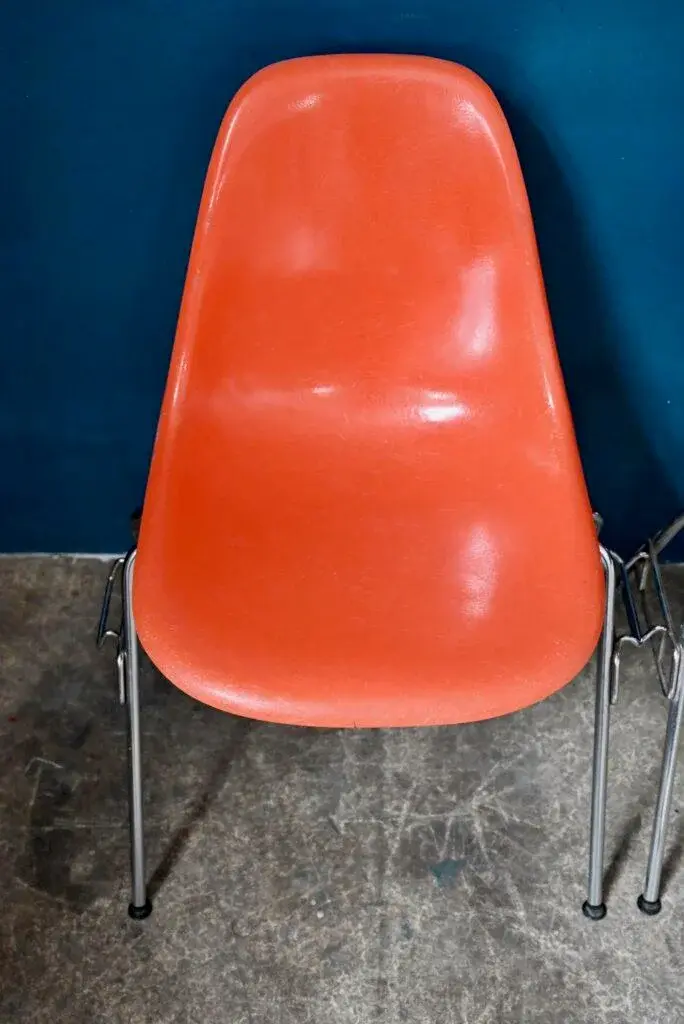 Designed by Charles & Ray Eames in the 1950s, the particular lines and innovative material of these chairs have left their mark on the history of design. Chrome-plated DSS base and fiberglass seat shell, this colorful series of 4 chairs was produced by Herman Miller in the 60s. Orange sixties, these pop chairs have not aged a bit\. Comfort, remarkable design and vibrant color, the Eames Plastic Chairs are a sure value! This series of chairs is superb. Side Chair DSS model by Charles & Ray Eames, the base is chrome and the seat shell is made of polyester resin and fiberglass. The shell sometimes has a few scratches but no defects, nothing but very normal for chairs produced by Herman Miller in the 1960s (edition 1959 to 1972). The skates are original. The chairs are signed Herman Miller Fehlbaum production on the shell. The series is made up of 4 pieces, it is possible to complete this series. This piece has an attribution mark, I am sure that it is completely authentic and take full responsibility for any authenticity issues arising from misattribution