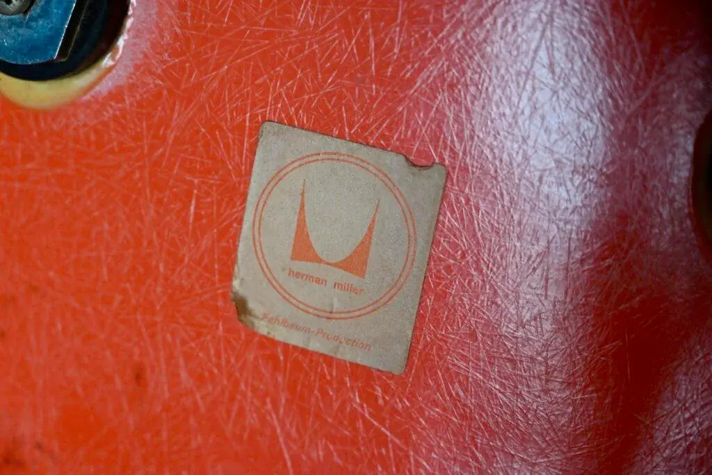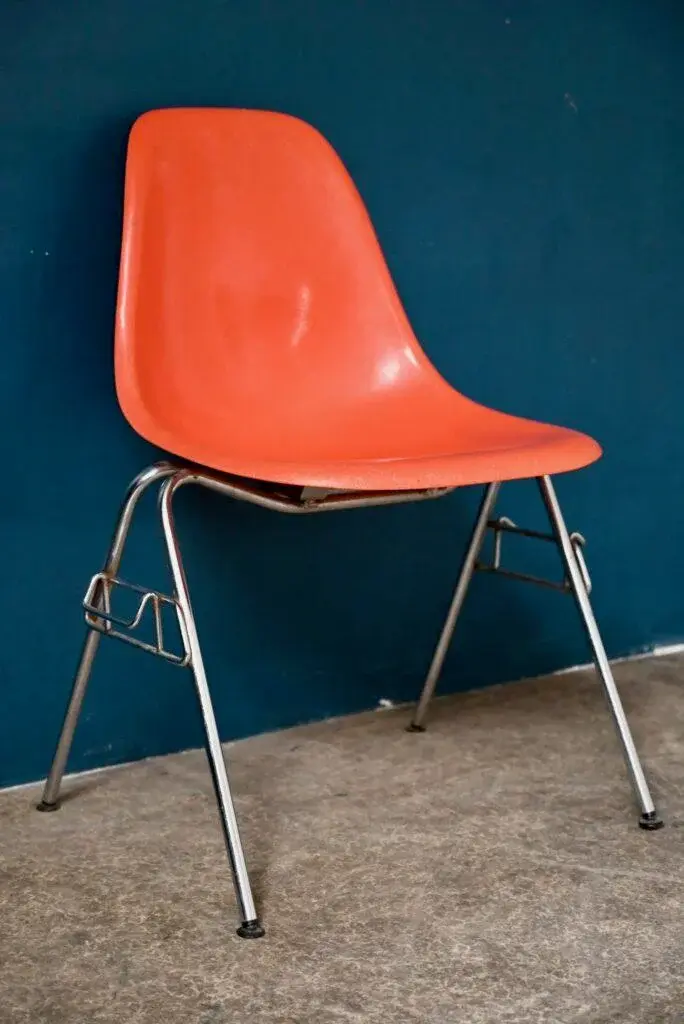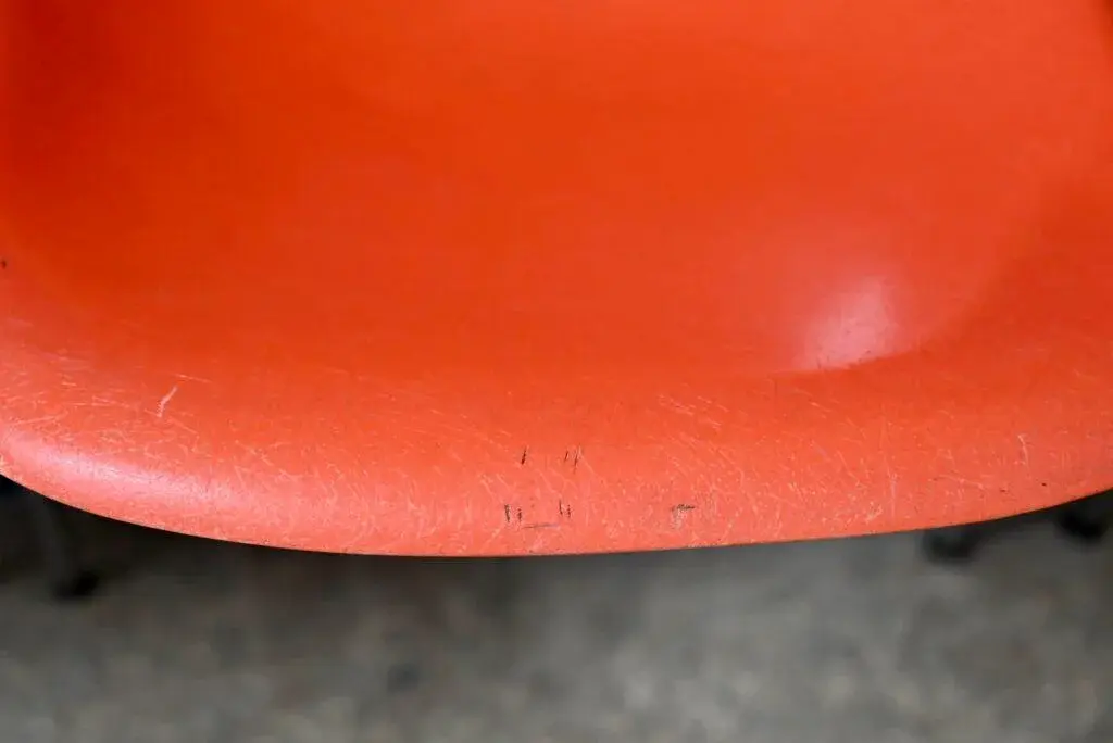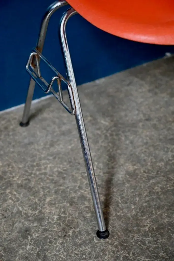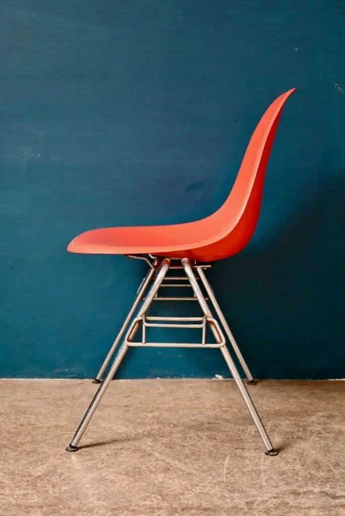 Designed by Charles & Ray Eames in the 1950s, the particular lines and innovative material of these chairs have left their mark on the history of design. Chrome-plated DSS base and fiberglass seat shell, this colorful series of 4 chairs was produced by Herman Miller in the 60s. Orange sixties, these pop chairs have not aged a bit\. Comfort, remarkable design and vibrant color, the Eames Plastic Chairs are a sure value! This series of chairs is superb. Side Chair DSS model by Charles & Ray Eames, the base is chrome and the seat shell is made of polyester resin and fiberglass. The shell sometimes has a few scratches but no defects, nothing but very normal for chairs produced by Herman Miller in the 1960s (edition 1959 to 1972). The skates are original. The chairs are signed Herman Miller Fehlbaum production on the shell. The series is made up of 4 pieces, it is possible to complete this series. This piece has an attribution mark, I am sure that it is completely authentic and take full responsibility for any authenticity issues arising from misattribution