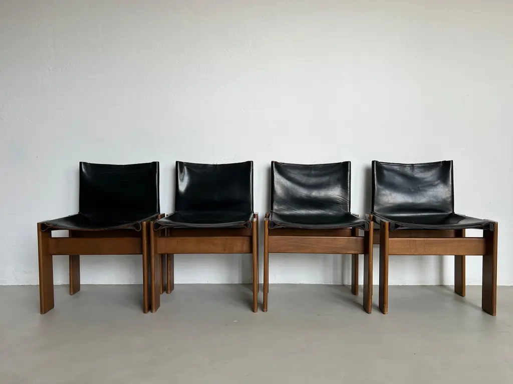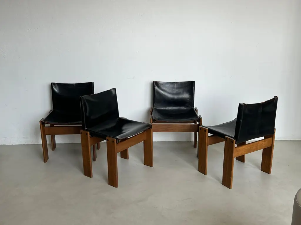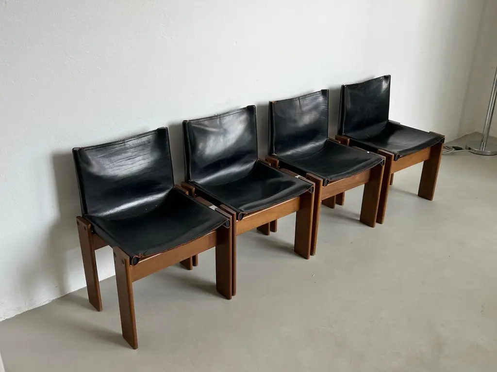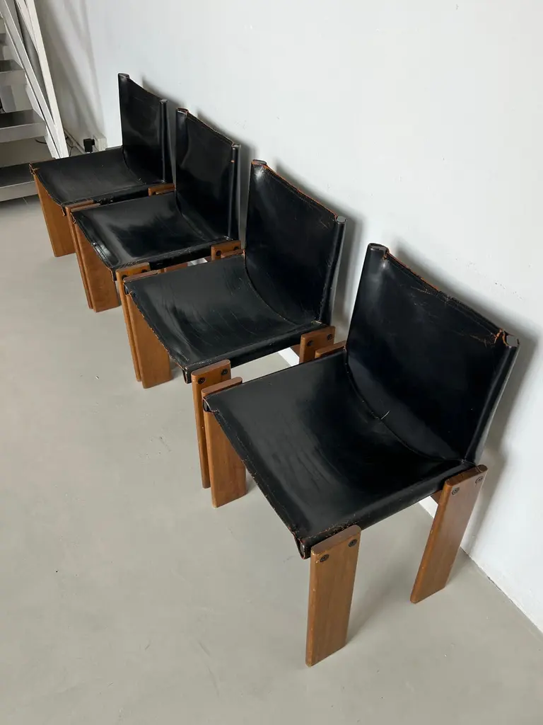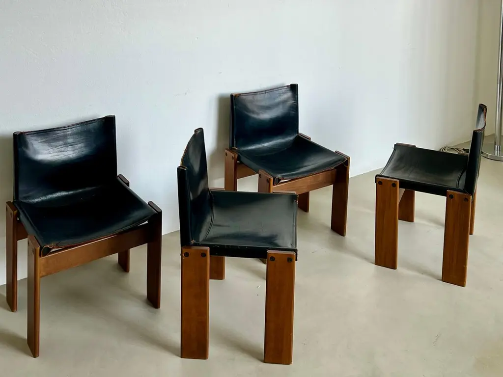4 Dining Chairs - Monk by Afra e Tobia Scarpa The price indicated is for the single chair .Offered for sale is a rare set of 4 "Monk" dining chairs, designer by Afra & Tobia Scarpa for Italian furniture brand Molteni and launched in 1973. With a walnut frame and a black thick leather seats , the chairs are penned in the essential and geometric style that always defined the celebrated couple of designers and is also found in the 121 chairs for Cassina or the Africa chairs for Maxalto.Spinzi is a Milano based creative atelier specialised in furniture design as well as sourcing and trading relevant mid-century collectible design. Check out our storefront and website for a constantly updated selection!Increasingly rare and extremely sought after, the Monk chairs are a timeless example of Italian design, and are fit for virtually any interior - from a wabi sabi, minimal country retreat to a townhouse furnished with the finest collectible pieces. These 4 chairs are in untouched original conditions, and show signs of their age. While the frame is in good conditions, the leather has some crack and and fading that give the chairs a particular character; there are no major structural issue, they have been used and they can be still used as they are but you might want to reupholster them if what you're looking for a perfect item.