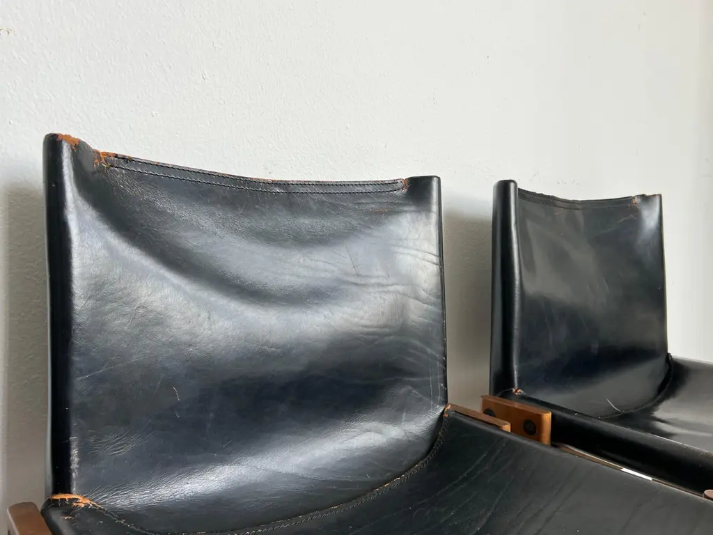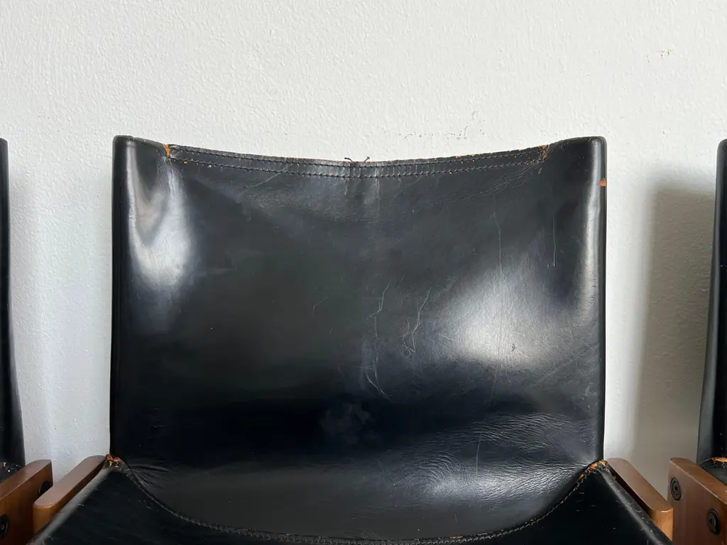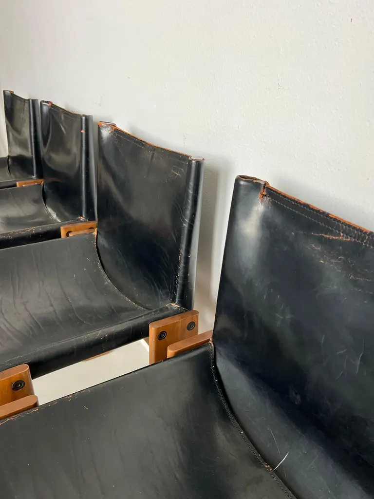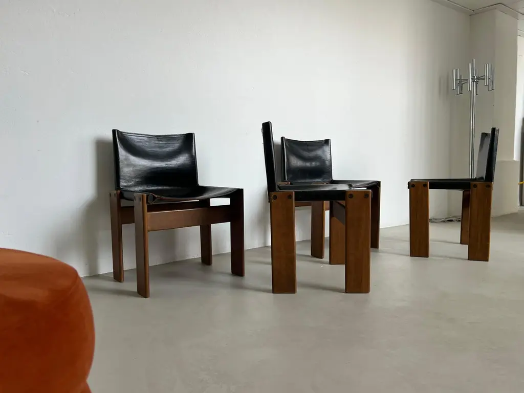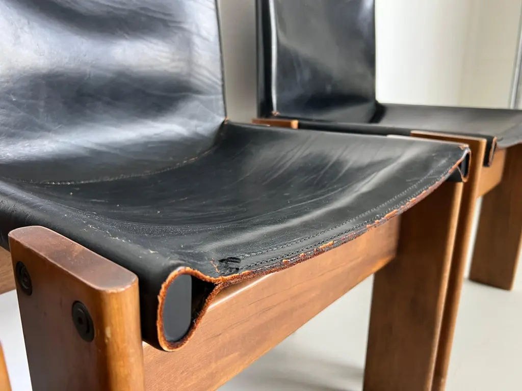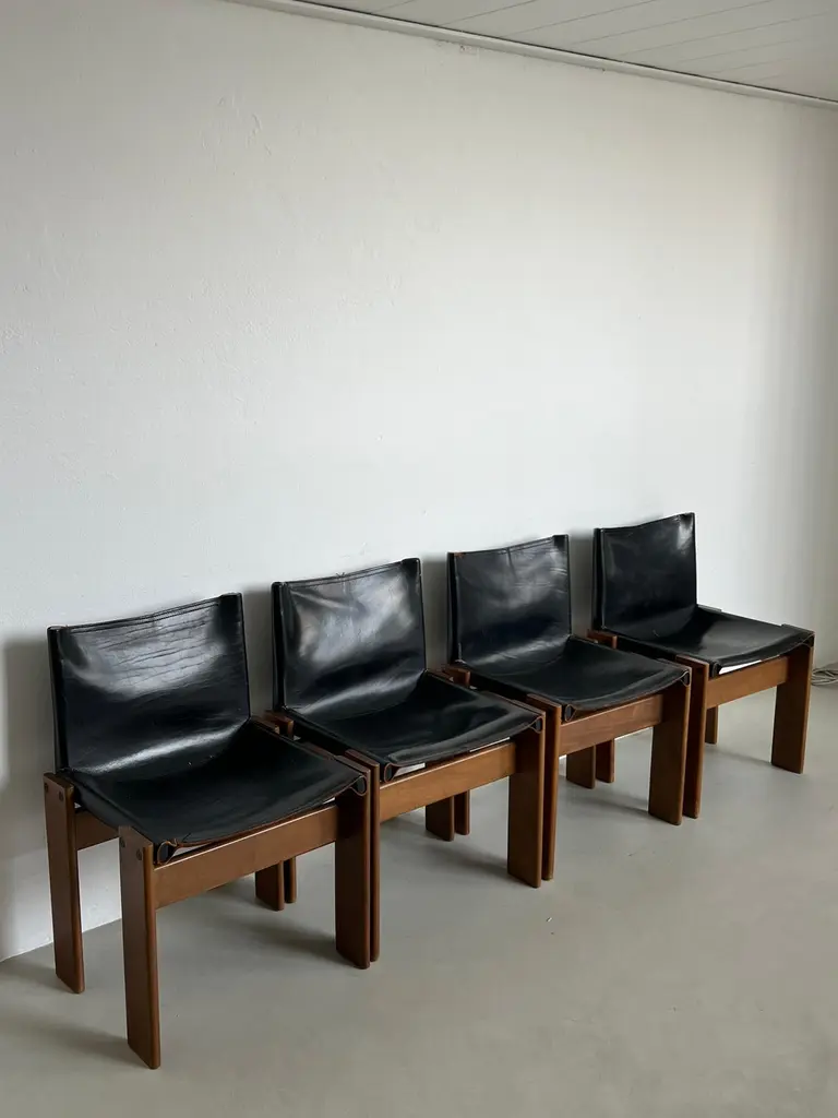 4 Dining Chairs - Monk by Afra e Tobia Scarpa The price indicated is for the single chair .Offered for sale is a rare set of 4 "Monk" dining chairs, designer by Afra & Tobia Scarpa for Italian furniture brand Molteni and launched in 1973. With a walnut frame and a black thick leather seats , the chairs are penned in the essential and geometric style that always defined the celebrated couple of designers and is also found in the 121 chairs for Cassina or the Africa chairs for Maxalto.Spinzi is a Milano based creative atelier specialised in furniture design as well as sourcing and trading relevant mid-century collectible design. Check out our storefront and website for a constantly updated selection!Increasingly rare and extremely sought after, the Monk chairs are a timeless example of Italian design, and are fit for virtually any interior - from a wabi sabi, minimal country retreat to a townhouse furnished with the finest collectible pieces. These 4 chairs are in untouched original conditions, and show signs of their age. While the frame is in good conditions, the leather has some crack and and fading that give the chairs a particular character; there are no major structural issue, they have been used and they can be still used as they are but you might want to reupholster them if what you're looking for a perfect item.