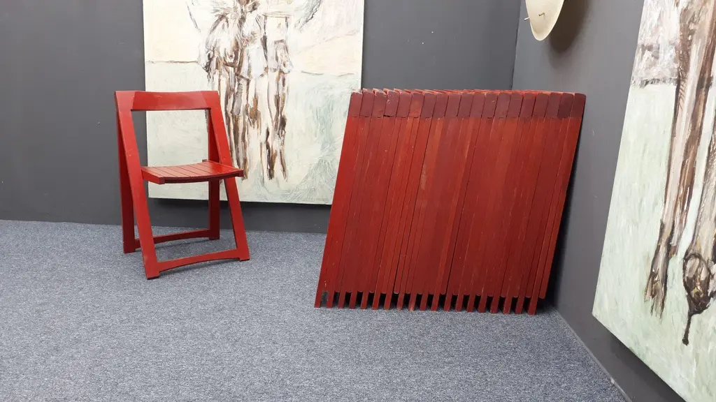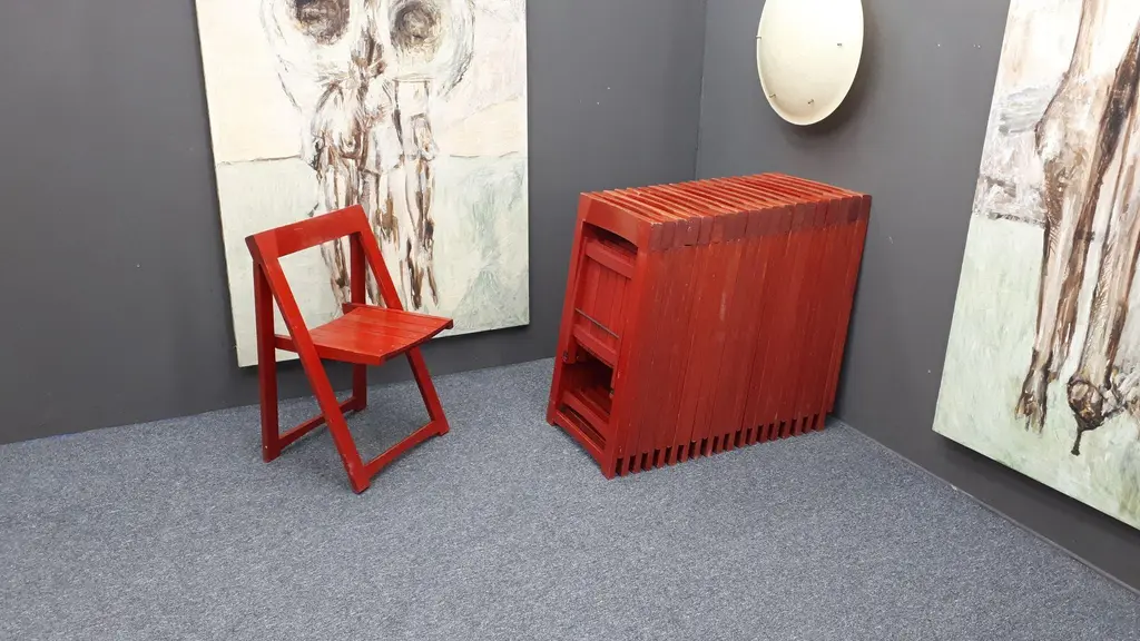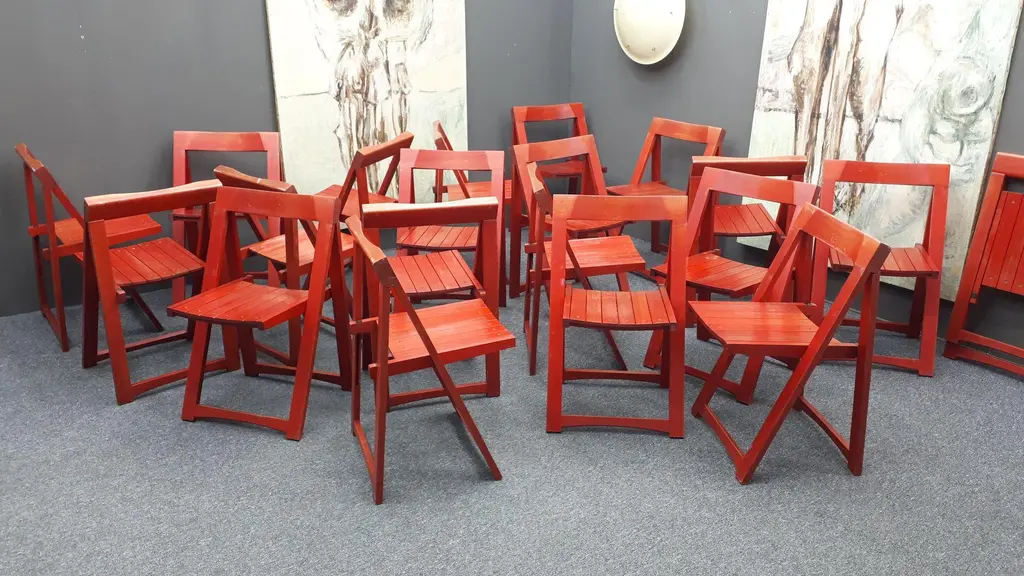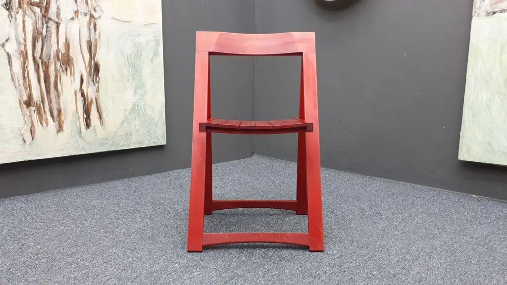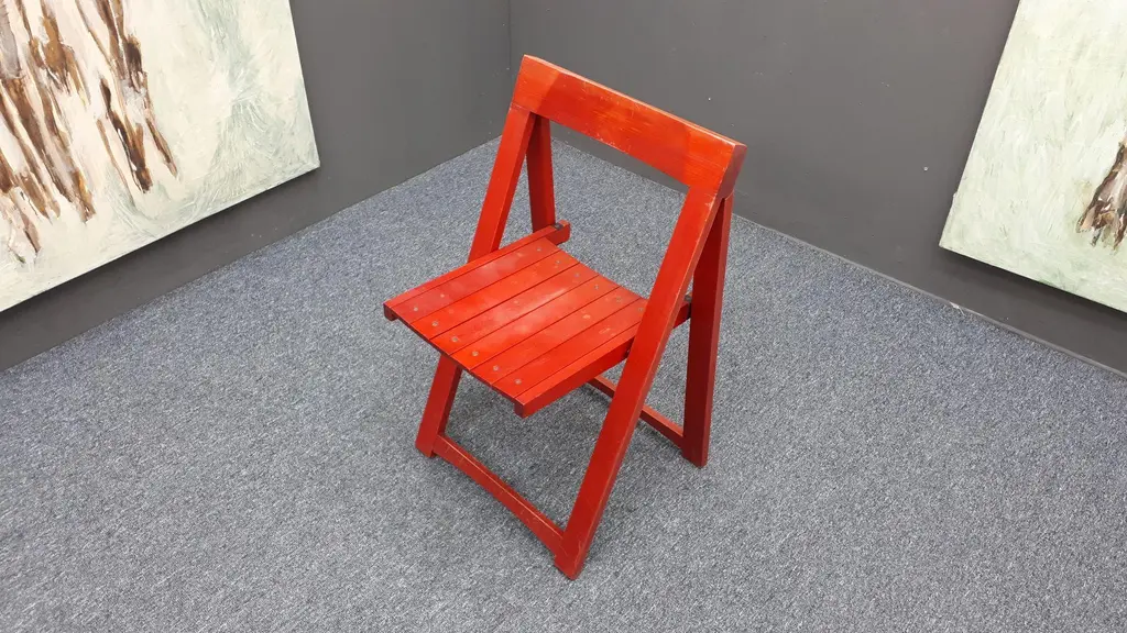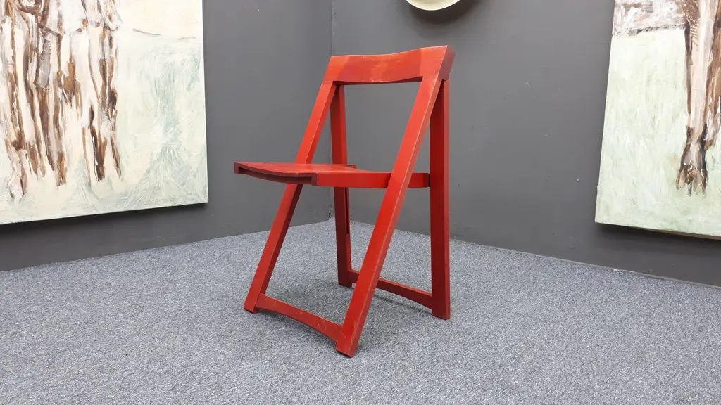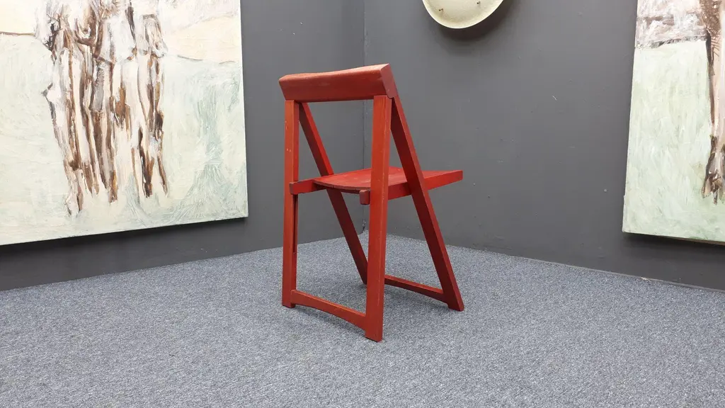 Practical and very sturdy folding chairs from Italy. Designed by Aldo Jacober in the 1960s. They are made of beechwood and painted red. They are suitable as dining room chairs, waiting rooms for events, etc. The chairs are very stable and robust. The folding chairs are thoroughly cleaned and polished. I have official proof of authenticity such as vintage catalogs, designer records, or other literature sources and take full responsibility for any authenticity issues arising from misattribution