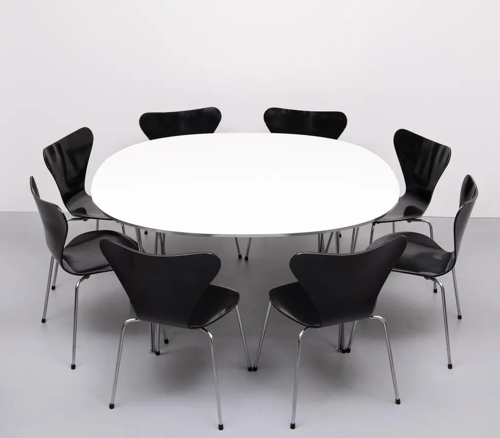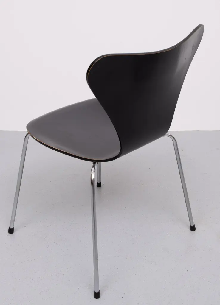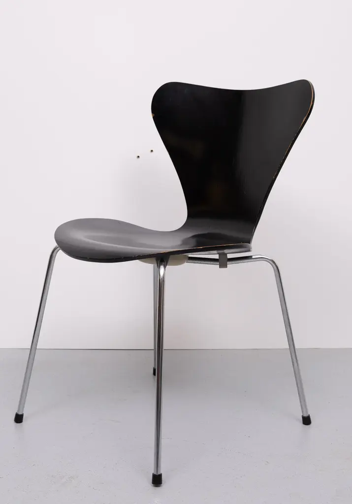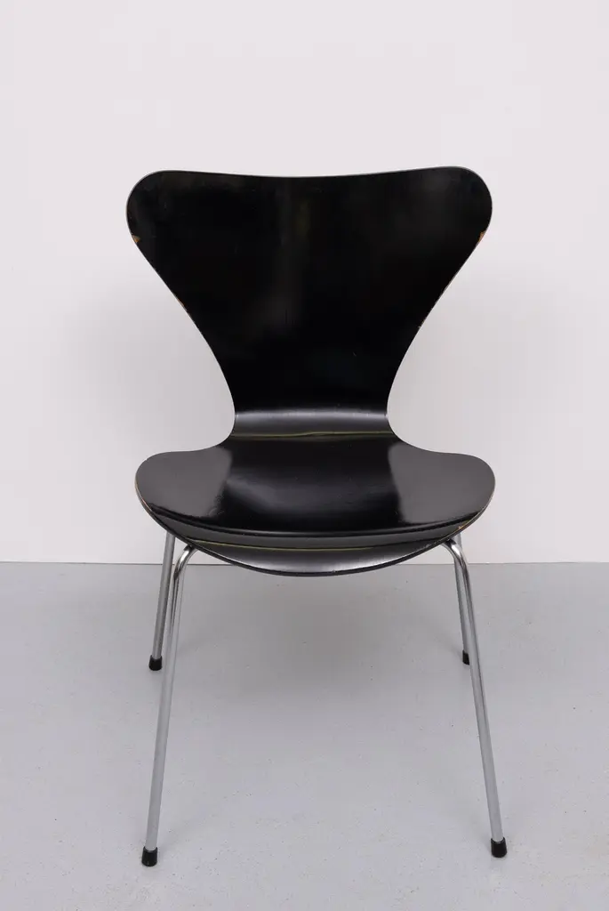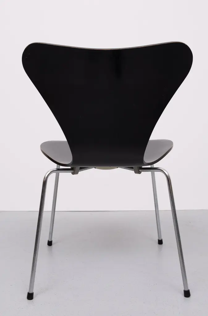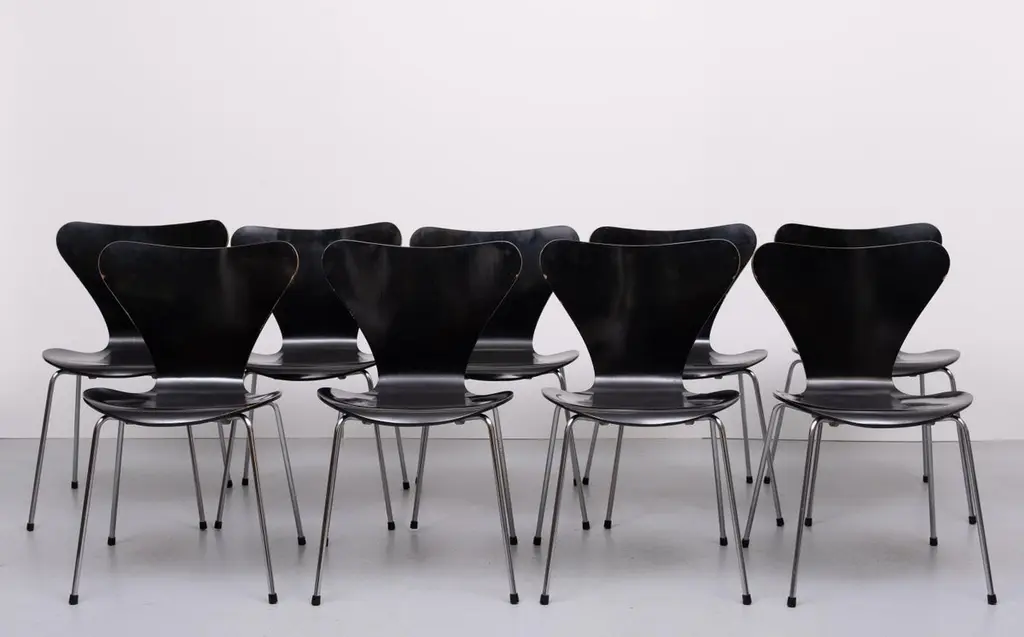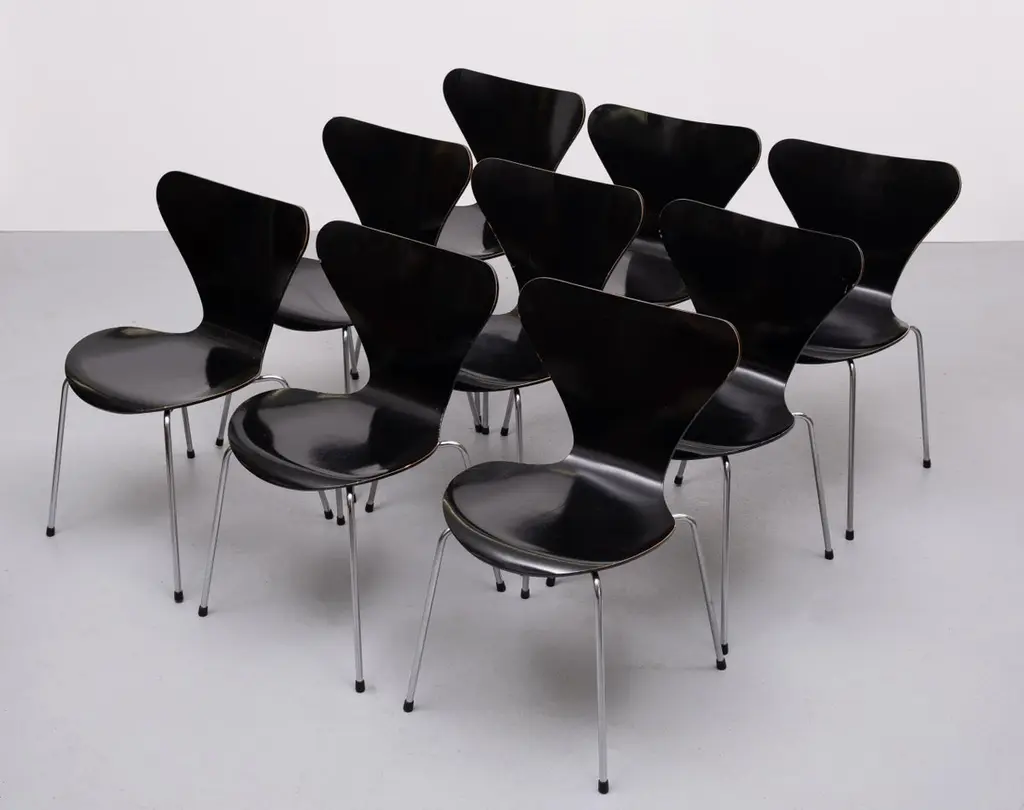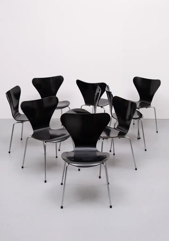 Vintage set of 9 butterfly chairs from 1970s The chairs, type 3107, were designed by Arne Jacobsen in 1955 for Fritz Hansen. This set of 9 chairs are stained black (original). The condition is good considering the age, some light traces of use appropriate to the age, I also have the ideal dining table to match .