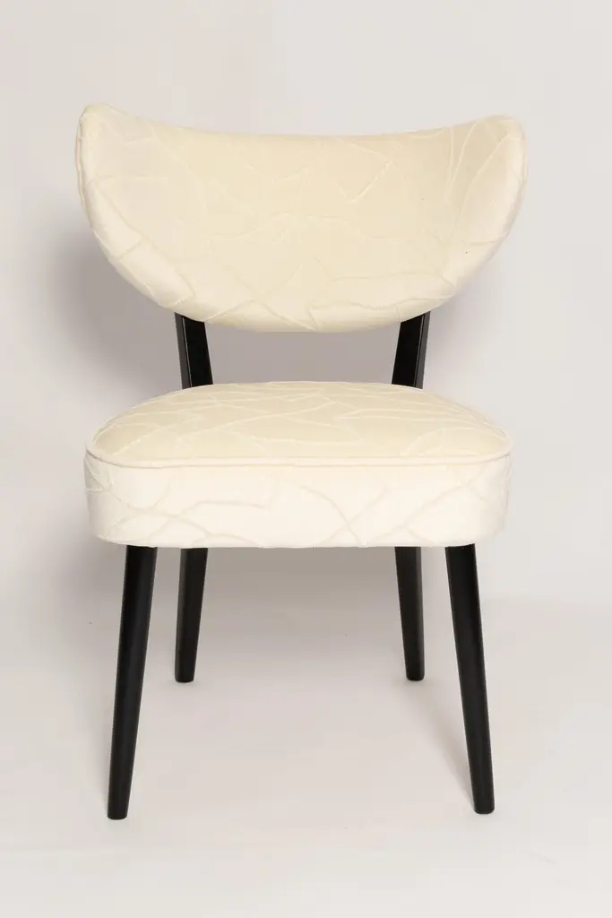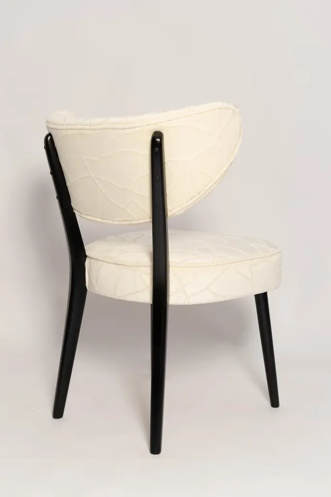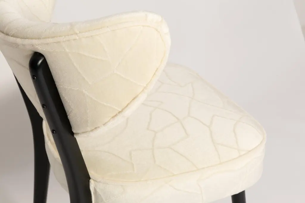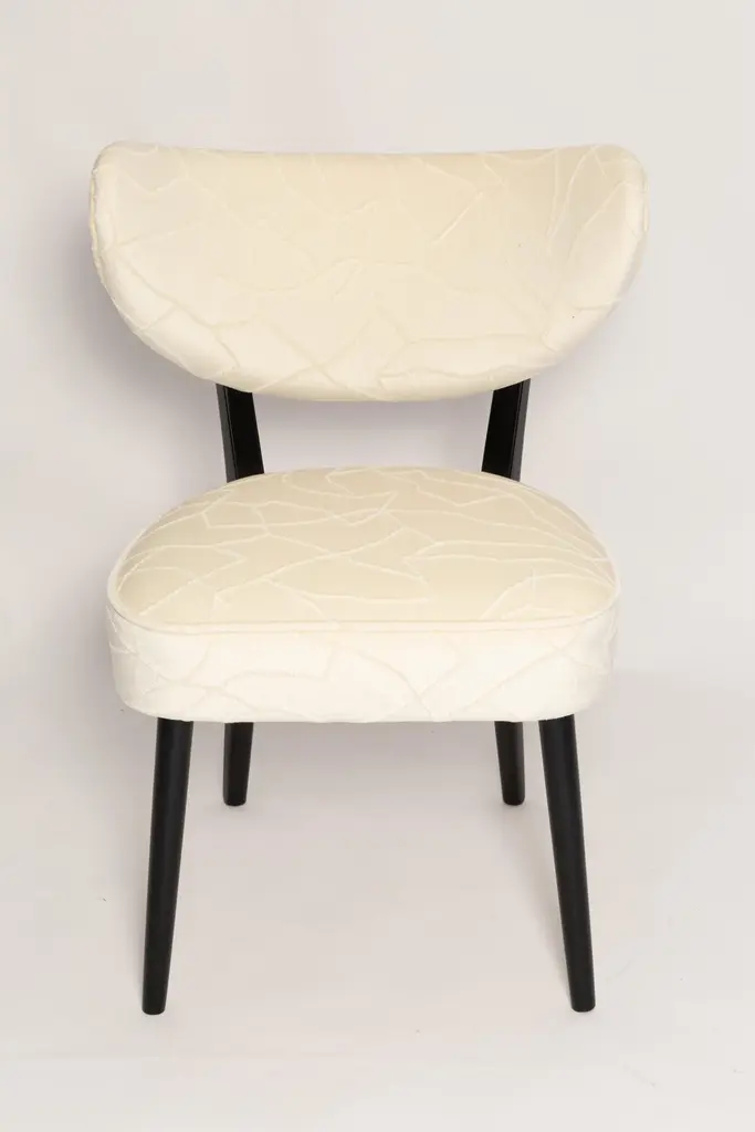 Springy, very comfortable and stabile dining seats.They are contemporary chairs inspired of 1960s style. They can be used as armchairs and dining chairs. Chair was designed by Vintola Studio, a Polish brand created by Ola Szewczul, designer of vintage interior architecture and photographer.Designed in 2023, produced from 2024 at the Vintola Studio Factory in Poland. Well crafted hand made product.The whole armchair is covered with high-quality italian fabric. Very beautiful and comfortable item! All options of fabrics and wood colors are possible to prepare. Change of dimensions are also possible.Please ask for more informations.About the fabric used in this option:A jacquard cracked motif branches out across a soft mohair velvet; an impacting graphic design, the spontaneous evocation of a primordial crack, a material rupture. The pile, long in places and short in others, alternates in different directions to delineate the widespread course of the fissures with a tone-on-tone play of reliefs. Sure to satisfy all tastes and interpreted in a range of shades inspired by nature, it lends itself to seating applications.Composition: 56% Cotton 44% MohairWeight: 777 g/mlMade in ItalyMartindale: 20000New Collection of Dedar Italy