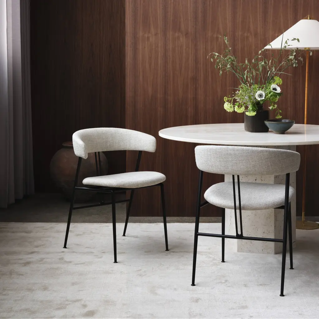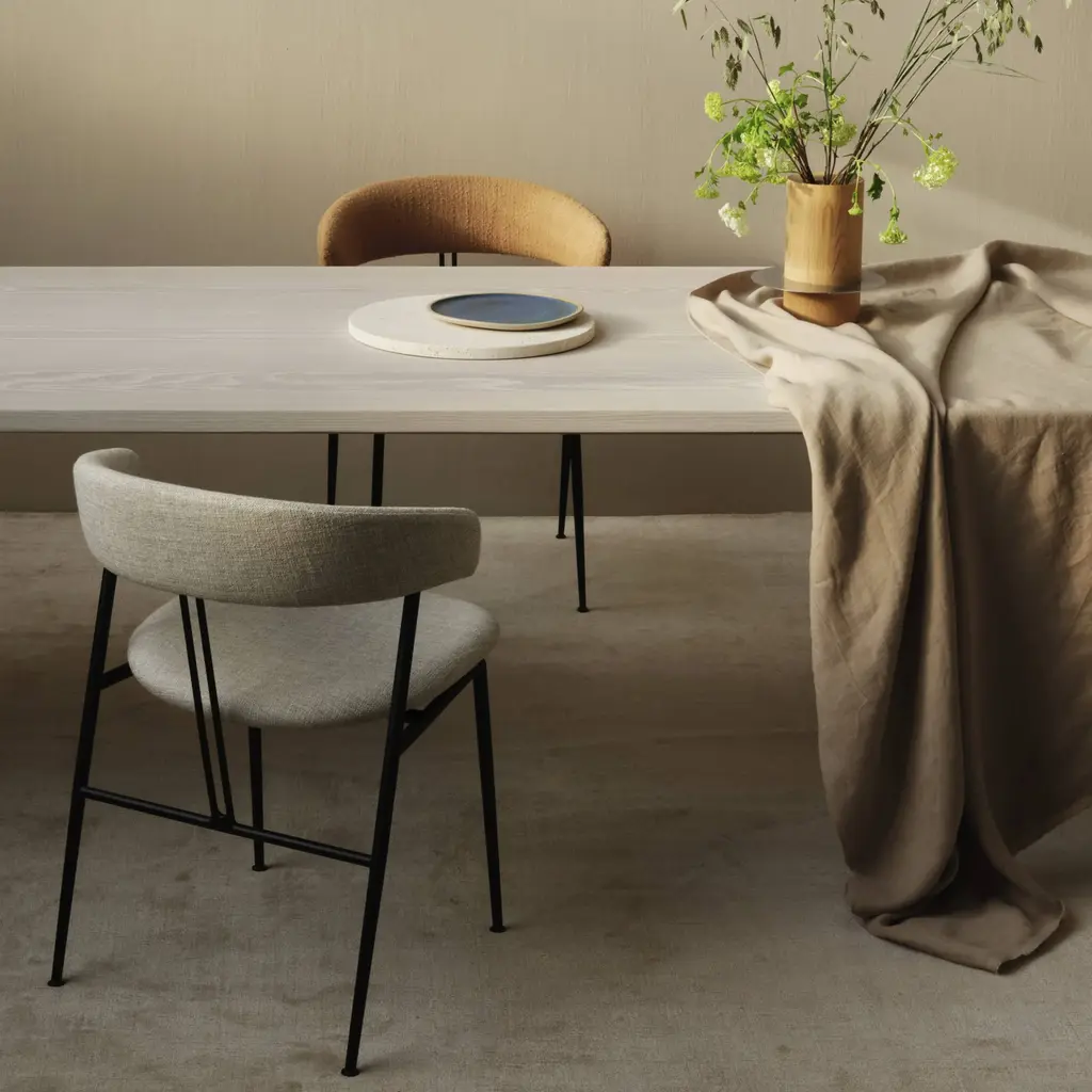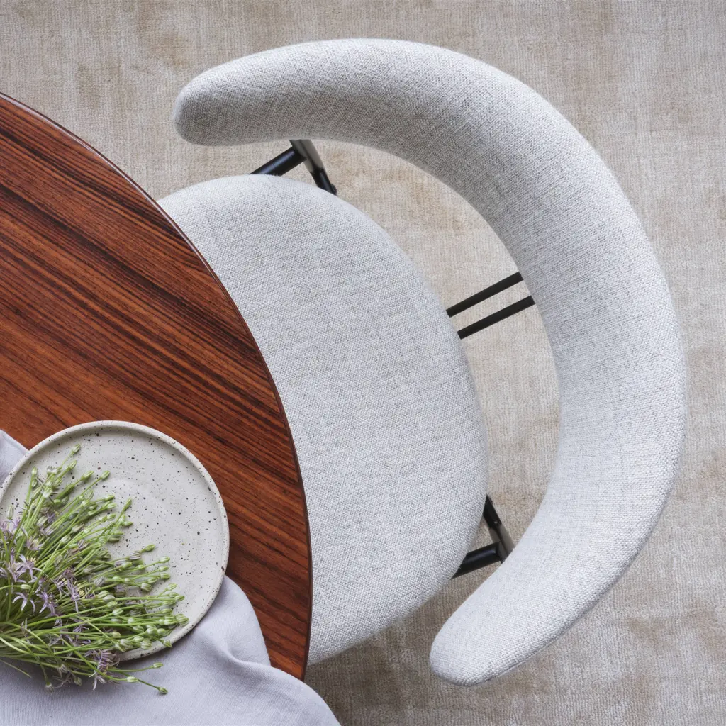 Full upholstery allows for a custom take on Danish-Italian duo GamFratesi’s unique Violin Chair. Two center parallel lines echo its namesake instruments’s strings, providing a decorative signature as well as support for the curved backrest. A generous seat resting on gently tapering, powder-coated steel legs completes the half-arm concept, designed to serve as a dining chair or an armchair without compromising on comfort.